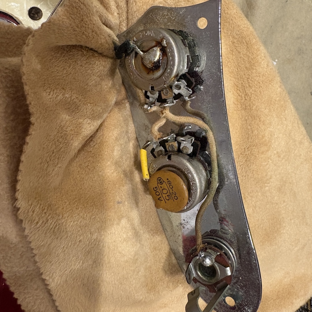 交換箇所といたしましては、ストリングリテイナー取付ビス、ナイロンスペーサー、ピックアップハイト調整ビス×1およびスプリング×1、セレクタースイッチ×2等となっており、主要パーツはオリジナルを維持しております。