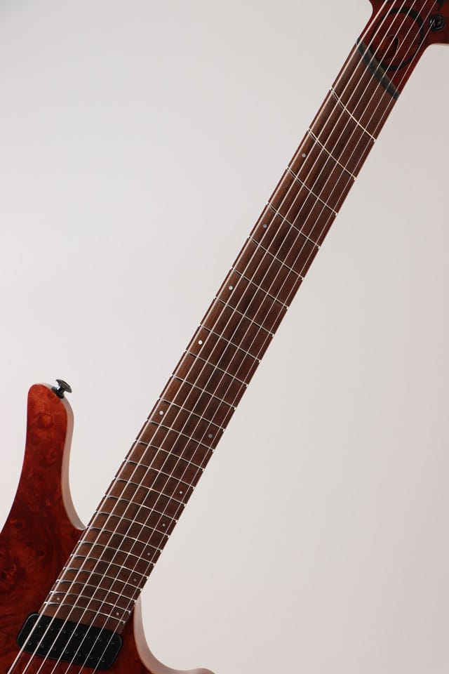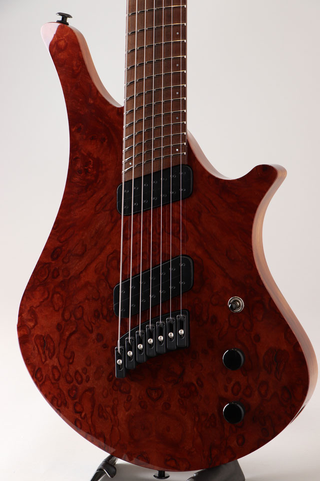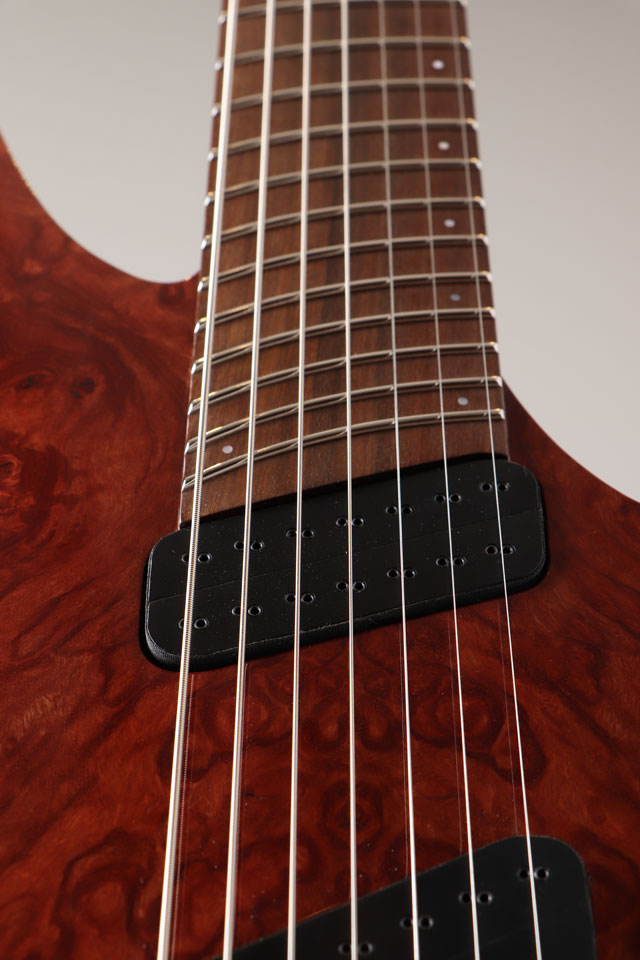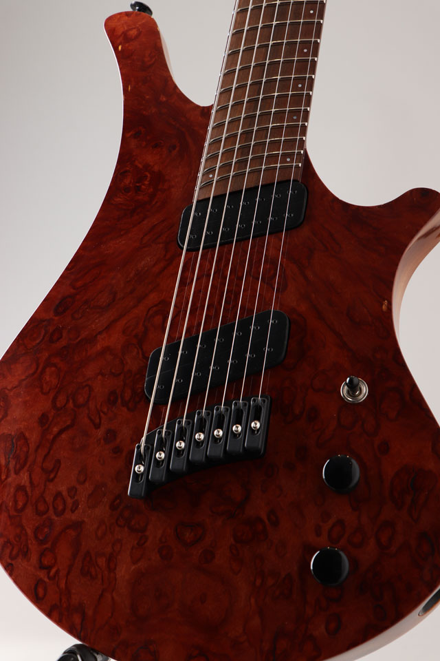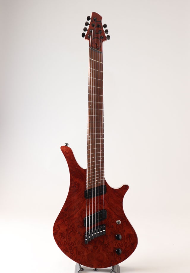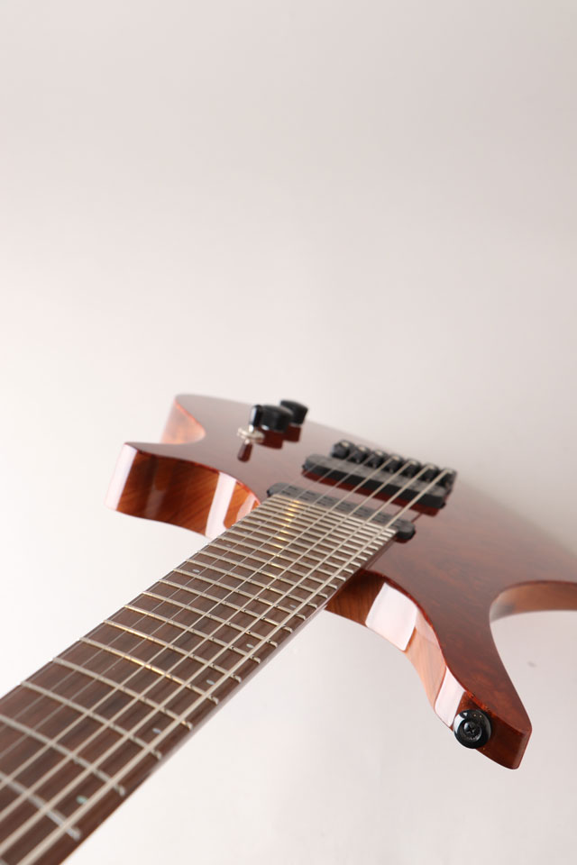Red Gum Burlをトップにあしらい、エキゾチックな魅力溢れる一本に仕上がっております。 本機は美しい曲線を描くマルチスケールを採用し、7弦らしい唸るようなローエンドまでぼやける事無く奏でる事が出来ます。