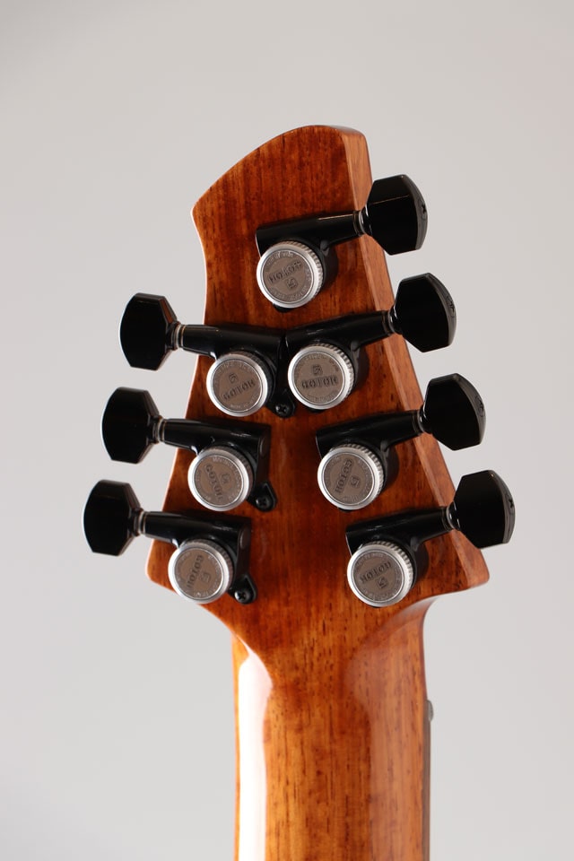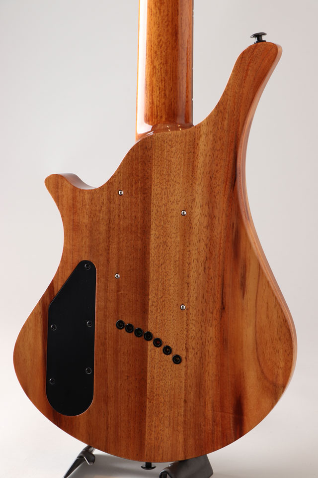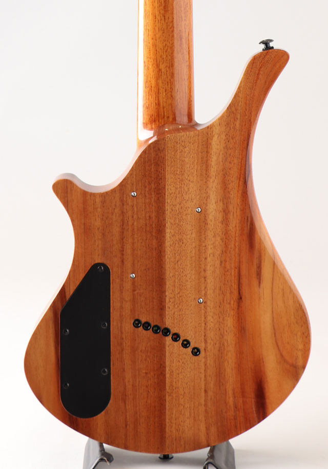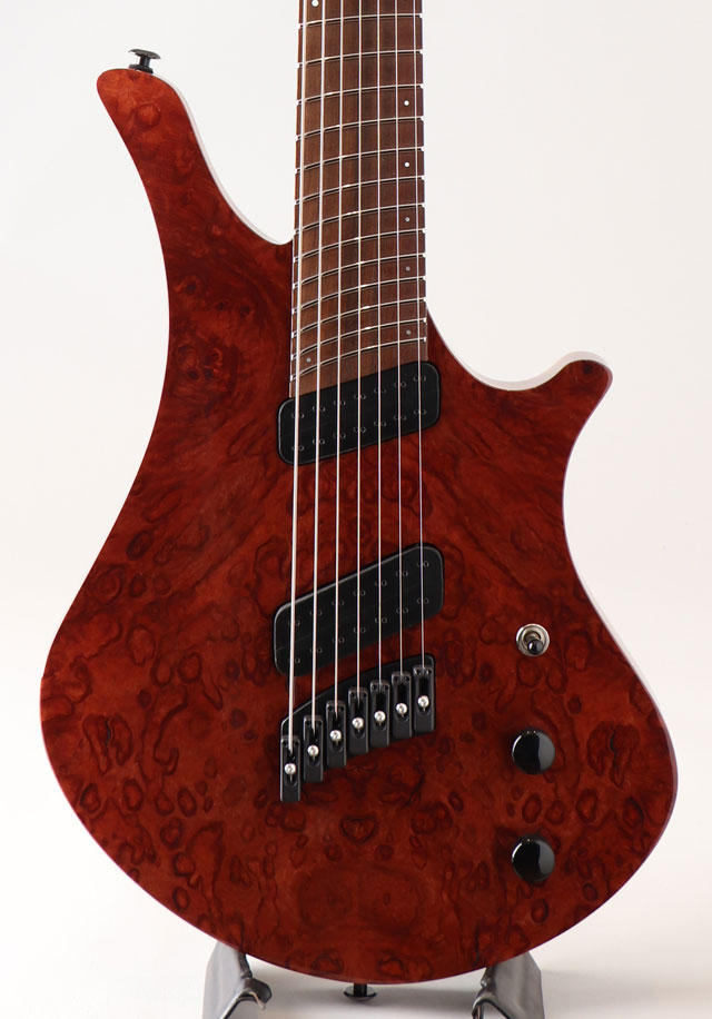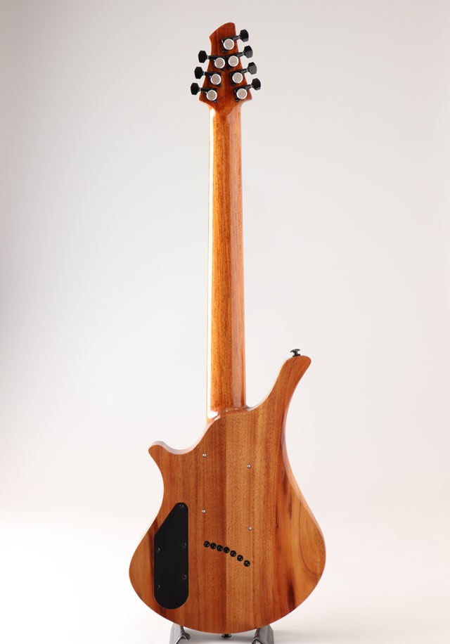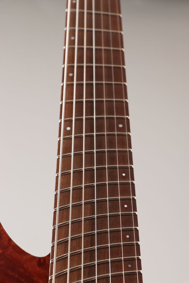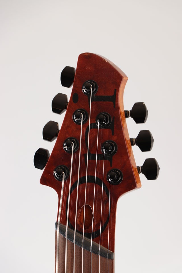 Red Gum Burlをトップにあしらい、エキゾチックな魅力溢れる一本に仕上がっております。 本機は美しい曲線を描くマルチスケールを採用し、7弦らしい唸るようなローエンドまでぼやける事無く奏でる事が出来ます。
