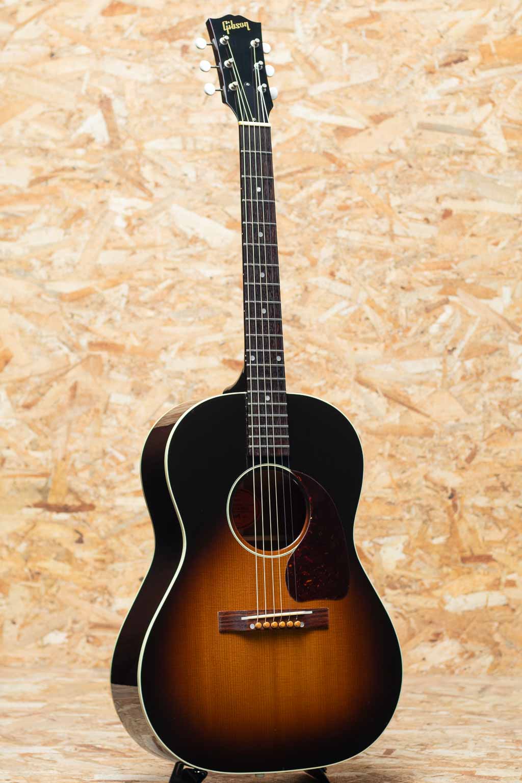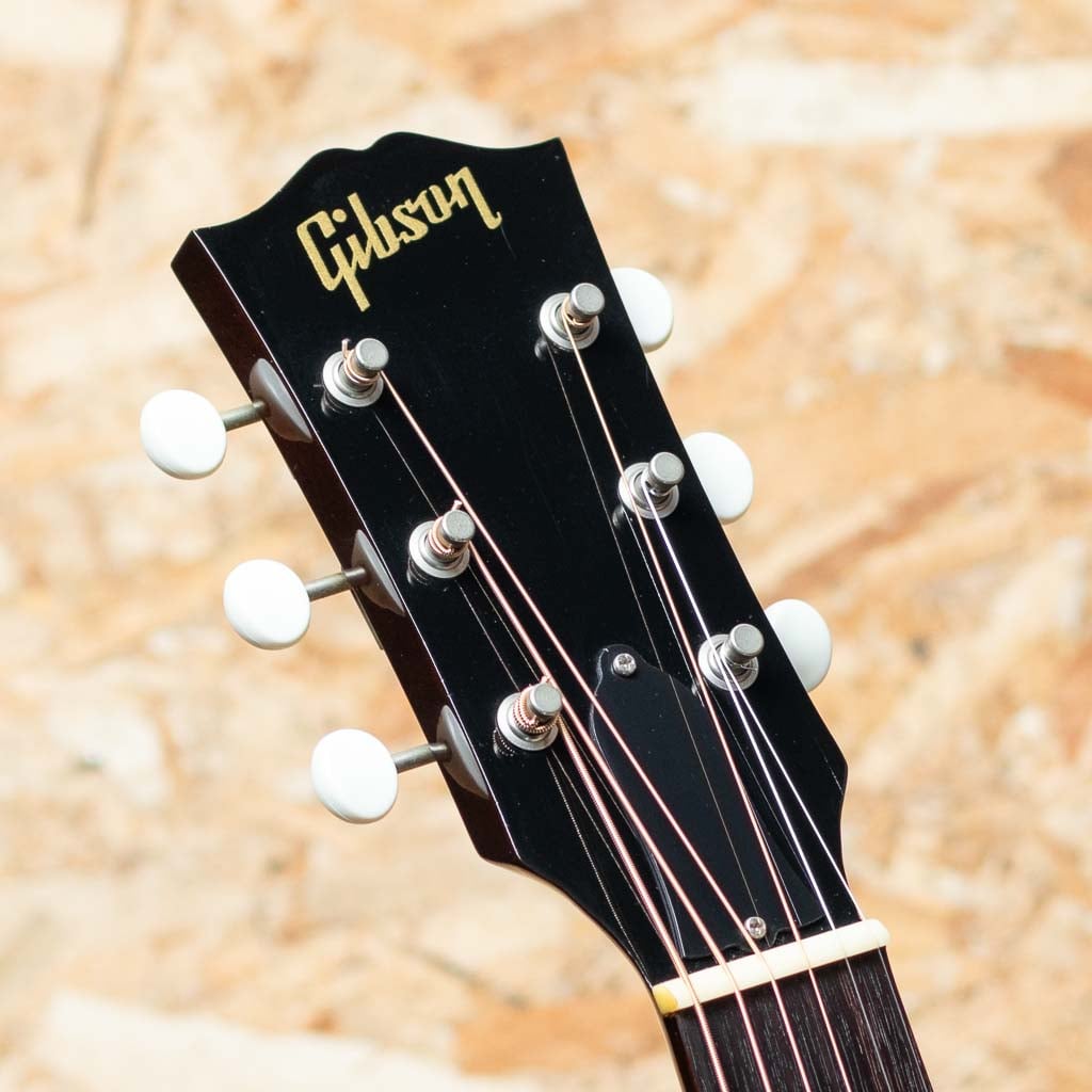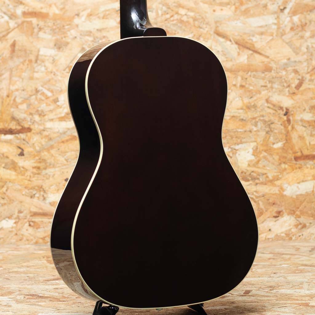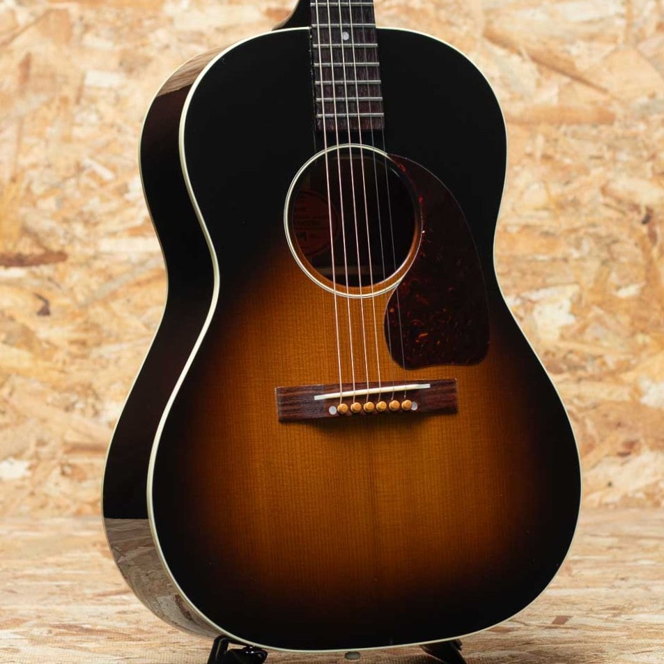 フラットトップにおける永遠の憧れ、ワーキングホースGibson"J-45"。J-45が1942年に生まれたのはあまりにも有名ですが、実はJ-45と同様のスペックを持ったJ-45のダウンサイズモデルのLG-2も同年に製造され始めた事は知る人ぞ知る所です。LG-2はJ-45を約14インチまでダウンサイジングした定番のモデル。当時は女性でも持ち運びやすいことから“レディース・ギター”と呼ばれていたこのモデルもギブソンを代表する機種のひとつといえます。本器は発表当初の四十年代のリイシューモデル”1940s LG-2”。2005年製中古品です。スプルーストップ、マホガニーサイド&バック、マホガニーネック、ローズウッド指板&レクタングルブリッジ、3連ペグ、パール指板ドット、オリジナルベッコウ柄スモールガード、シングルリングロゼッタ、1プライバインディング、ビンテージサンバーストカラーの仕様。1940年代のリイシューモデルではありますが、ネック形状は現代のニーズに合わせて調整されています。極太ネックではなく、やや丸みを帯びた形状で太さを感じさせず握り込みし易い印象です。カントリーブルースやラグタイムなど、アーリーアメリカンミュージックで雰囲気の出るチープで小気味のよい音ですが、ボディサイズの感覚以上にボリュームが豊かに響きますので、フィンガースタイルからストロークまで難なく使っていただけます。 ボディ全体に小傷など表面的な使用感、ヘッド裏先端に木部欠けがありますが、プレイコンディションも程度は良好です。軽やかで小気味よい反応を示す小ぶりなボディーが扱いやすく、小柄な方にもおすすめです。オリジナルハードケース付属。