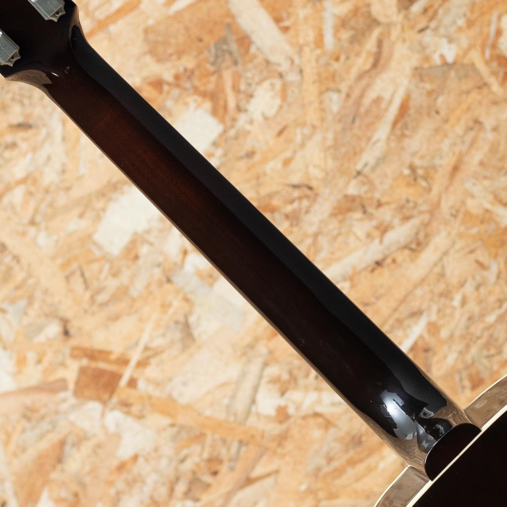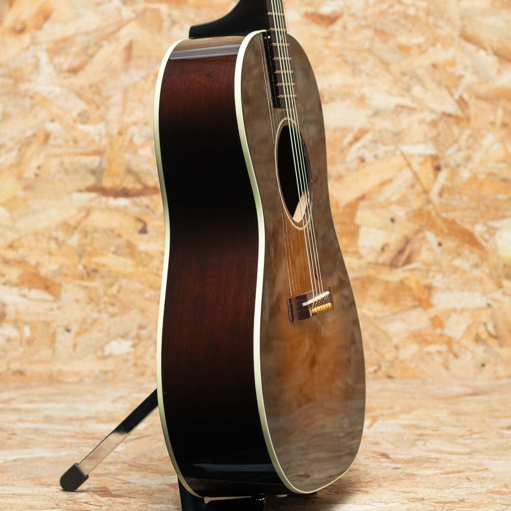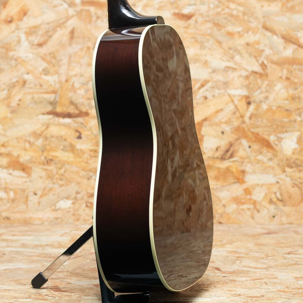 フラットトップにおける永遠の憧れ、ワーキングホースGibson"J-45"。J-45が1942年に生まれたのはあまりにも有名ですが、実はJ-45と同様のスペックを持ったJ-45のダウンサイズモデルのLG-2も同年に製造され始めた事は知る人ぞ知る所です。LG-2はJ-45を約14インチまでダウンサイジングした定番のモデル。当時は女性でも持ち運びやすいことから“レディース・ギター”と呼ばれていたこのモデルもギブソンを代表する機種のひとつといえます。本器は発表当初の四十年代のリイシューモデル”1940s LG-2”。2005年製中古品です。スプルーストップ、マホガニーサイド&バック、マホガニーネック、ローズウッド指板&レクタングルブリッジ、3連ペグ、パール指板ドット、オリジナルベッコウ柄スモールガード、シングルリングロゼッタ、1プライバインディング、ビンテージサンバーストカラーの仕様。1940年代のリイシューモデルではありますが、ネック形状は現代のニーズに合わせて調整されています。極太ネックではなく、やや丸みを帯びた形状で太さを感じさせず握り込みし易い印象です。カントリーブルースやラグタイムなど、アーリーアメリカンミュージックで雰囲気の出るチープで小気味のよい音ですが、ボディサイズの感覚以上にボリュームが豊かに響きますので、フィンガースタイルからストロークまで難なく使っていただけます。 ボディ全体に小傷など表面的な使用感、ヘッド裏先端に木部欠けがありますが、プレイコンディションも程度は良好です。軽やかで小気味よい反応を示す小ぶりなボディーが扱いやすく、小柄な方にもおすすめです。オリジナルハードケース付属。