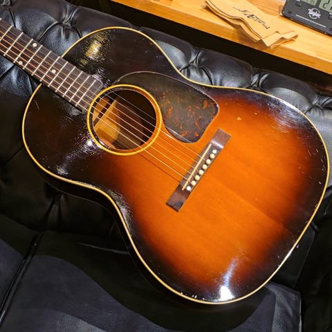 ジョン・レノンとジョージ・ハリスンがお揃いで入手したギター。ビートルズギアとしてあまりにも有名な機種"J-160E"。本器はビートルズが実際に使用していた1964年製モデルを再現した2004年製のモデル。スプルーストップ、マホガニーサイド&バック、マホガニーネック、ローズウッド指板&ブリッジ、アジャスタブルサドル、クルーソンタイプペグ(チューリップノブ)、パーロイドディッシュ指板インレイ、オリジナルピックガード、15フレットボディジョイント、ラダーブレイシング。ピックアップが搭載された世界で始めてのフラットトップ"CF-100"がアンサンブルの中でも音量で負けないようにと発表された年が1951年、基本コンセプトを受け継いだJ-160Eは1954年に発表されました。ちなみにビートルズが実際に使用していた1962年から1964年製の物は人気があり、コレクターズピースとして高額で取引されているほどです。ワンボリュームワントーンのP-90は太くて甘い音が出しやすい位置に搭載されています。生音が豊かなタイプのモデルではありませんが、生音でも味のあるサウンドを奏で、プラグイン時にも唯一の存在感を放つギターです。経年相応の使用感があり、トップにやや目立つ打痕がございます。全体的にウェザーチェックもしっかりと入っており、貫禄も十分。ネックの状態含めプレイコンディションも大変良好。ピックアップも問題なく動作します。オリジナルハードケース付属