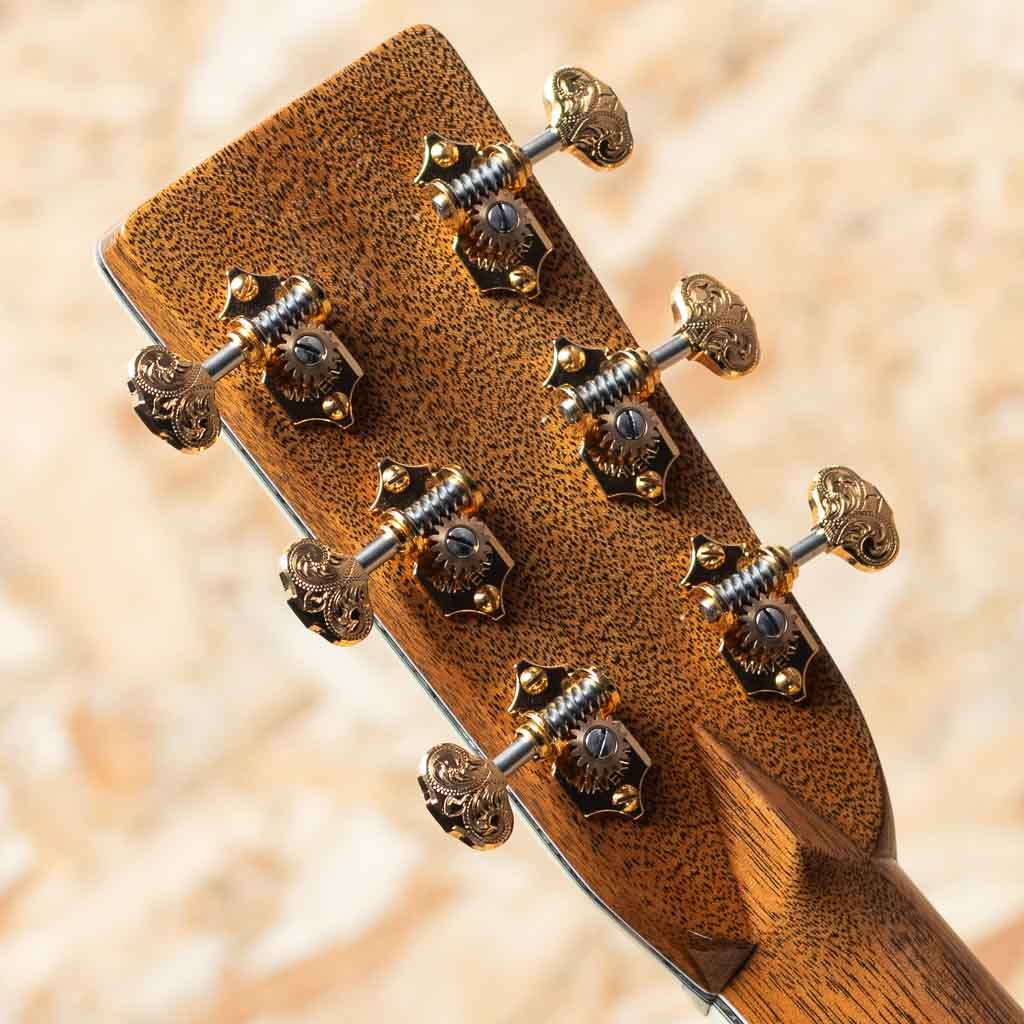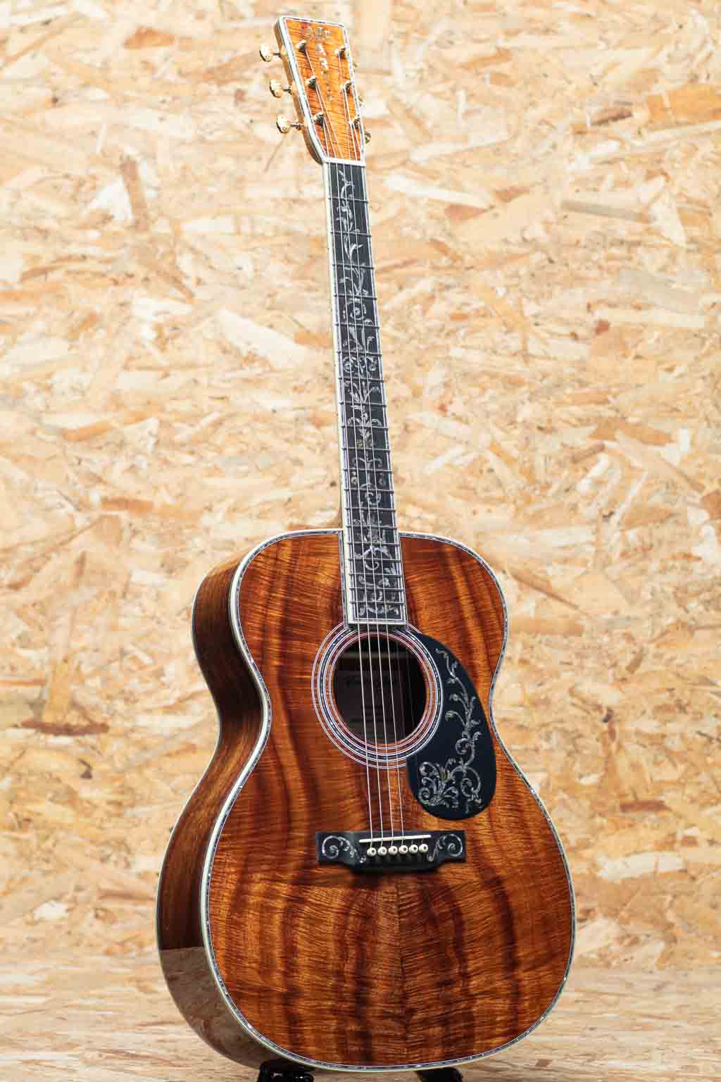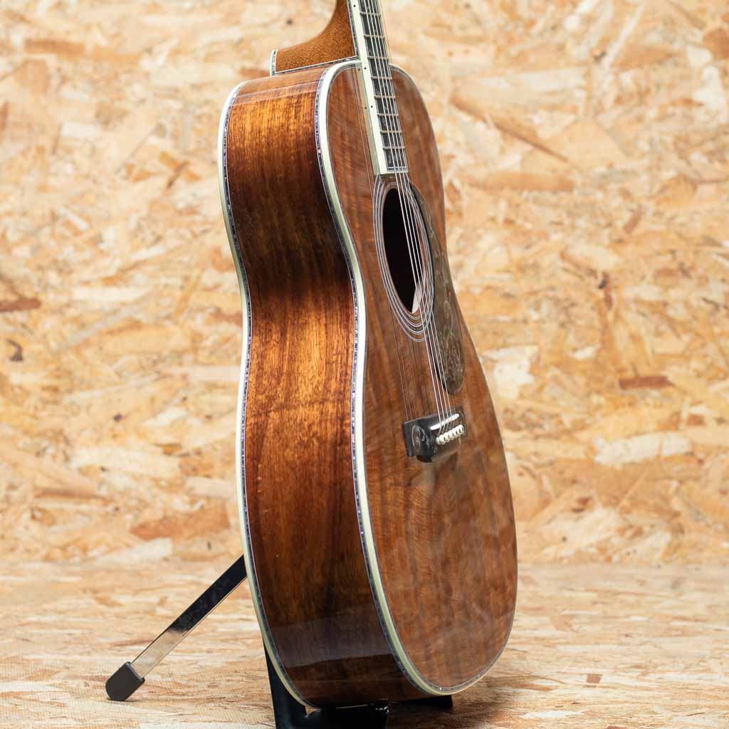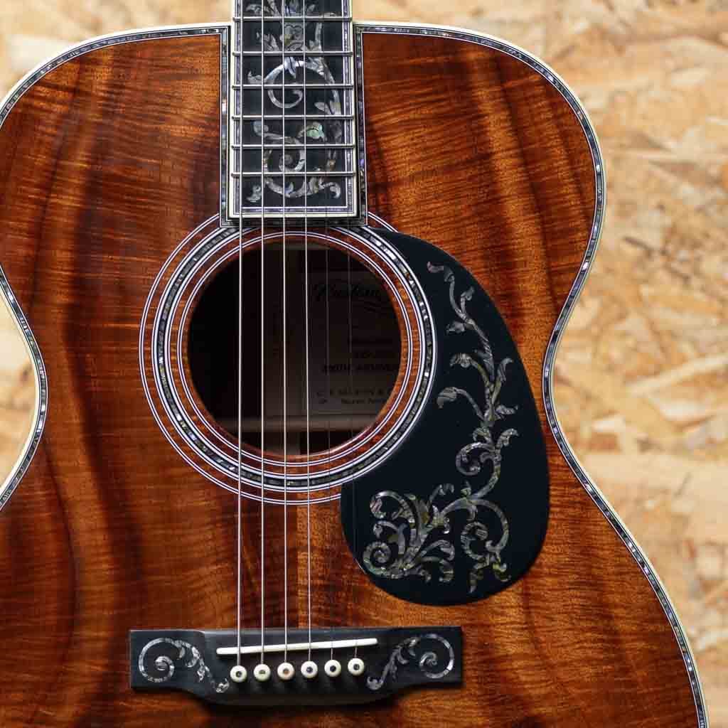 世界を代表するアコースティックギターブランド"MARTIN"。本器は三木楽器創業200周年を記念して特別に製作された"OOO-45K2 T.O.L."カスタムショップモデル。2023年、弊社スタッフが実際にマーティンファクトリーを訪問し、ボディ材をセレクト。1年半の年月を経て完成した大作です。トリプルオーボディの45スタイルをベースに、ファクトリーにて選定したプレミアムグレードのハイリーフレイムドコア材をボディ全面に採用。指板、ピックガードにツリーオブライフインレイを施し、ブリッジにはアイランドスクロールインレイ、そしてギター全体の随所にアバロンの装飾を施した豪華デラックス仕様。ヘッドには象徴的な縦ロゴが光り、ウェバリー製エングレイブドボタンのゴールドペグが存在感を放ちます。ネックは43mm幅、各部の接着にはニカワを採用、 仕上げは Thin Finish。見た目の美しさだけでなく、演奏性、サウンド面も追求した極上の1本。インナーラベルには"MIKIGAKKI 1825-1925 200TH. ANNIVERSARY"と特別な印字が施されております。マーティンカスタムショップの刺繍入りデラックスハードケース付き。ドレッドノートサイズモデルが2本、トリプルオーサイズが1本、合計3本のみ製作の三木楽器限定アニバーサリーモデルです。