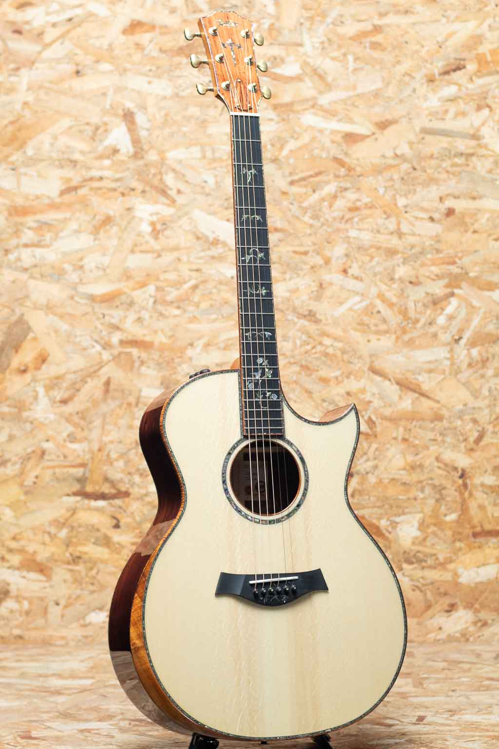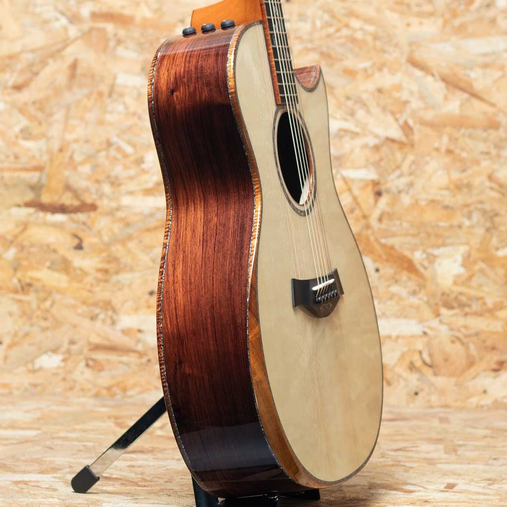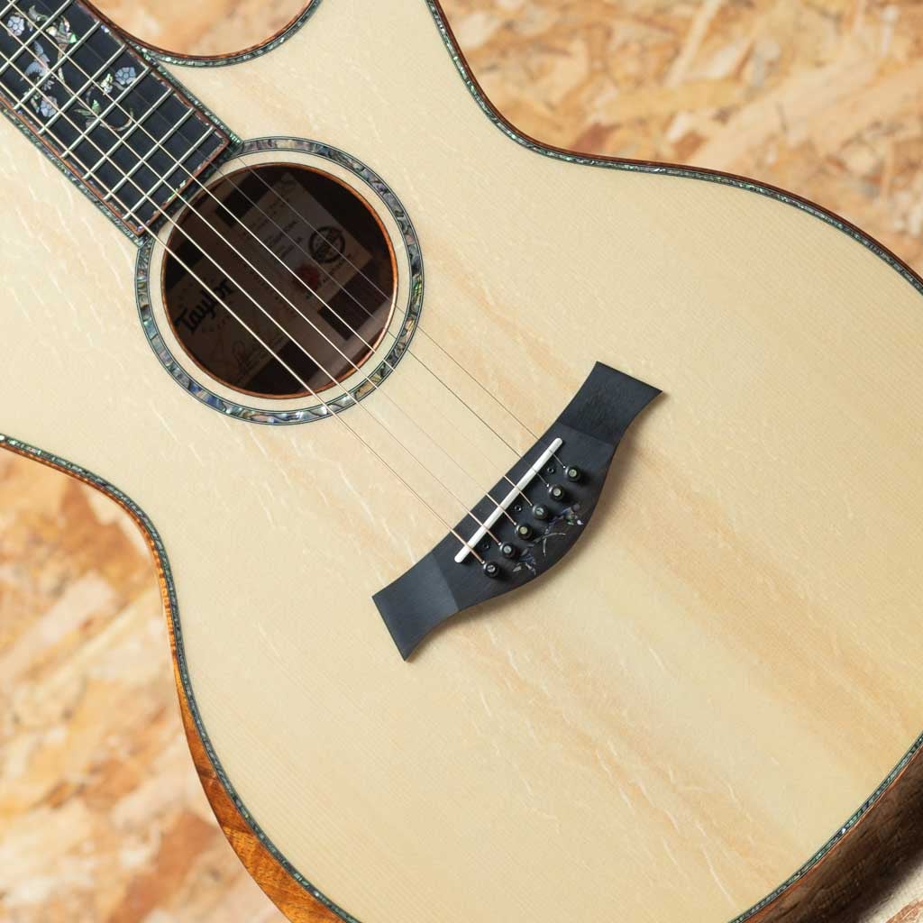 2000年代より急速に成長し画期的なギター構造を採用した事によって世界のトップアコースティックブランドに成長したテイラー社。国内をはじめ特に米国ではプロミュージシャン使用のシェアが高く、圧倒的な人気を誇っています。本器は三木楽器創業200周年を記念して弊社スタッフがテイラー社現地にてCEO兼、マスタールシアーであるアンディ・パワーズとともに材選定を行ったカスタムオーダー品”Grand Auditorium Custom”。グランドオーディトリアムボディ、プレミアムグレードアディロンダックスプルーストップ、ホンジュラスローズウッドサイド&バック、マホガニーネック、エボニー指板&ブリッジ、ベベルコンター、ホンジュラスローズウッドヘッド突板、フィギャードハワイアンコアバインディング、ゴトー510ゴールドペグ、ES2ピックアップ搭載。特にトップのアディロンダックスプルースにはなかなかお目にかかれないエキゾチックなベアクロウ杢の出ている美材を使用。ブレーシングにもアディロンダック・パフォーマンスブレーシング採用する事で剛性を高めるとともにトップとバックの可動域を最大限に向上させ、温かみのある音色に、ふくよかな中音域、伸びやかで美しい余韻を獲得。ヘッド、指板、ブリッジには、いずれも“Cindy”スタイルのデザインインレイが施され、ロゼッタやボディトリムの装飾に至るまで、パウア貝と白蝶貝を惜しみなく用いた、極めて華やかな仕様。音質、外観ともに高次元で調和する一本に仕上がりました。特別な1本をお求めの方に是非とも手にしていただきたい1本。ぜひご検討くださいませ。