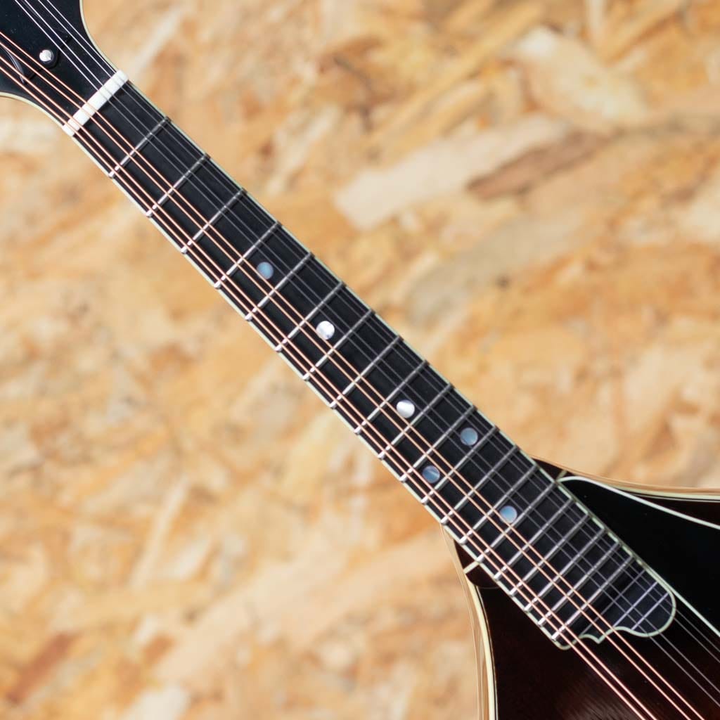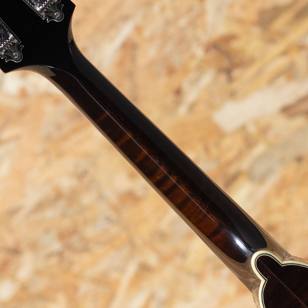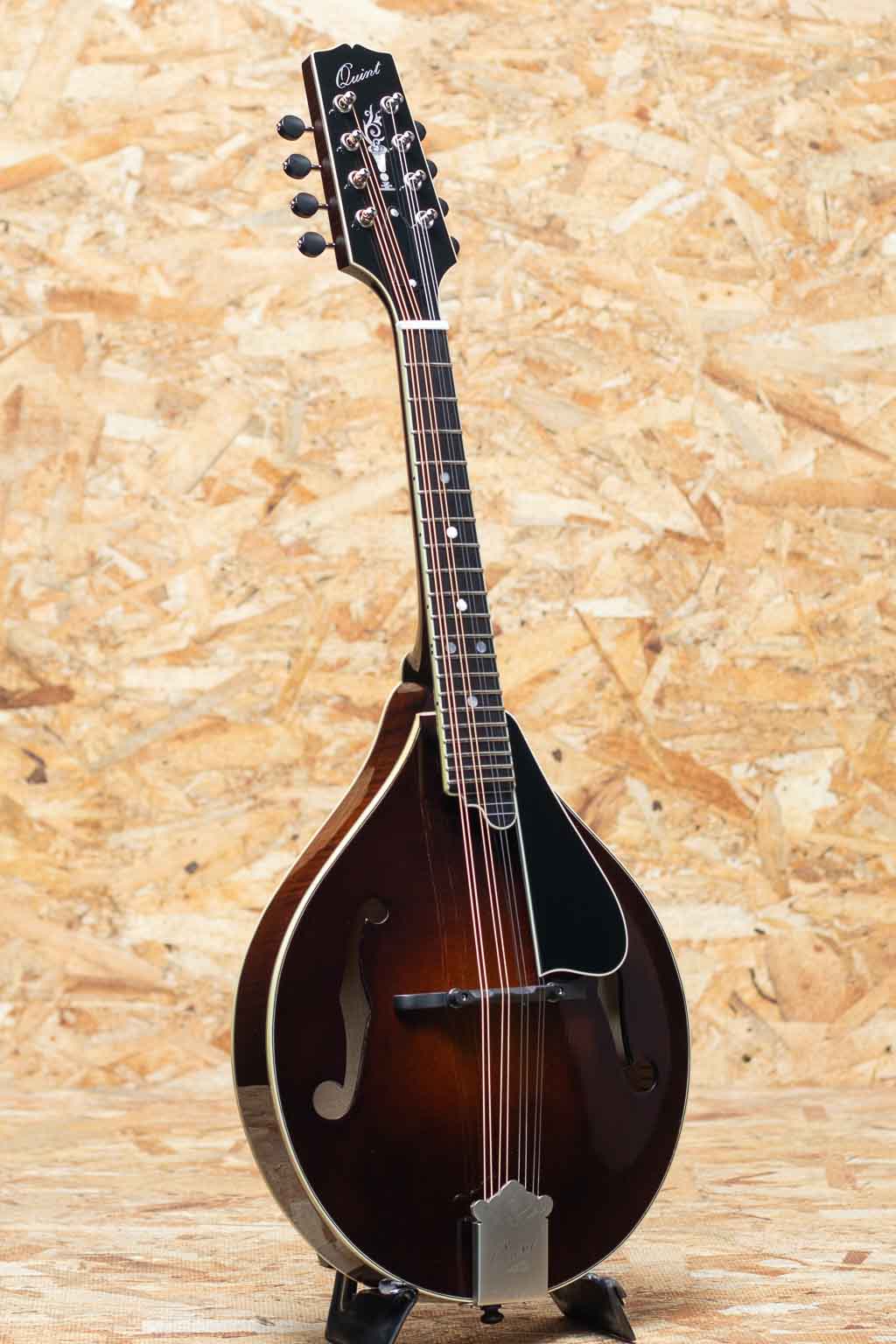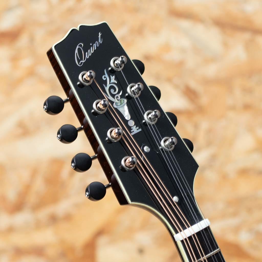 いくつかのメーカーで楽器製作を学び、その後North Field Mandolin立ち上げから製作に関わった後に独立する中国のMaster Luthier Qin Ji Duoが製作するQuint Mandolin。こちらはQT-A5 SB。今回入荷の一本はダークなサンバーストカラーです。削りだしイタリアンスプルーストップ、削りだしフィギャードスイスメイプルバック、スイスメイプルネック、プレミアムエボニーRadius指板、ミディアムサイズのフレット、後藤ペグ、アイボロイドバインディング、極薄のヴァーニッシュフィニッシュ、ウッドピックガード。Fタイプ同様の15FジョイントのStyle-Aでハイポジションまで操作性も良好です。Radius指板にミディアムフレット、指板エンドは短めで20fからスクープ加工が施されており抜群の操作性を誇ります。またトップのアーチの美しさや仕上がりの良さなど随所に高い工作制度とセンスの良さを感じます。鳴りを最大限に高め、よりウッディーな響きを引き出すヴァーニッシュフィニッシュです。艶のある美しいプレーン弦の響きと太く抜けるワウンド弦の力強さを併せ持つ素晴らしいフラットマンドリンです。この仕上げ、このクオリティーをもちこの価格は他ではまず見られません。フラマン初心者の方からハードユーザーまでジャンルを問わず使えるオールラウンダーなフラマンをお探しの方におすすめです。ファイバーケース付属