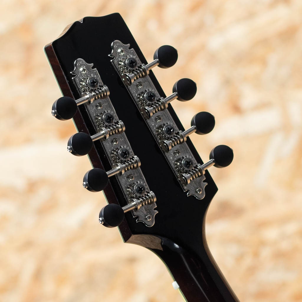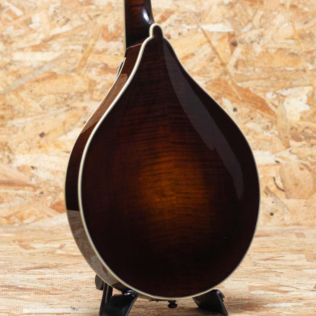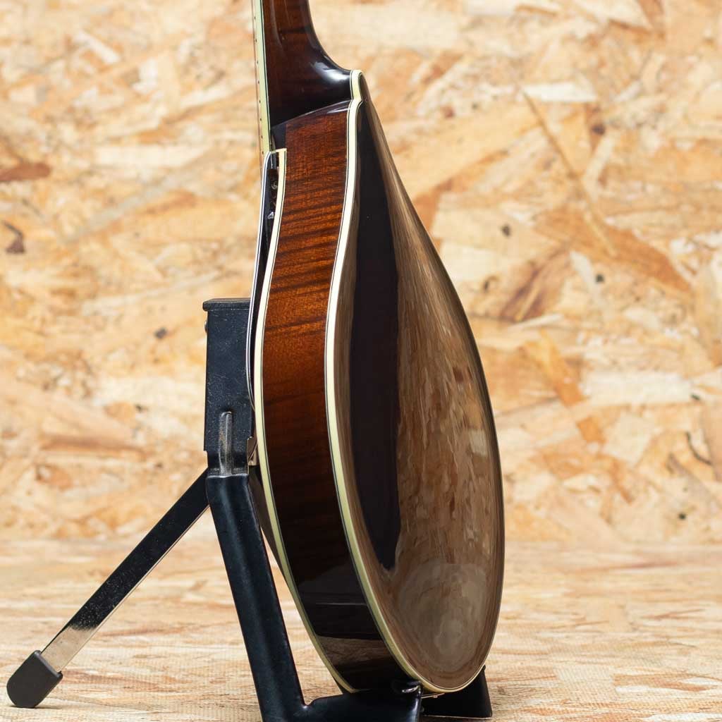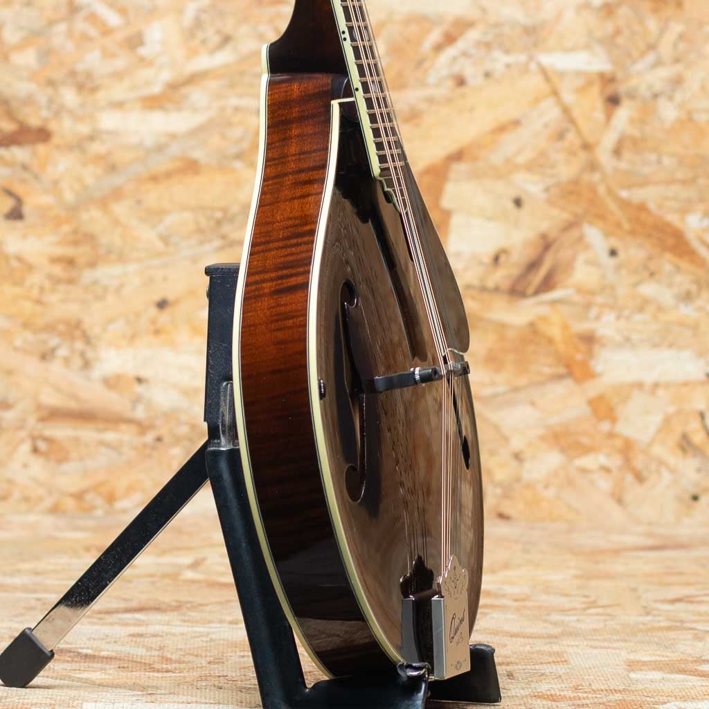 いくつかのメーカーで楽器製作を学び、その後North Field Mandolin立ち上げから製作に関わった後に独立する中国のMaster Luthier Qin Ji Duoが製作するQuint Mandolin。こちらはQT-A5 SB。今回入荷の一本はダークなサンバーストカラーです。削りだしイタリアンスプルーストップ、削りだしフィギャードスイスメイプルバック、スイスメイプルネック、プレミアムエボニーRadius指板、ミディアムサイズのフレット、後藤ペグ、アイボロイドバインディング、極薄のヴァーニッシュフィニッシュ、ウッドピックガード。Fタイプ同様の15FジョイントのStyle-Aでハイポジションまで操作性も良好です。Radius指板にミディアムフレット、指板エンドは短めで20fからスクープ加工が施されており抜群の操作性を誇ります。またトップのアーチの美しさや仕上がりの良さなど随所に高い工作制度とセンスの良さを感じます。鳴りを最大限に高め、よりウッディーな響きを引き出すヴァーニッシュフィニッシュです。艶のある美しいプレーン弦の響きと太く抜けるワウンド弦の力強さを併せ持つ素晴らしいフラットマンドリンです。この仕上げ、このクオリティーをもちこの価格は他ではまず見られません。フラマン初心者の方からハードユーザーまでジャンルを問わず使えるオールラウンダーなフラマンをお探しの方におすすめです。ファイバーケース付属