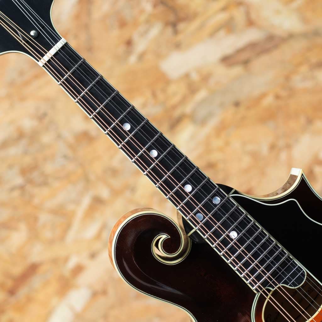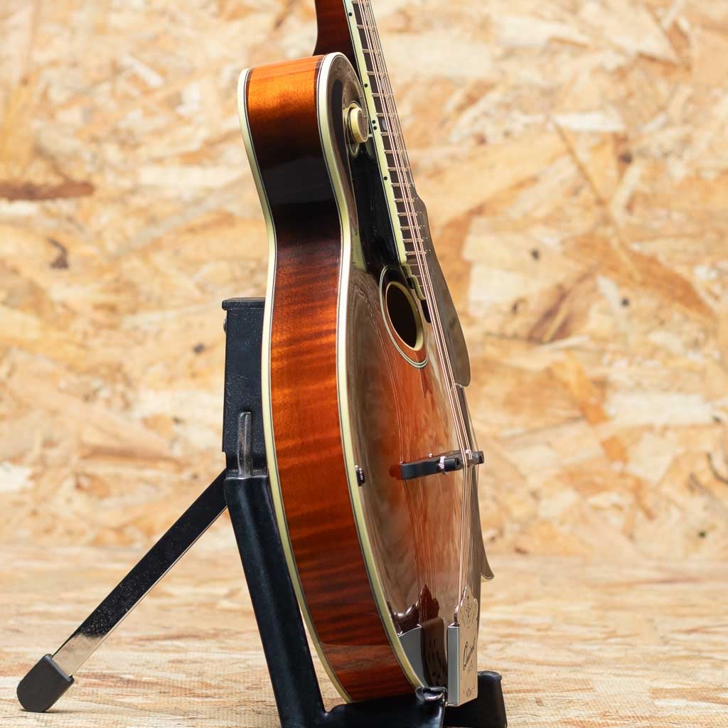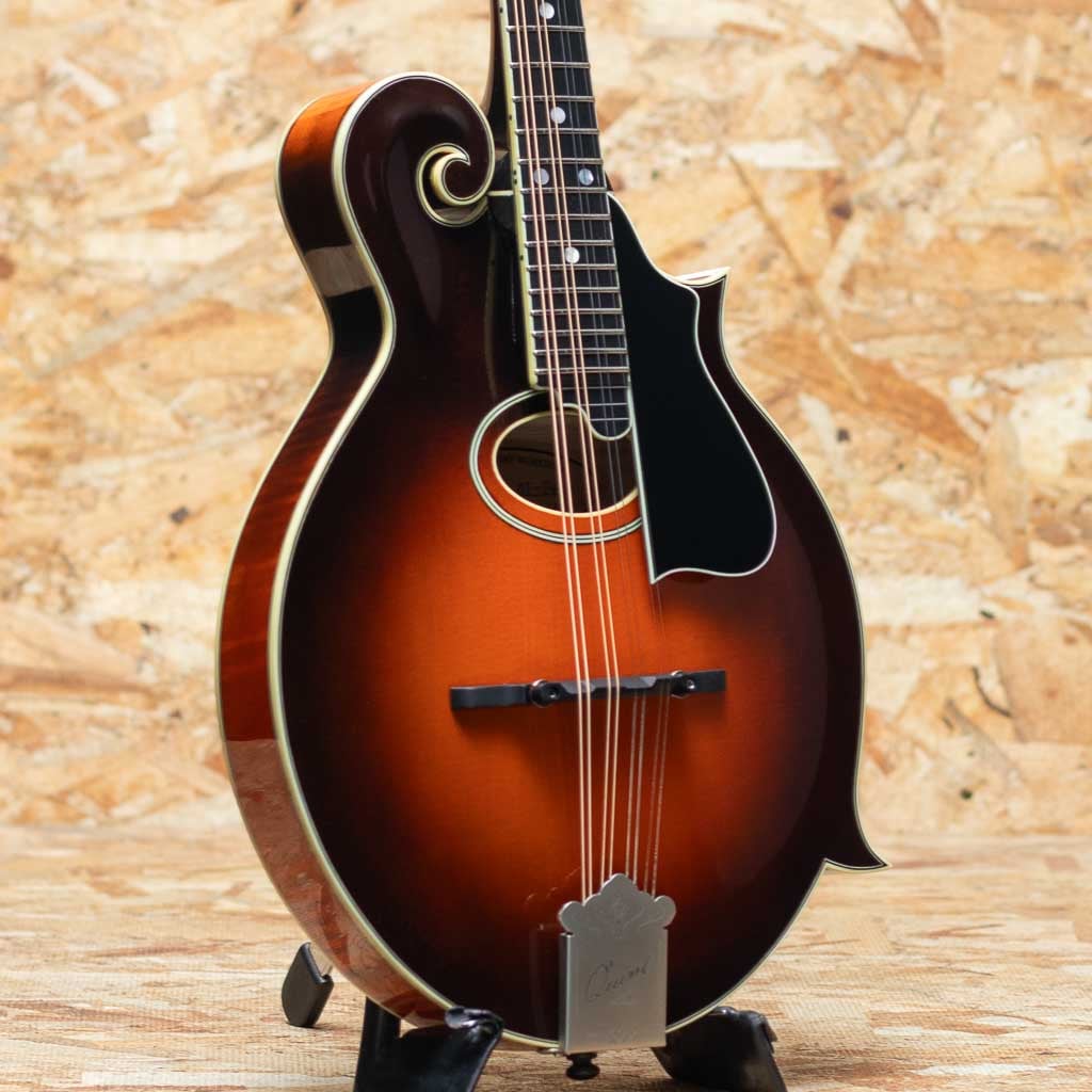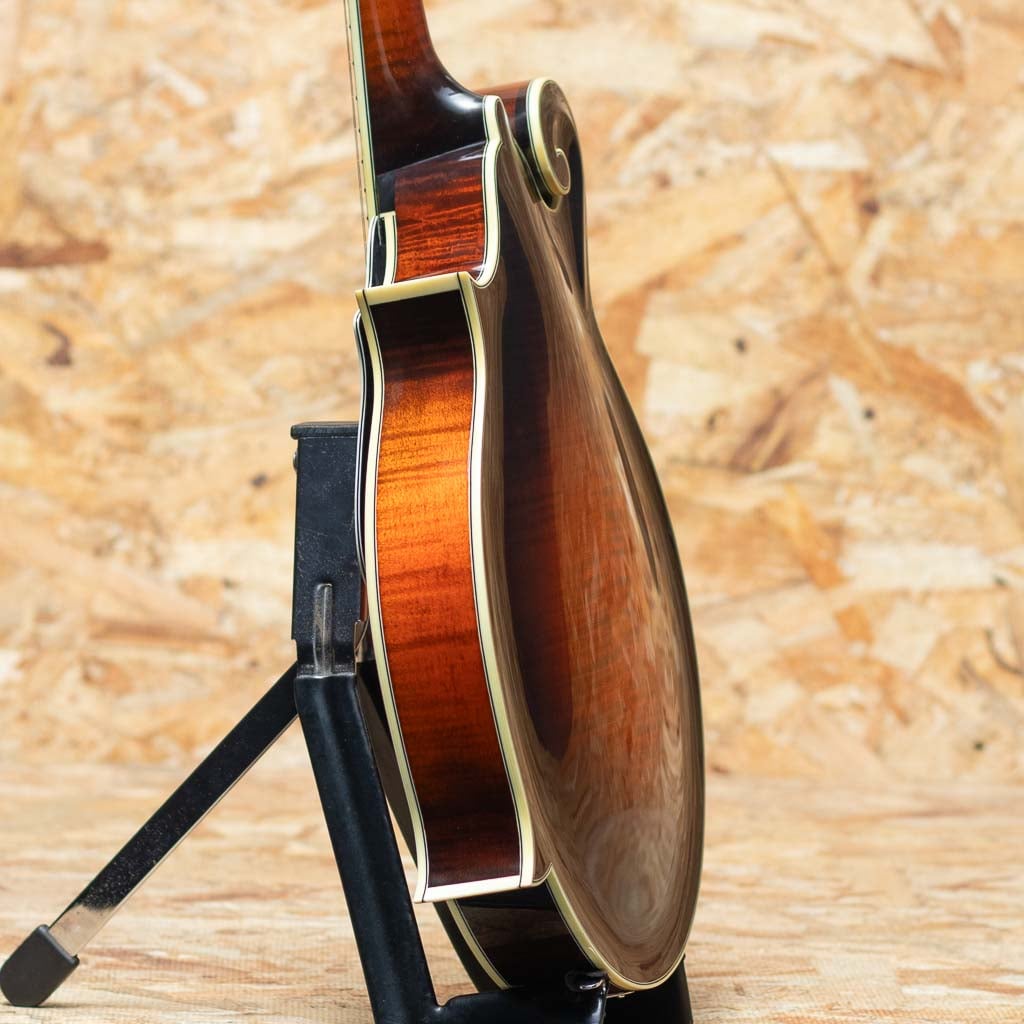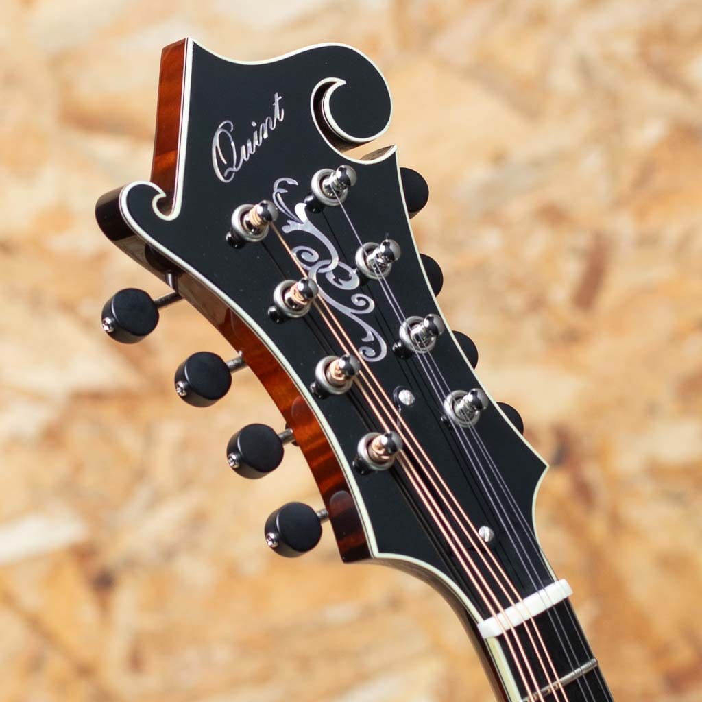 いくつかのメーカーで楽器製作を学び、その後North Field Mandolin立ち上げから製作に関わった後に独立する中国のMaster Luthier Qin Ji Duoが製作するQuint Mandolin。こちらは新たにネックを12Fジョイントに変更し、それによりオーバルホールの位置も後ろへ変更し、よりビンテージライクなビジュアルとサウンドへ変更したQuint QT-F4。印象的なオーバルホール、プレミアムイタリアンスプルーストップ、プレミアムスイスタイガーメイプルバック、エボニー指板&ブリッジ、後藤ペグ、アイボロイドバインディング、セラックバーニッシュ仕上げです。手作業による削りだしの美しいアーチドトップ、オリジナルのフローティングピックガードなど高い工作精度とセンスを感じさせてくれます。ソフトVシェイプネックにRadius指板、指板エンドのスクープ加工と操作性を高めた仕様で大変弾きやすく感じます。また大変手間のかかるセラックバーニッシュフィニッシュの為大変繊細ですが、その分ウッディーな鳴りに非常に貢献しており、全域にわたり抜けよく、ダイレクトに箱鳴り感を感じてもらえます。12fジョイントのオーバルホールはFタイプのボディーながら奥行きのある深いリバーブ感、甘く艶やなトーンが美しいモデルです。アイシッリュやフォーク、オールドタイミーな音楽とのマッチングがよいでしょう。グラスファイバーケース付属