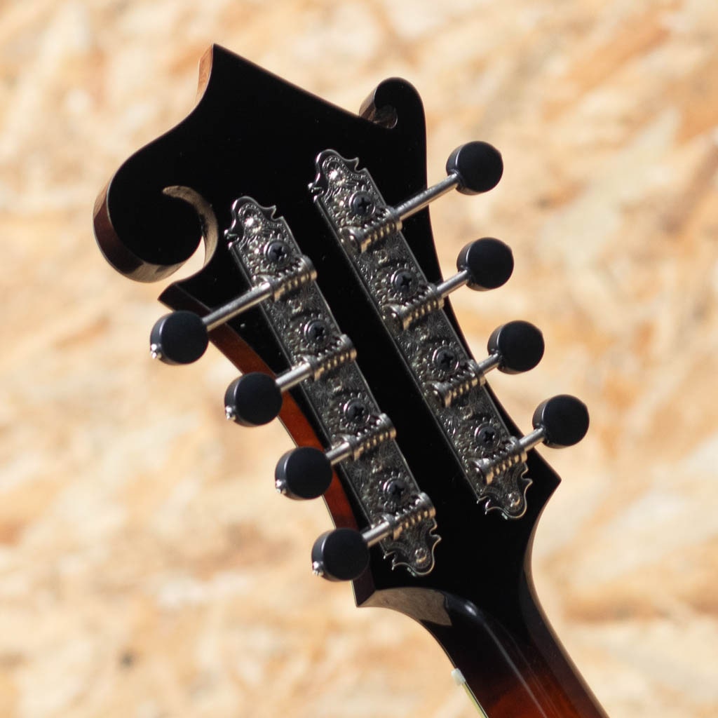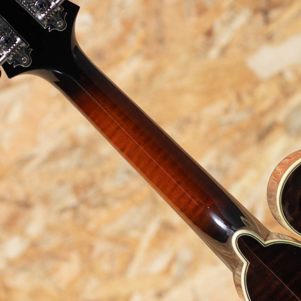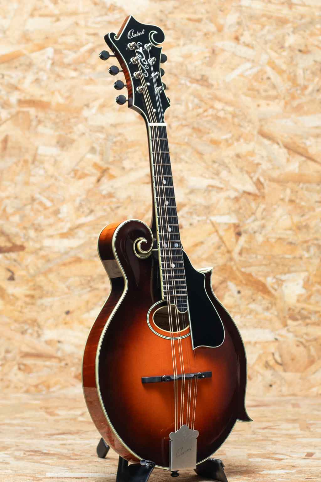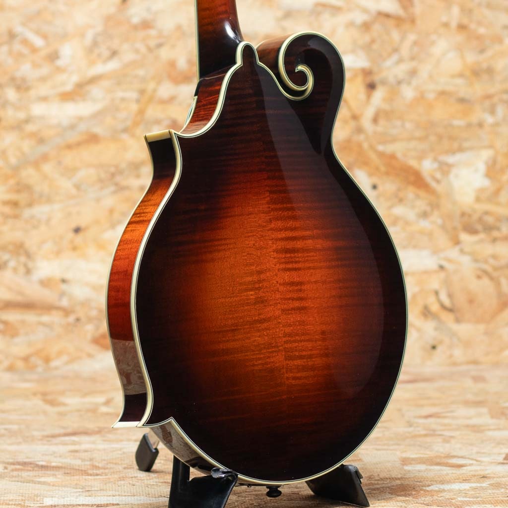 いくつかのメーカーで楽器製作を学び、その後North Field Mandolin立ち上げから製作に関わった後に独立する中国のMaster Luthier Qin Ji Duoが製作するQuint Mandolin。こちらは新たにネックを12Fジョイントに変更し、それによりオーバルホールの位置も後ろへ変更し、よりビンテージライクなビジュアルとサウンドへ変更したQuint QT-F4。印象的なオーバルホール、プレミアムイタリアンスプルーストップ、プレミアムスイスタイガーメイプルバック、エボニー指板&ブリッジ、後藤ペグ、アイボロイドバインディング、セラックバーニッシュ仕上げです。手作業による削りだしの美しいアーチドトップ、オリジナルのフローティングピックガードなど高い工作精度とセンスを感じさせてくれます。ソフトVシェイプネックにRadius指板、指板エンドのスクープ加工と操作性を高めた仕様で大変弾きやすく感じます。また大変手間のかかるセラックバーニッシュフィニッシュの為大変繊細ですが、その分ウッディーな鳴りに非常に貢献しており、全域にわたり抜けよく、ダイレクトに箱鳴り感を感じてもらえます。12fジョイントのオーバルホールはFタイプのボディーながら奥行きのある深いリバーブ感、甘く艶やなトーンが美しいモデルです。アイシッリュやフォーク、オールドタイミーな音楽とのマッチングがよいでしょう。グラスファイバーケース付属