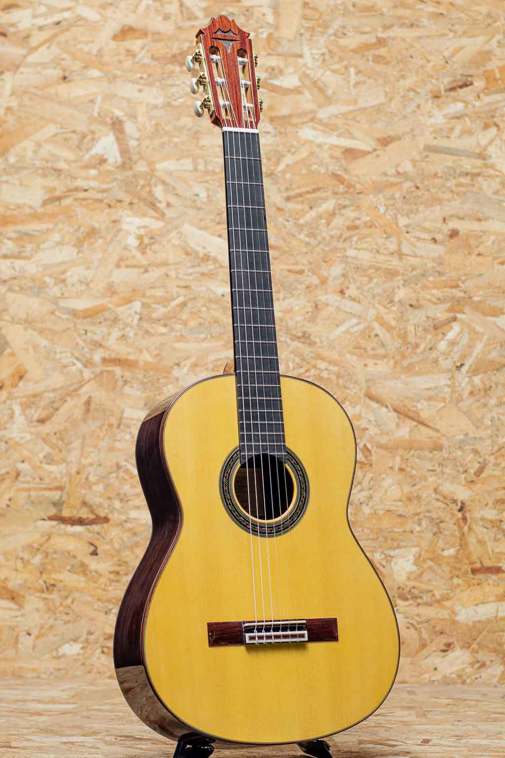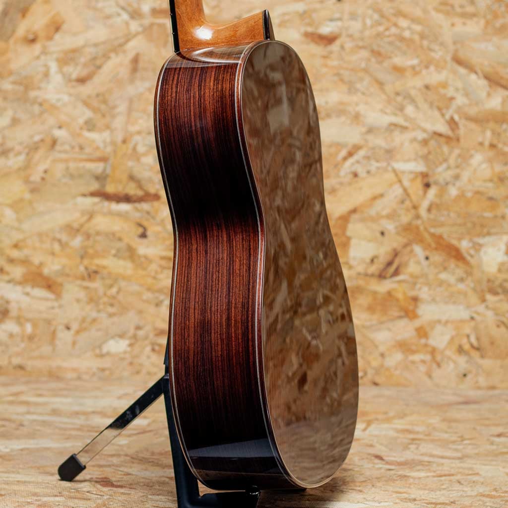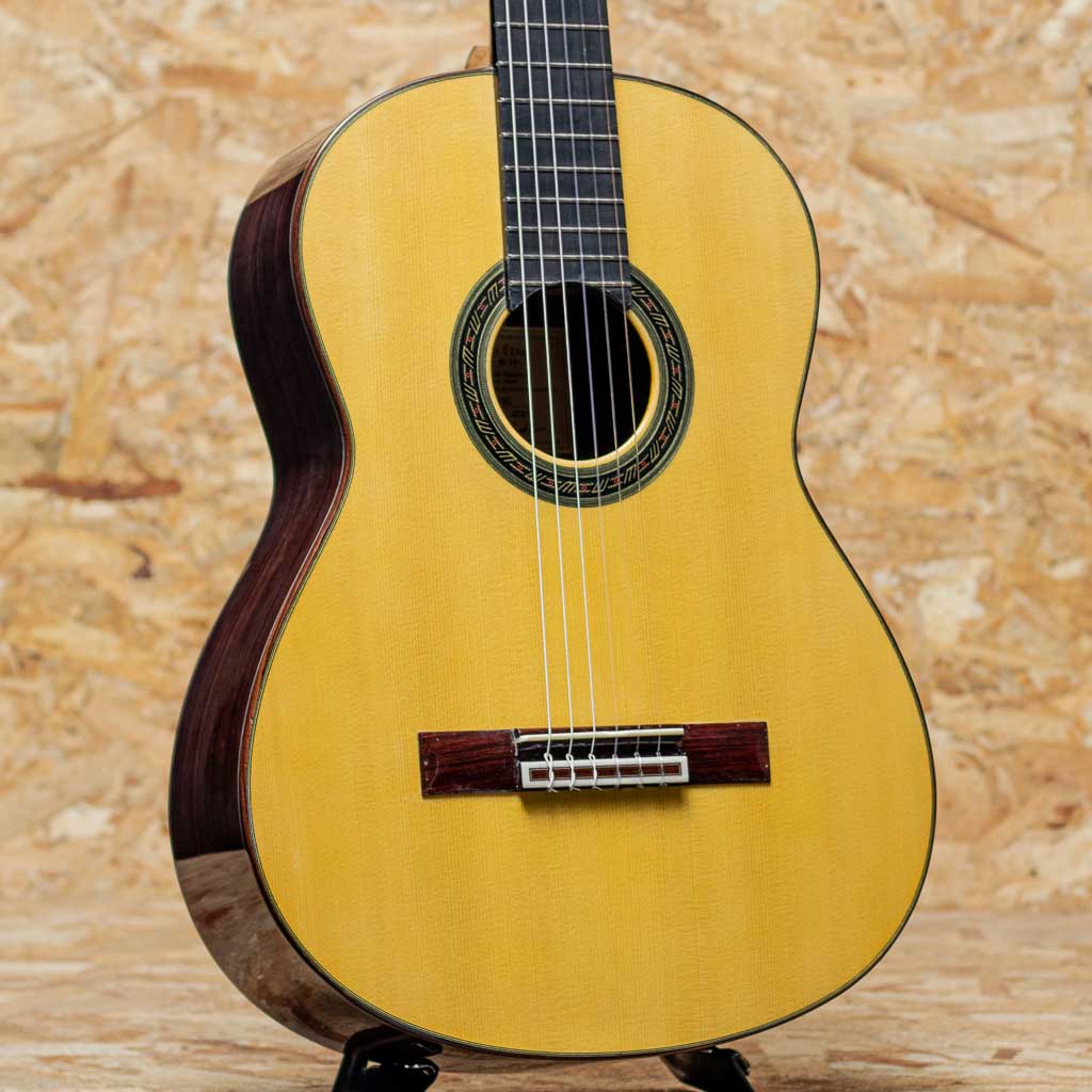 江崎氏は入社2年目にヤマハで新設されたギター研究課に所属。ギターの音作りの難しさに魅力を感じ、ギターを生涯の仕事とすることを決心。ギターの母国スペインでギター製作の真髄を学ぶため3年間修行へ行き、グラナダでエドゥアルド・フェレールに、マドリッドでマヌエル・エルナンデスに師事。帰国後、ヤマハ最高級ギターの製作を担当し、1975年~1982年に製作したヤマハ『GC-30B』は、ギタリストやや愛好家達の中でエザキモデルと呼ばれ名を馳せました。その後技術の責任者としてヤマハギター全般の幅広い職種を担当。ヤマハを定年退職後、2007年より自身の工房で本格的に江崎ギターの製作を開始。スペイン伝統の製作技術と多くの経験や知識を生かし、時間を掛け一本一本魂を込めて製作しています。スペイン的な香りの音色やバランスの良いパワフルなサウンド、演奏性の良さは多くのギタリストにも高い評価を受けています。本器はリーズナブルな価格ながら本格的な仕様の”No.35G”。表板にドイツ松、側・裏板にインディアンローズウッドを用い、セドロネック、黒檀指板、マダガスカルローズウッドブリッジを採用。ボディ全面をセラックニスで仕上げており、塗膜厚を抑えることで鳴りを向上。「エザキ・サウンド」をしっかりと継承した価格以上の鳴りを体感できる一本です。
