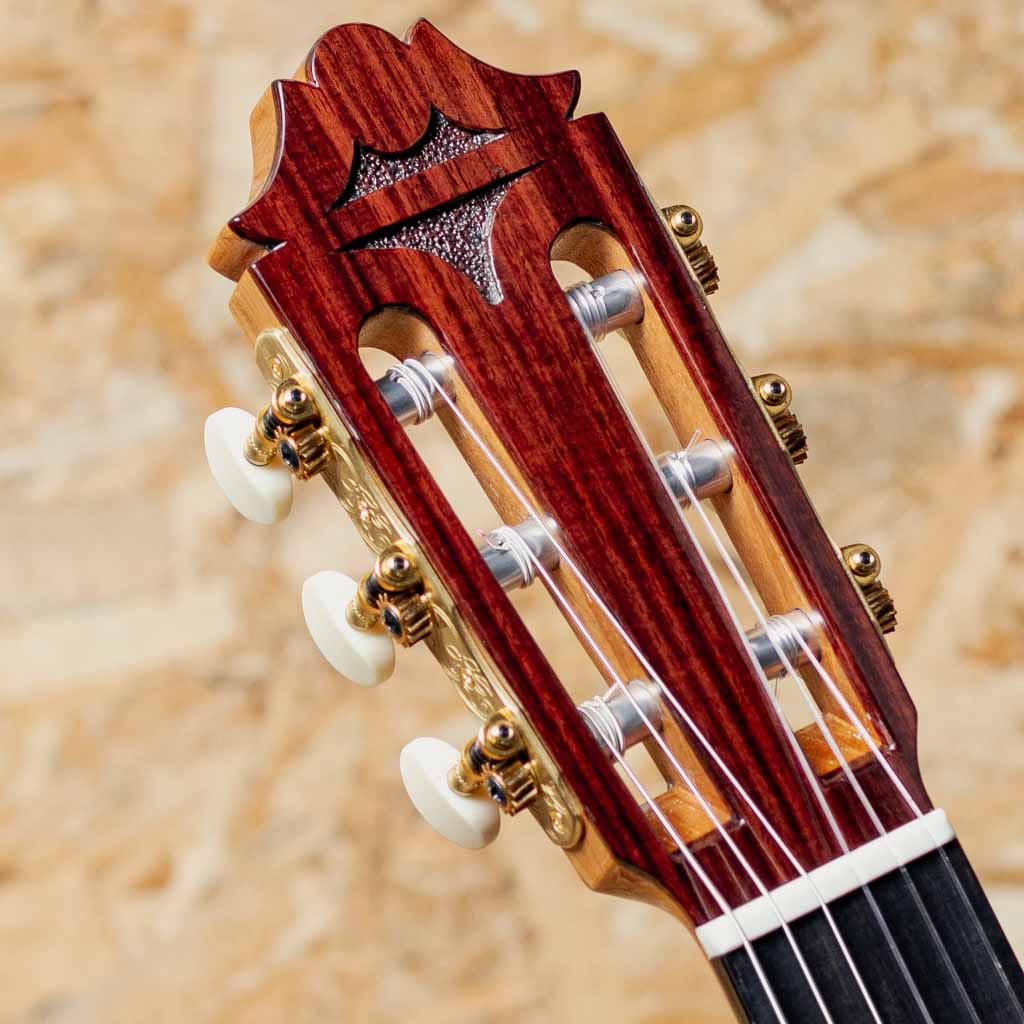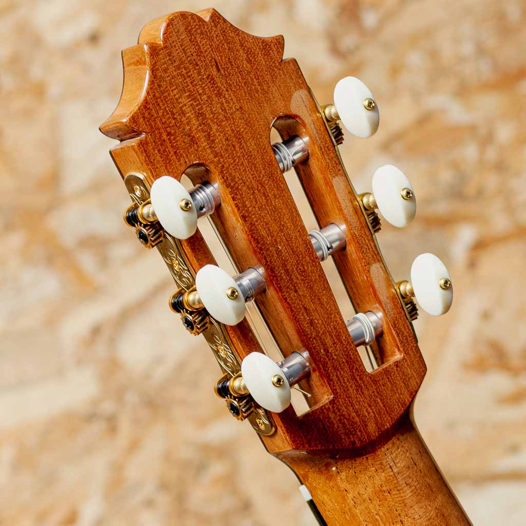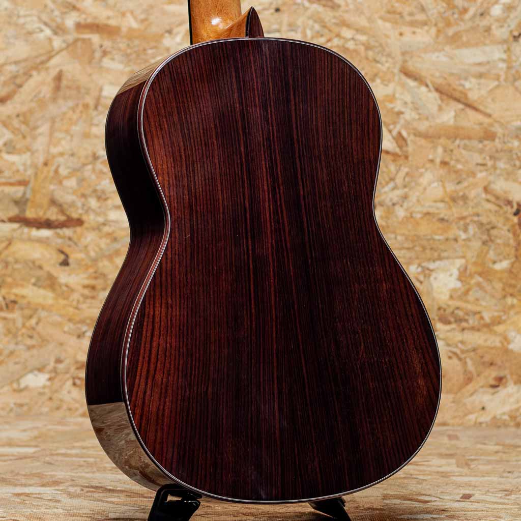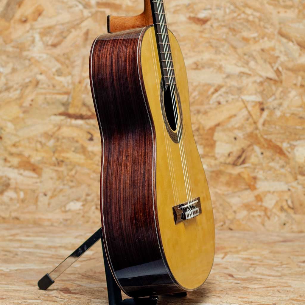 江崎氏は入社2年目にヤマハで新設されたギター研究課に所属。ギターの音作りの難しさに魅力を感じ、ギターを生涯の仕事とすることを決心。ギターの母国スペインでギター製作の真髄を学ぶため3年間修行へ行き、グラナダでエドゥアルド・フェレールに、マドリッドでマヌエル・エルナンデスに師事。帰国後、ヤマハ最高級ギターの製作を担当し、1975年~1982年に製作したヤマハ『GC-30B』は、ギタリストやや愛好家達の中でエザキモデルと呼ばれ名を馳せました。その後技術の責任者としてヤマハギター全般の幅広い職種を担当。ヤマハを定年退職後、2007年より自身の工房で本格的に江崎ギターの製作を開始。スペイン伝統の製作技術と多くの経験や知識を生かし、時間を掛け一本一本魂を込めて製作しています。スペイン的な香りの音色やバランスの良いパワフルなサウンド、演奏性の良さは多くのギタリストにも高い評価を受けています。本器はリーズナブルな価格ながら本格的な仕様の”No.35G”。表板にドイツ松、側・裏板にインディアンローズウッドを用い、セドロネック、黒檀指板、マダガスカルローズウッドブリッジを採用。ボディ全面をセラックニスで仕上げており、塗膜厚を抑えることで鳴りを向上。「エザキ・サウンド」をしっかりと継承した価格以上の鳴りを体感できる一本です。