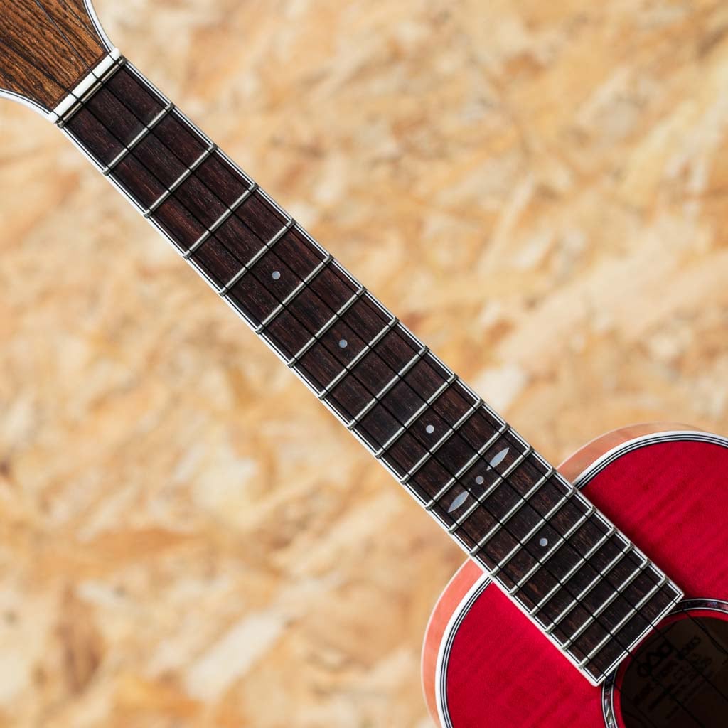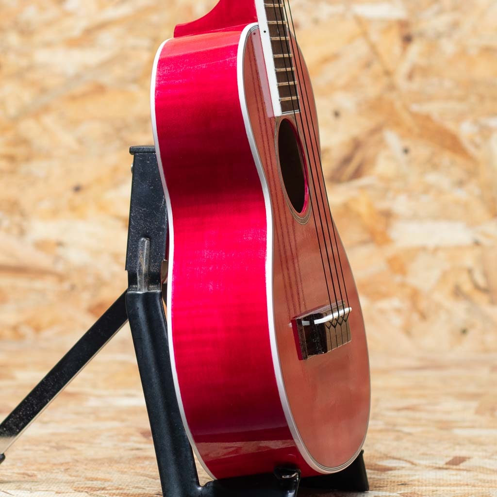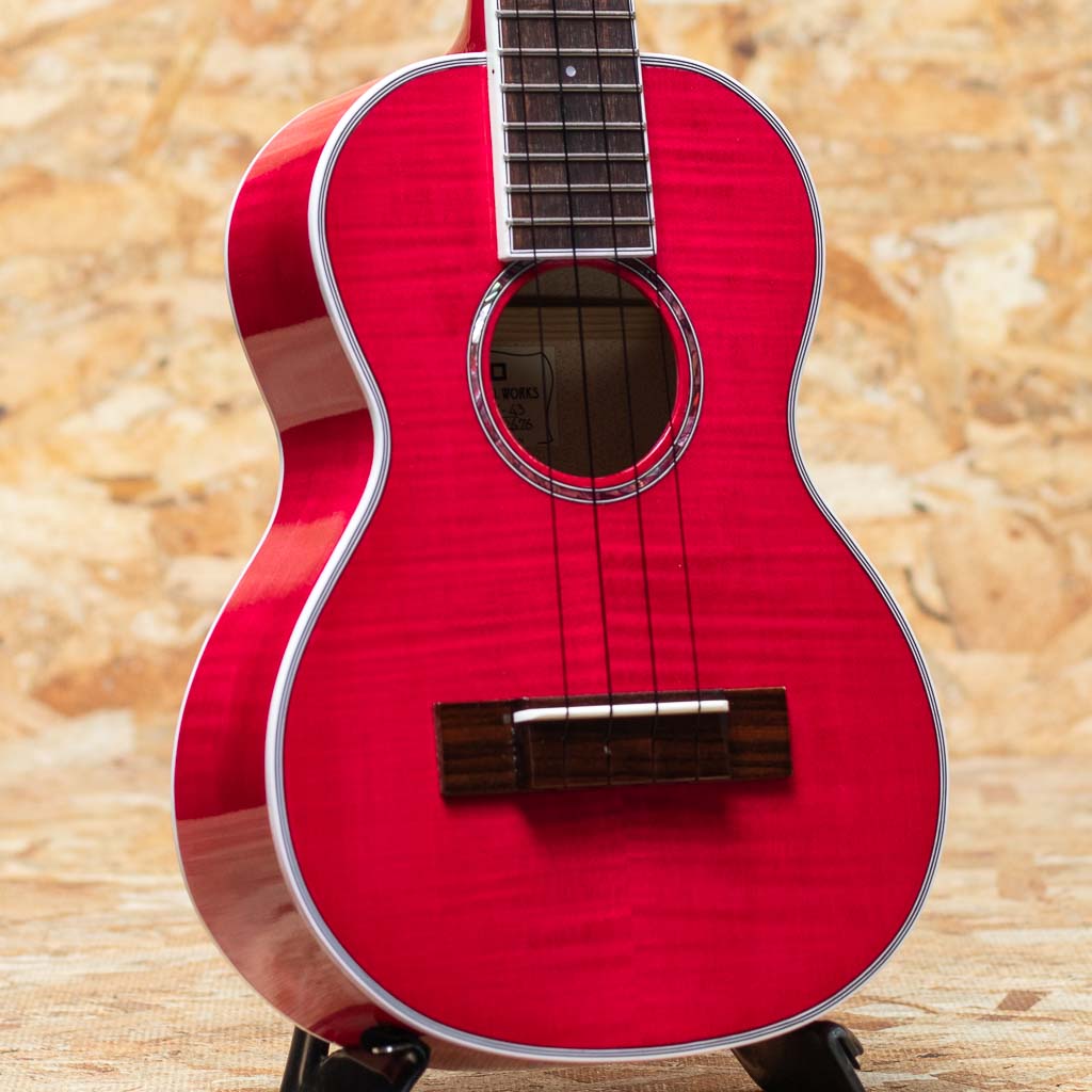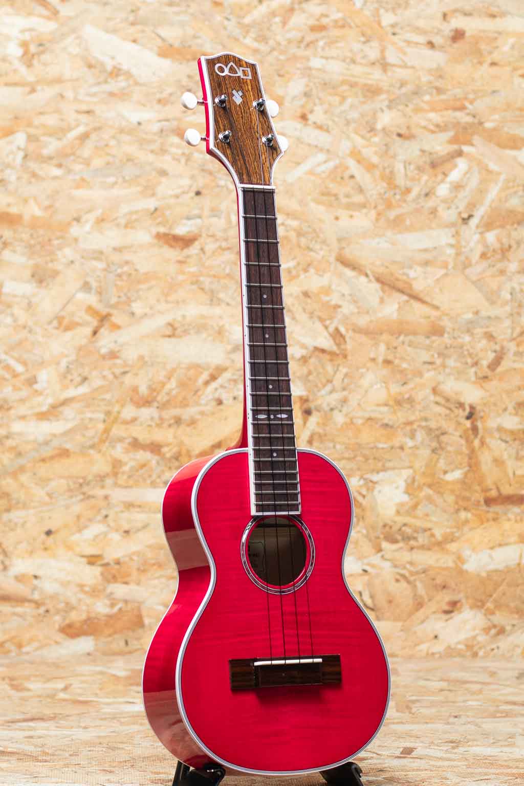 京都市の工房にて占部英明氏、息子の直宏氏によって製作されるハンドメイドウクレレ。本器はきれいなカーリー杢の出たメイプル材を表面板に使用したテナーモデル。メイプルボディ、メイプルネック、ローズウッド指板&ブリッジ、ホワイトバインディング、アバロンロゼッタ、グローバー製ギヤペグ。こちらは京都ならでは友禅染めの染料を独自に配合し、美しい紅色に仕上げられております。容積の大きなボディでエアー感のあるふくよかなサウンド。占部ウクレレ特有のやや薄めで握り易いネックシェイプ、0フレット仕様でローポジションの弾き易さは格別。14フレットジョイント仕様で演奏性も高く、テナースケールで多様なプレイにも対応可能。占部氏ならではの友禅染が大変美しいルックス抜群の1本です。