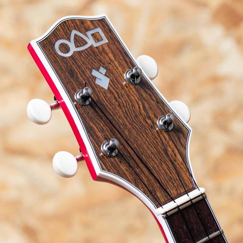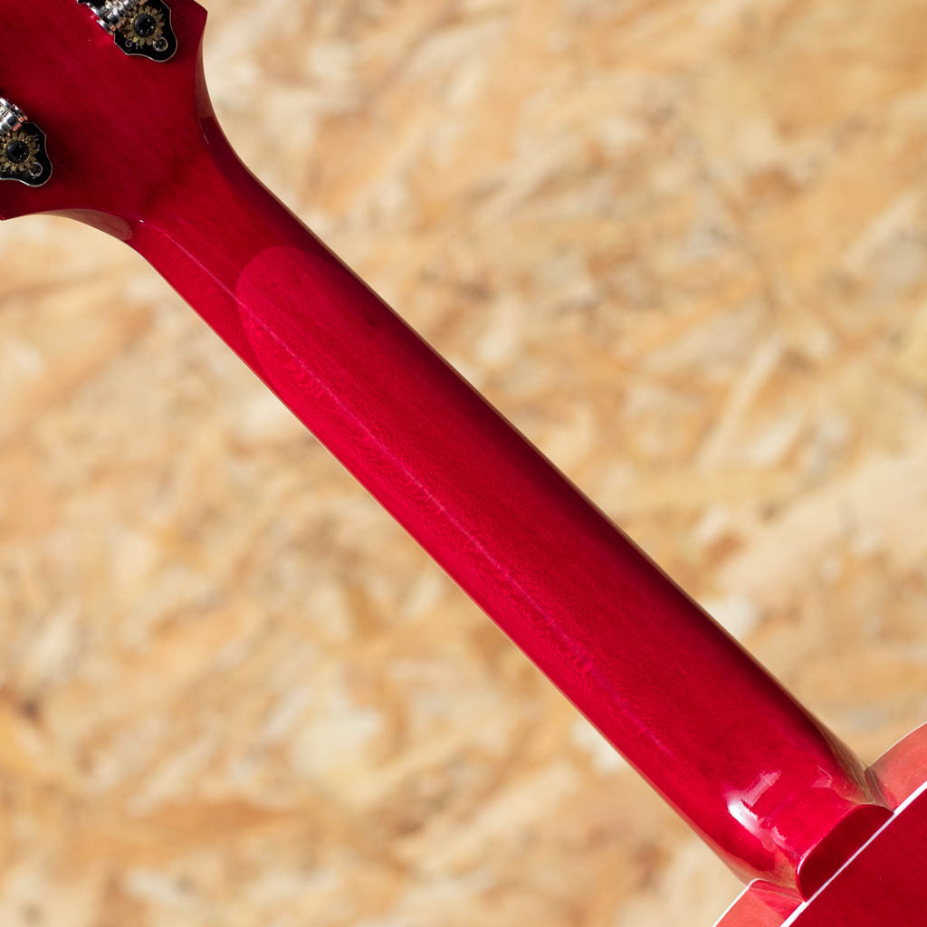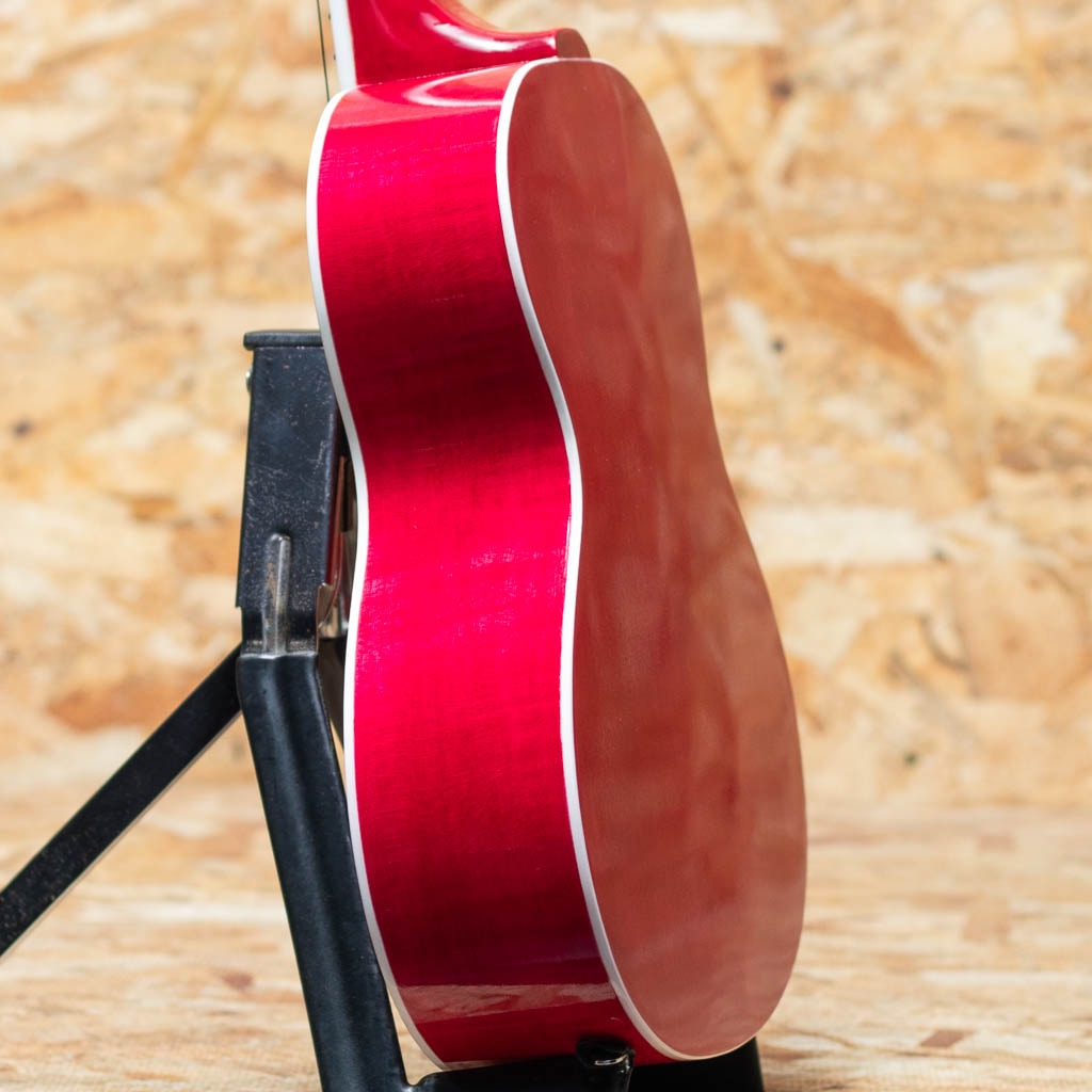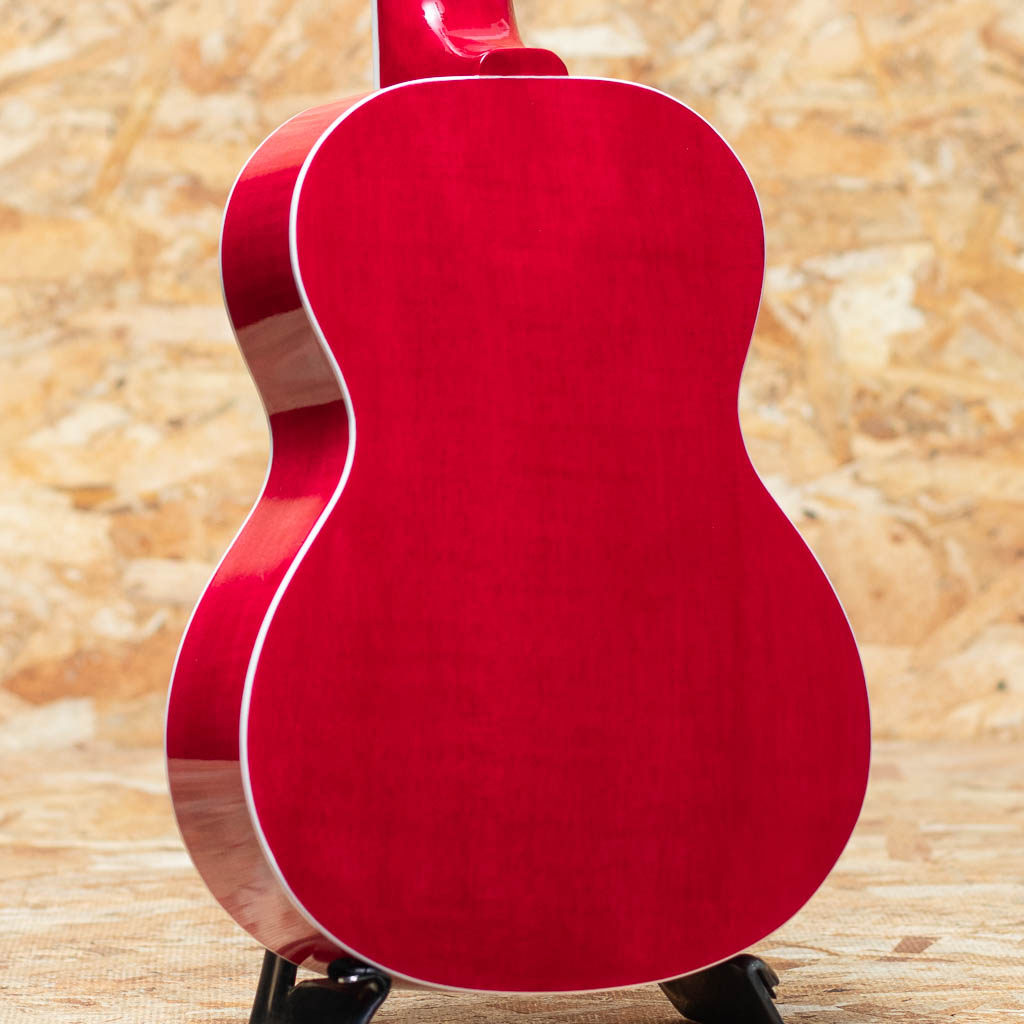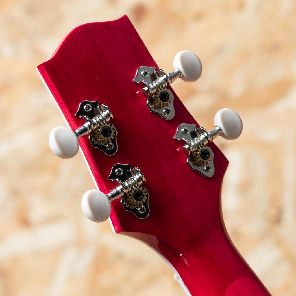 京都市の工房にて占部英明氏、息子の直宏氏によって製作されるハンドメイドウクレレ。本器はきれいなカーリー杢の出たメイプル材を表面板に使用したテナーモデル。メイプルボディ、メイプルネック、ローズウッド指板&ブリッジ、ホワイトバインディング、アバロンロゼッタ、グローバー製ギヤペグ。こちらは京都ならでは友禅染めの染料を独自に配合し、美しい紅色に仕上げられております。容積の大きなボディでエアー感のあるふくよかなサウンド。占部ウクレレ特有のやや薄めで握り易いネックシェイプ、0フレット仕様でローポジションの弾き易さは格別。14フレットジョイント仕様で演奏性も高く、テナースケールで多様なプレイにも対応可能。占部氏ならではの友禅染が大変美しいルックス抜群の1本です。