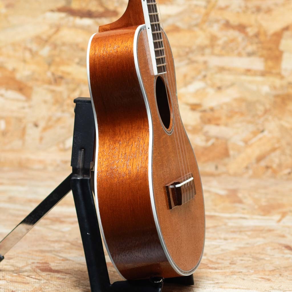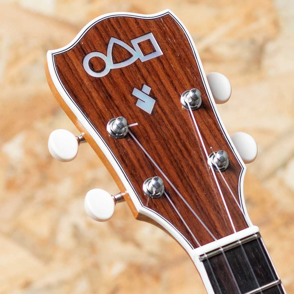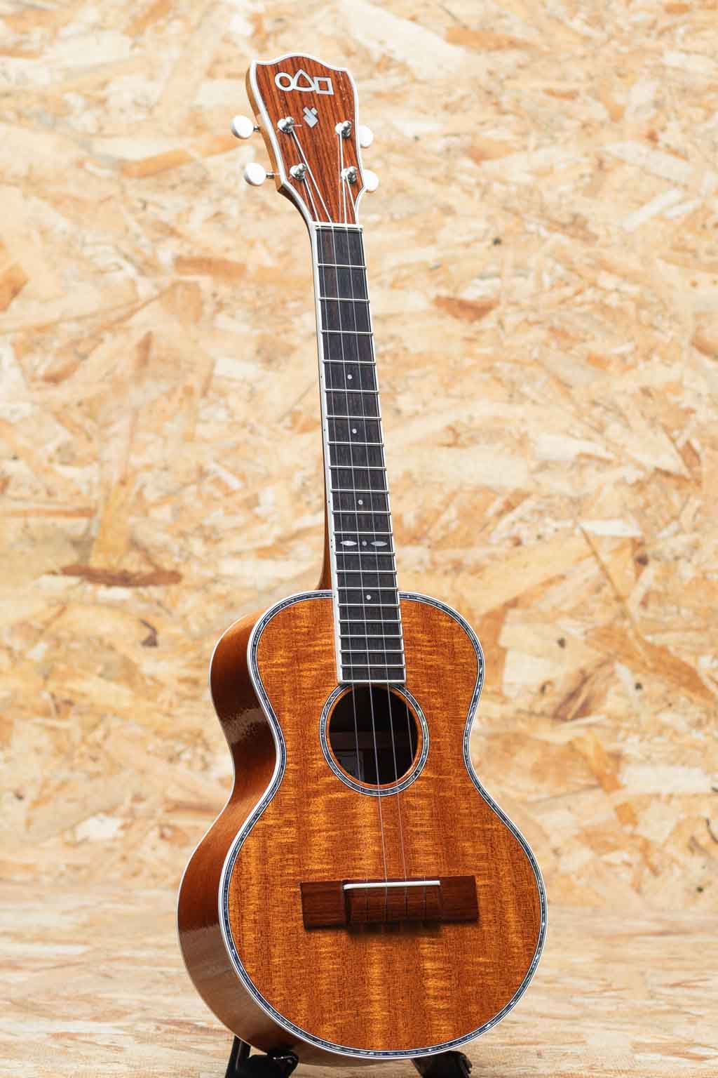 京都市の工房にて占部英明氏、息子の直宏氏によって製作される完全ハンドメイドウクレレ。本器は占部氏がオールドのアーチトップギターにインスパイアを受け製作された、新しいボディシェイプの特別な一本”OTモデル”。アーティトップギターを彷彿とさせるボディシェイプでスケールはビッグテナーと同様となります。ホンジュラス・マホガニーボディ、ホンジュラスマホガニーネック、エボニー指板、ローズウッドブリッジ、ホワイトボディバインディング、アバロントリム、アバロンロゼッタ、指板12フレット上キャツアイインレイ、グローバー製ギヤペグ、旧タイプソリッドヘッド仕様。占部ウクレレ特有のやや薄めで握り易いネックシェイプ、0フレット仕様でローポジションの弾き易さは格別。ホンジュラスマホガニーの軽やかで軽快な響きとこのボディならではのふくよかさを感じられます。スケールも長いため、大音量かつ安定性に優れ、ソロウクレレにも最適です。ルックスも印象的な注目の1本です。