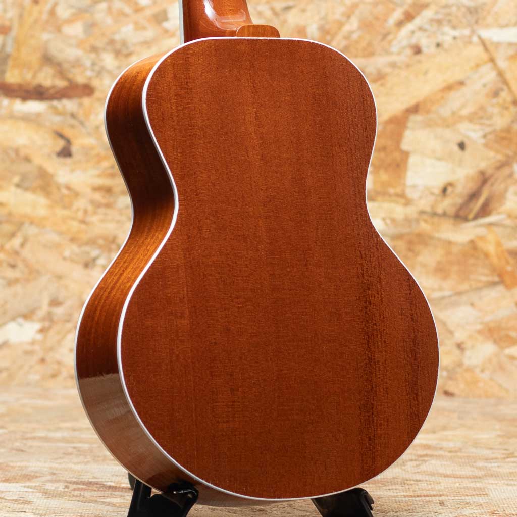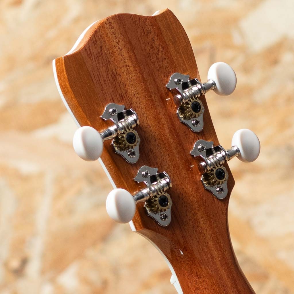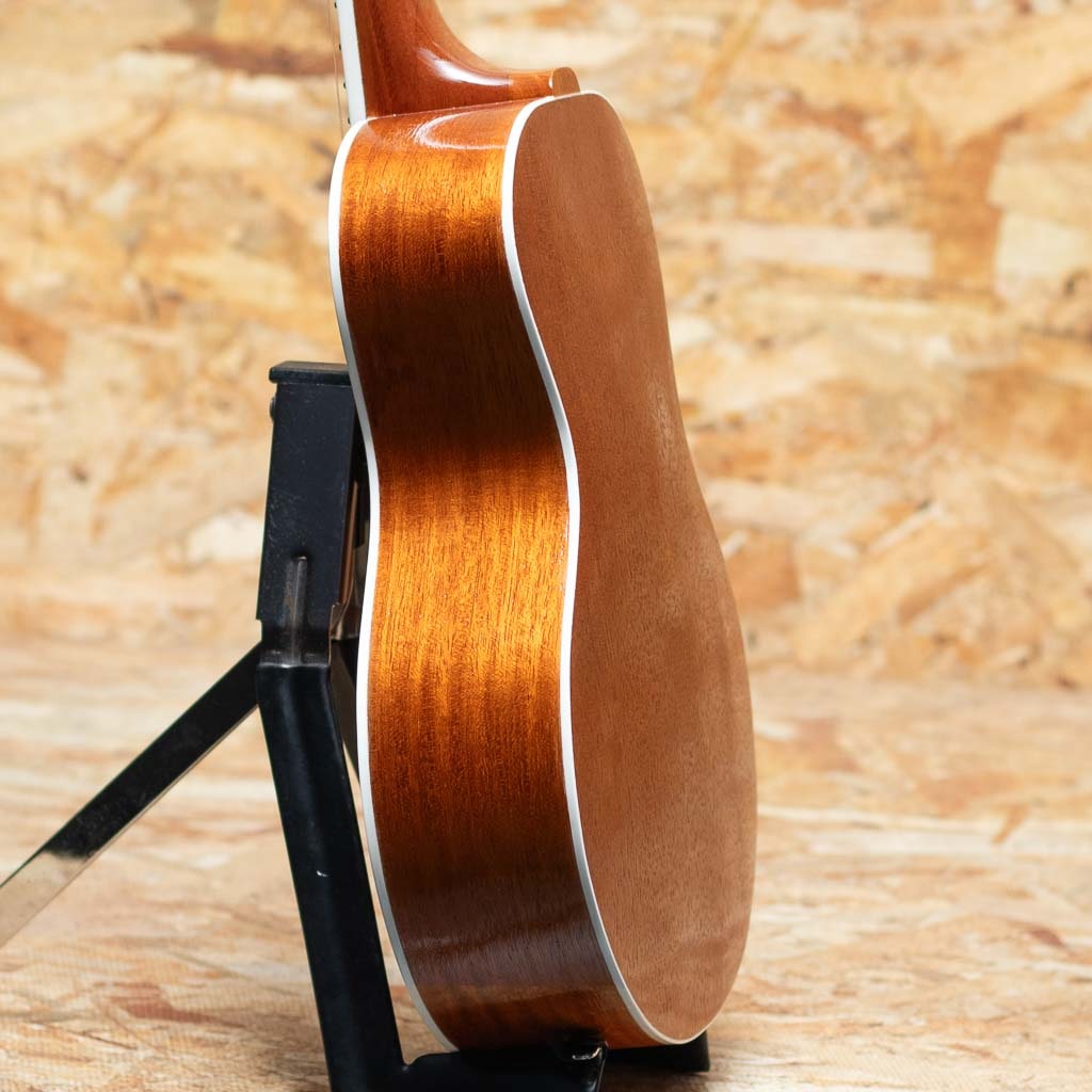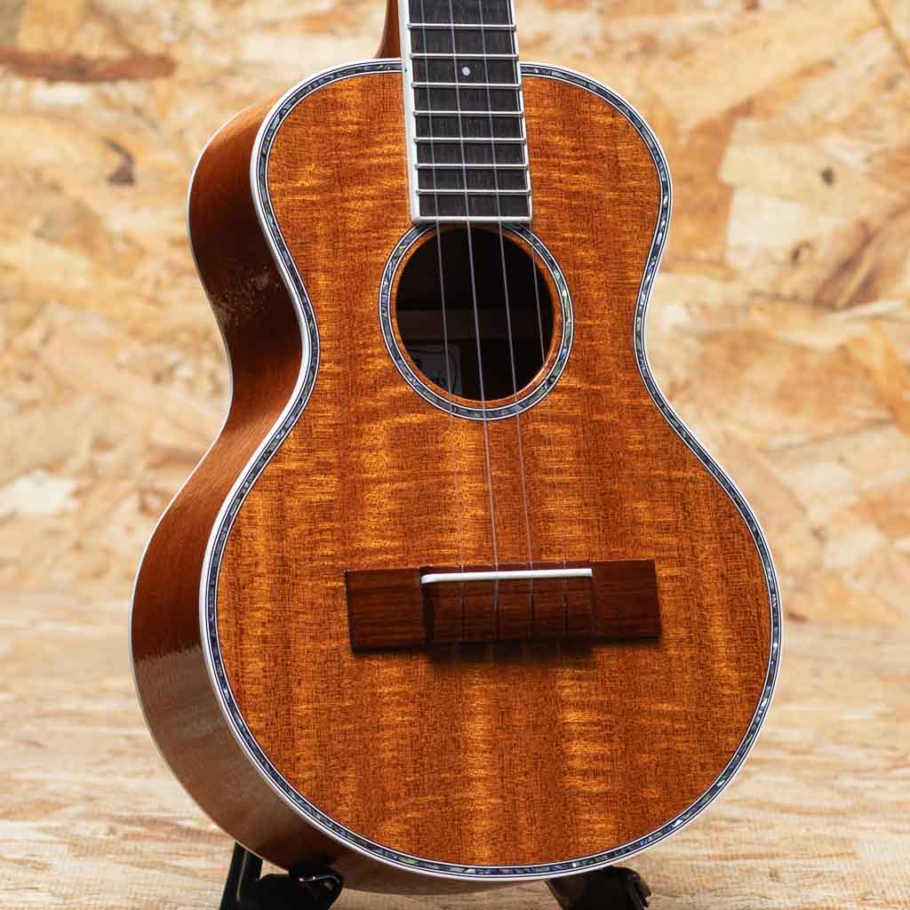 京都市の工房にて占部英明氏、息子の直宏氏によって製作される完全ハンドメイドウクレレ。本器は占部氏がオールドのアーチトップギターにインスパイアを受け製作された、新しいボディシェイプの特別な一本”OTモデル”。アーティトップギターを彷彿とさせるボディシェイプでスケールはビッグテナーと同様となります。ホンジュラス・マホガニーボディ、ホンジュラスマホガニーネック、エボニー指板、ローズウッドブリッジ、ホワイトボディバインディング、アバロントリム、アバロンロゼッタ、指板12フレット上キャツアイインレイ、グローバー製ギヤペグ、旧タイプソリッドヘッド仕様。占部ウクレレ特有のやや薄めで握り易いネックシェイプ、0フレット仕様でローポジションの弾き易さは格別。ホンジュラスマホガニーの軽やかで軽快な響きとこのボディならではのふくよかさを感じられます。スケールも長いため、大音量かつ安定性に優れ、ソロウクレレにも最適です。ルックスも印象的な注目の1本です。