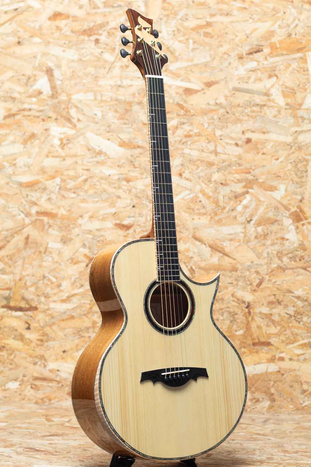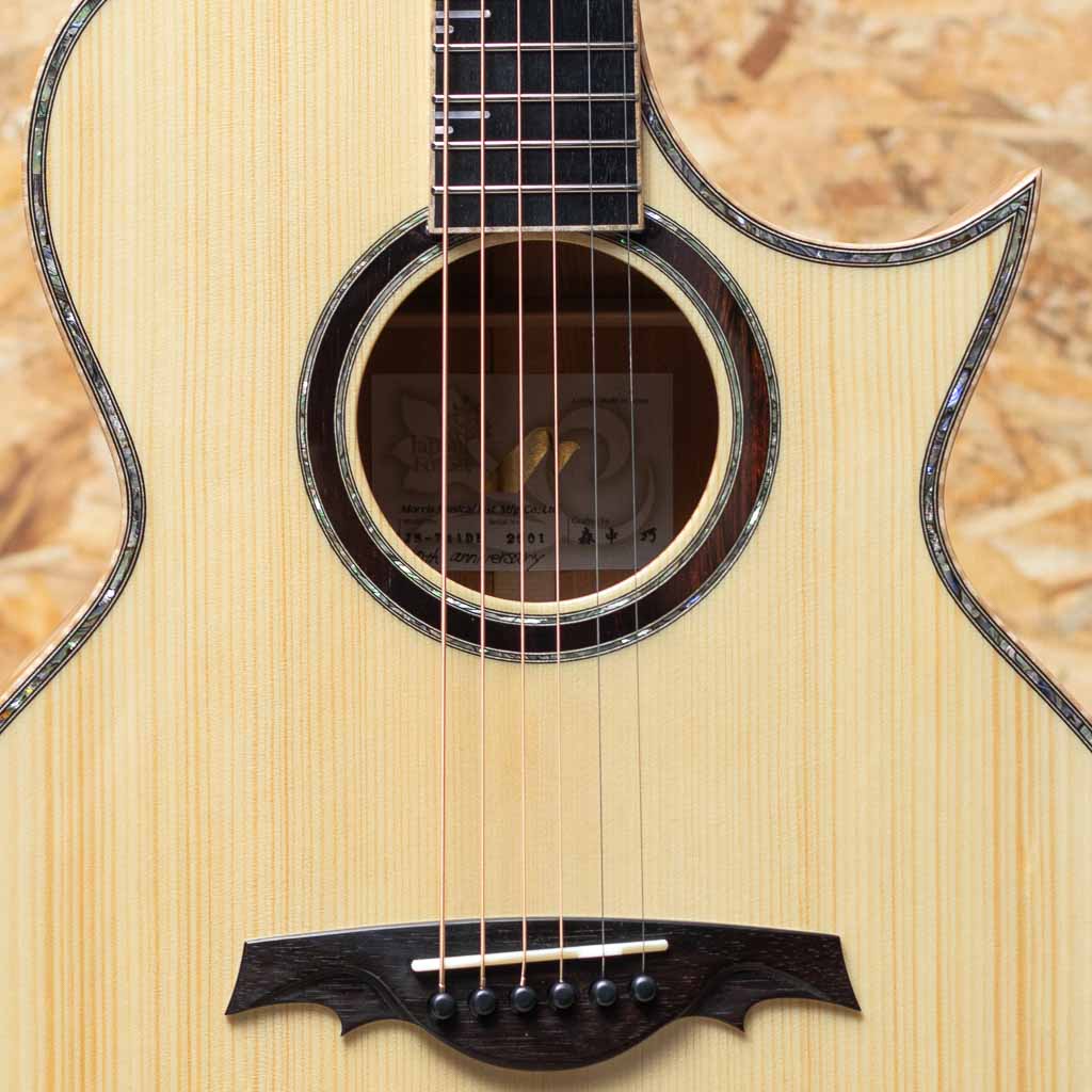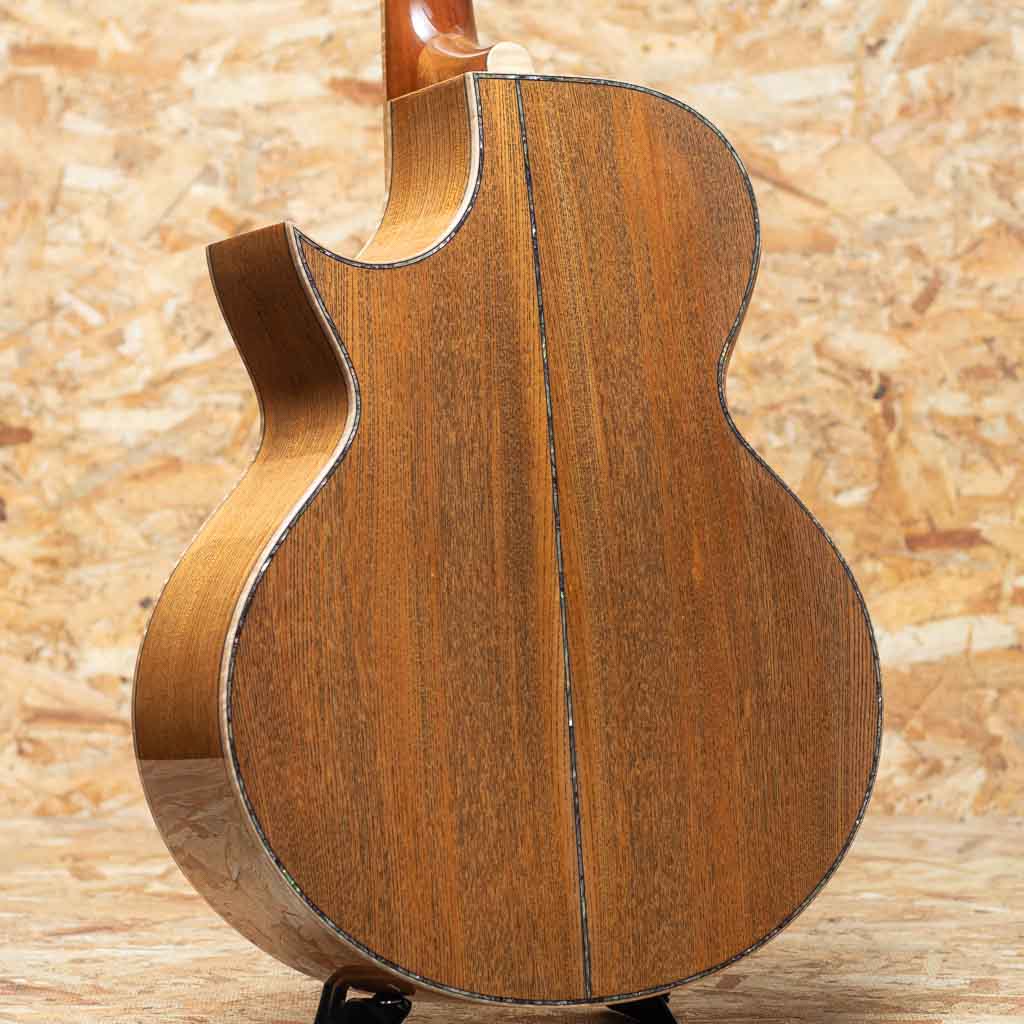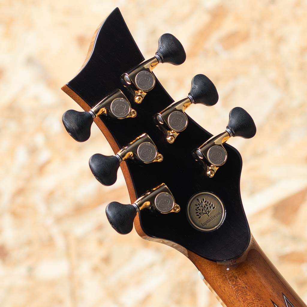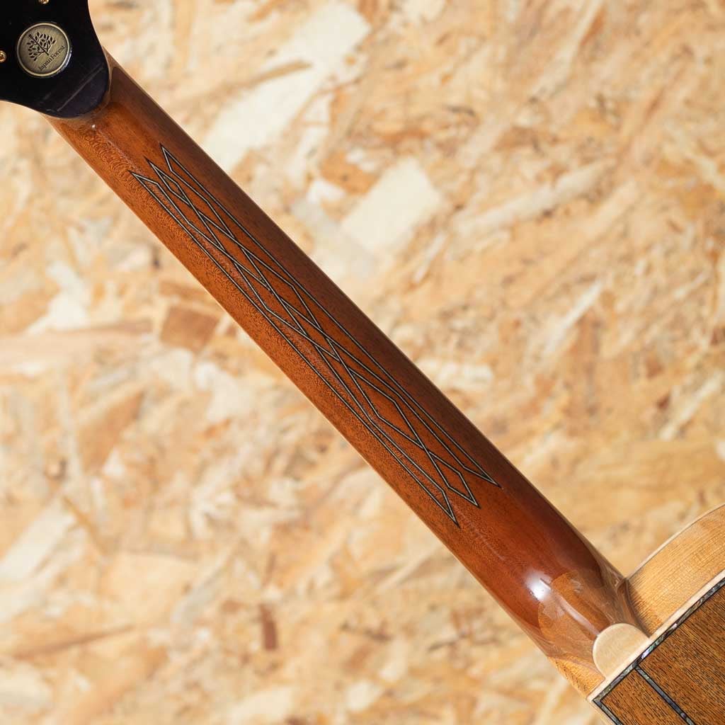 日本を代表するアコースティックギターメーカーの一つ、「Morris」。本器は、三木楽器創業200周年を記念して製作された特別モデル。マスタールシアー・森中氏が手掛けたハンドメイドカスタムギターです。モーリスの粋な計らいにより、樹齢200年を誇る日本の銘木がボディ材に採用されております。トップ材には、水や火に強く、仏壇や神棚にも用いられる神聖な木材、「高野槙」を採用。軽量で柔らかな質感を持ち、澄んだ透明感のある音色を生み出します。サイド&バックには、耐久性と弾力性に優れ、年月を重ねるほどに味わいが増すとされる「欅」を使用。硬く重厚な材質が、豊かな低音と明瞭な中高音を響かせます。本器はスモール・セミ・ジャンボ・ディープボディ仕様で、日本の伝統木材ならではの特別な音色と魅力を備えています。また、演奏時の快適性を高めるため、ボディバックとエルボー部にはコンター加工が施されており、演奏性にも配慮されています。洗練されたデザインと美しい仕上がりからは、森中氏の卓越した技量が窺えます。さらに、このギターは「日本の職人が、日本の木材を使用し、日本をテーマに作品化する」というコンセプトのもと展開されている「Japan Forest」シリーズの一環として製作されており、ヘッド裏のメダルがその象徴となっています。