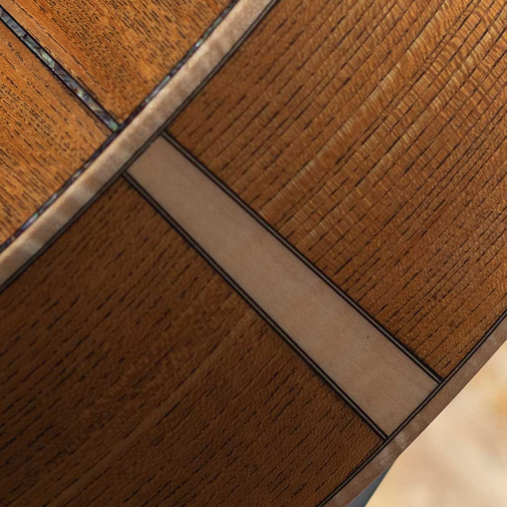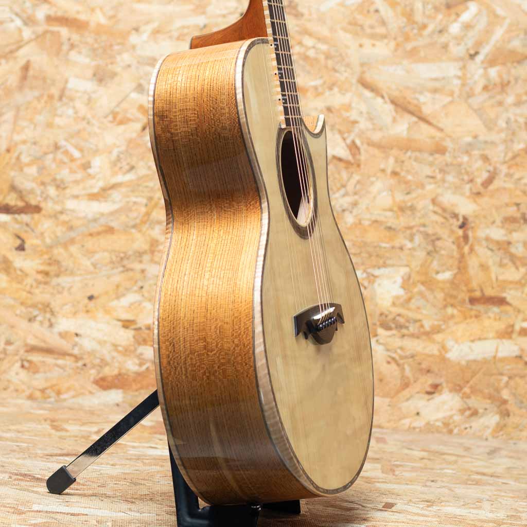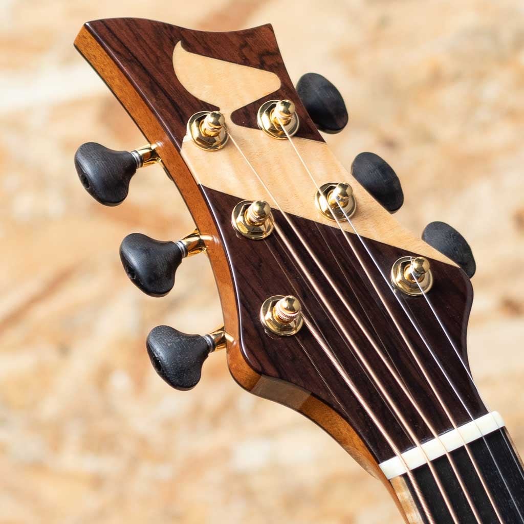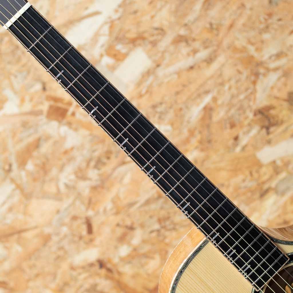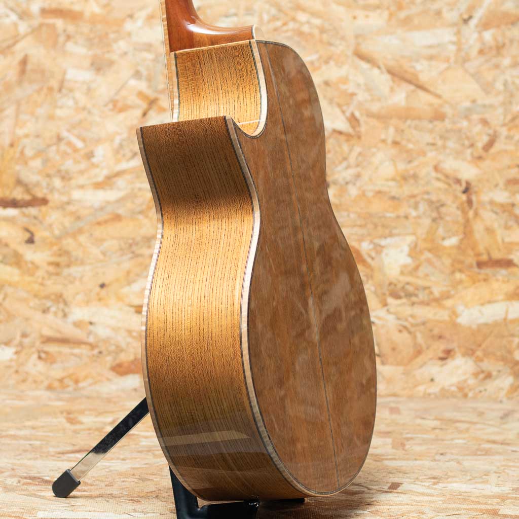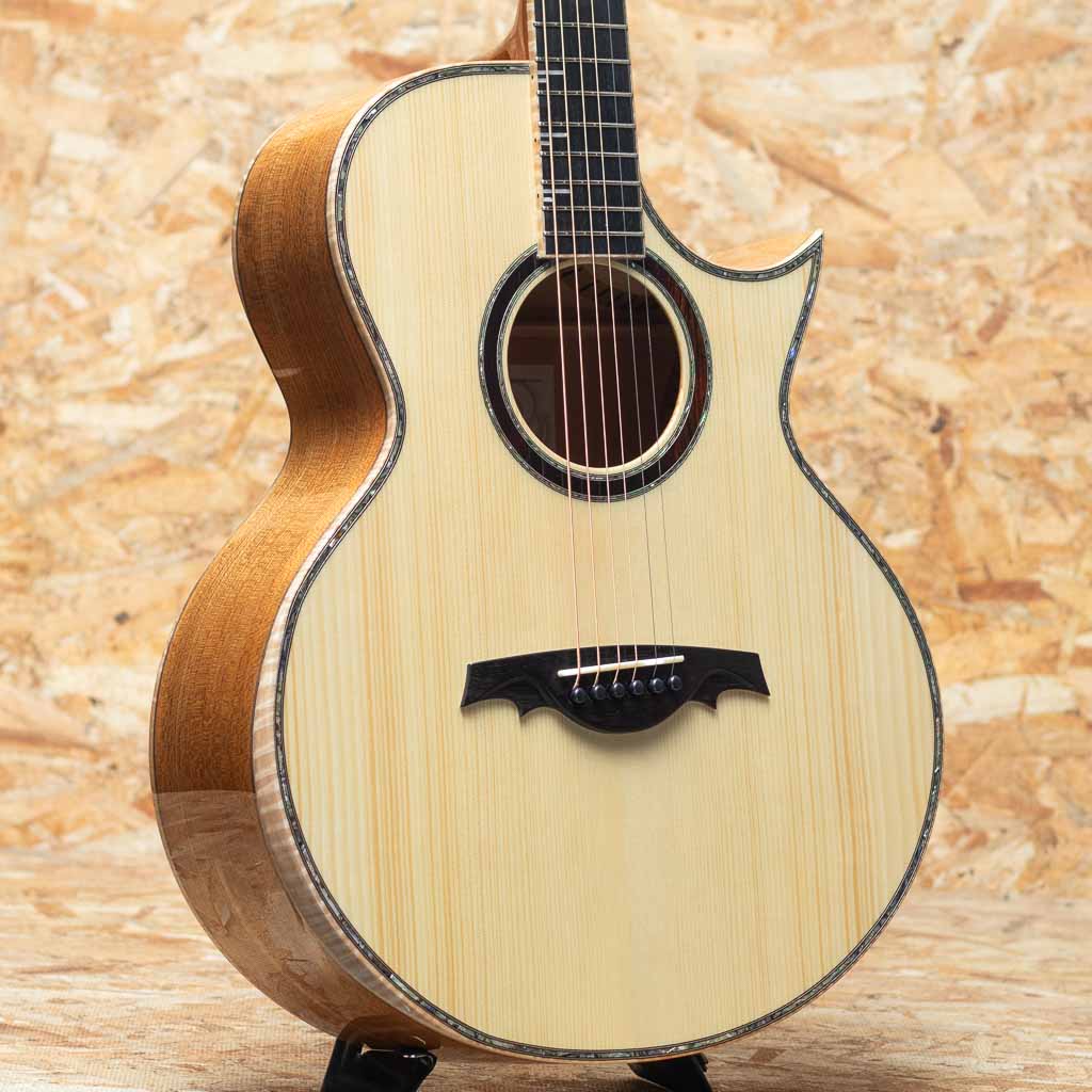 日本を代表するアコースティックギターメーカーの一つ、「Morris」。本器は、三木楽器創業200周年を記念して製作された特別モデル。マスタールシアー・森中氏が手掛けたハンドメイドカスタムギターです。モーリスの粋な計らいにより、樹齢200年を誇る日本の銘木がボディ材に採用されております。トップ材には、水や火に強く、仏壇や神棚にも用いられる神聖な木材、「高野槙」を採用。軽量で柔らかな質感を持ち、澄んだ透明感のある音色を生み出します。サイド&バックには、耐久性と弾力性に優れ、年月を重ねるほどに味わいが増すとされる「欅」を使用。硬く重厚な材質が、豊かな低音と明瞭な中高音を響かせます。本器はスモール・セミ・ジャンボ・ディープボディ仕様で、日本の伝統木材ならではの特別な音色と魅力を備えています。また、演奏時の快適性を高めるため、ボディバックとエルボー部にはコンター加工が施されており、演奏性にも配慮されています。洗練されたデザインと美しい仕上がりからは、森中氏の卓越した技量が窺えます。さらに、このギターは「日本の職人が、日本の木材を使用し、日本をテーマに作品化する」というコンセプトのもと展開されている「Japan Forest」シリーズの一環として製作されており、ヘッド裏のメダルがその象徴となっています。
