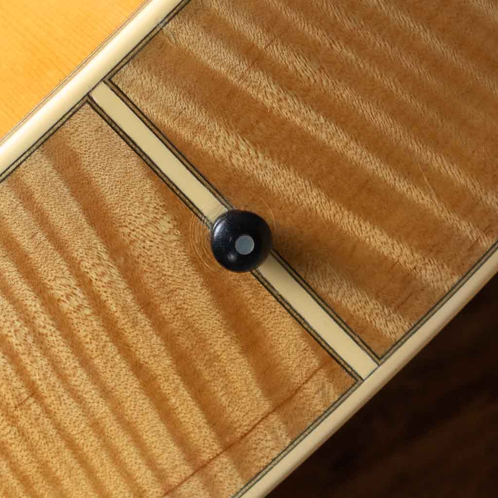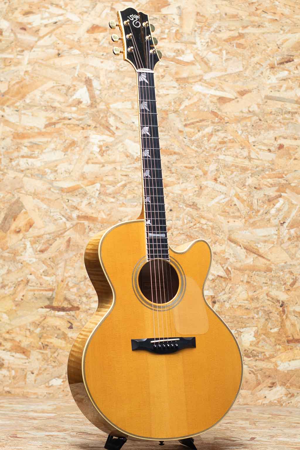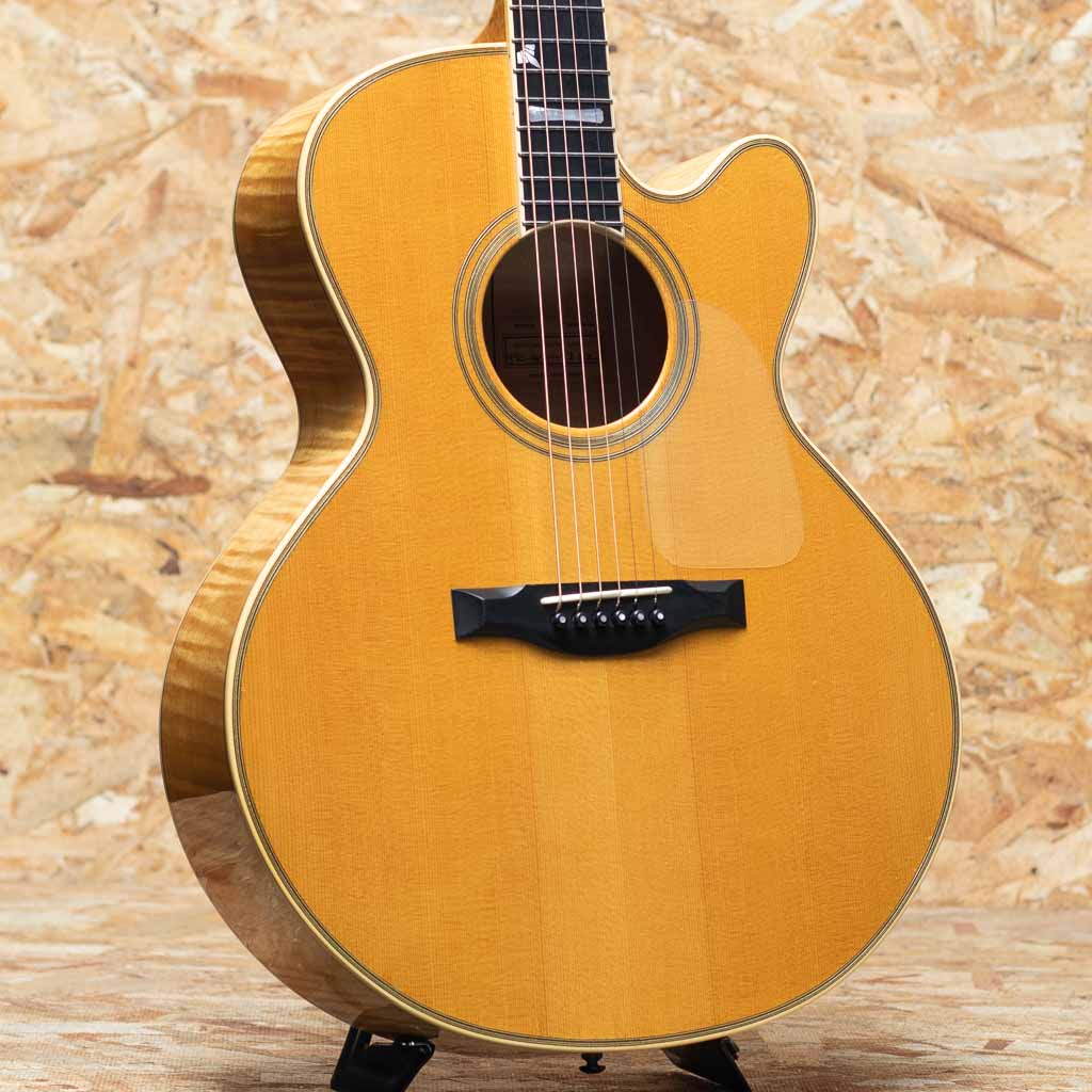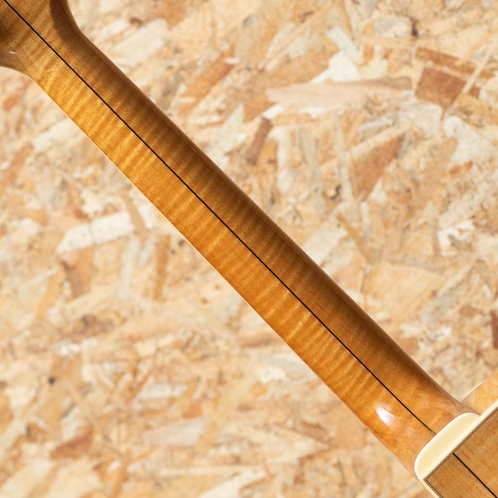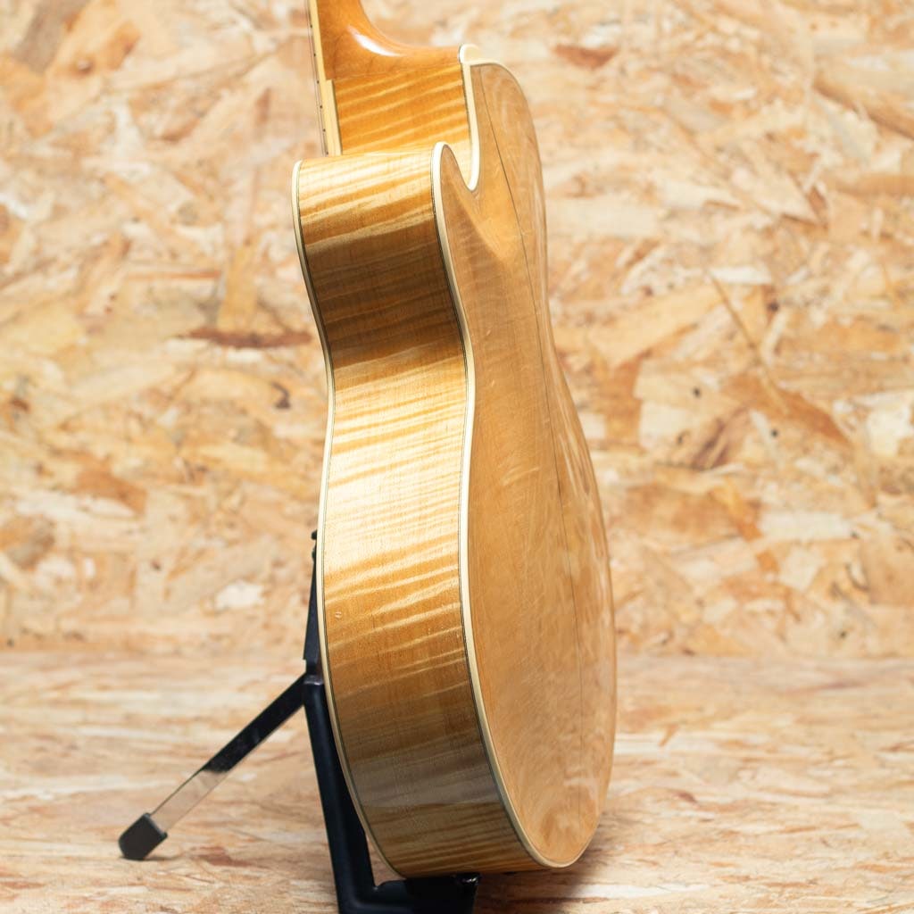 1976年に設立されたサンタクルーズギターカンパニーは、ブティックギターを製作し、スチールストリングギタービジネスの最前線に位置するブランドです。リチャードフーバー氏を中心に少数にて製作されるアメリカの老舗で、ヴィンテージマーティンをルーツに持ち、それらを踏襲している点も魅力の一つ。ヴィンテージギターファンから現代的なミュージシャンまで魅了する名門ブランドです。本器はカーブドバック、フラットトップのFカッタウェイモデル”FTC-40”1982年製のUSED品。ユニークなルックス・スタイルのモデルです。過去エリック・クラプトンが1980年代のFTCを所有しており、2015年に氏のFTCを修復したことをきっかけに、翌年サンタクルーズギターカンパニー創立40周年を記念してFTCが限定復刻発売され、2017年にはカタログモデルとして戻ってきています。スプルーストップ、フレイムメイプルサイド&バック、フレイムメイプルネック、エボニー指板&ブリッジ。独特なふくよかさと明るく切れ、抜けのあるトーン。アーチトップの響きとフラットトップのサスティンを備えたこのスタイルならではのサウンドです。正面左側サイドに曲げによる木部のシワが見受けられます、傷・打痕、塗装の引けなどはありますが、年代を考えますと良いコンディションが保たれております。国内では近年物も見かけず、当時の物はなかなか希少です。非常にユニークな1本。ハードケースが付属します。