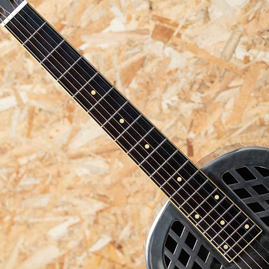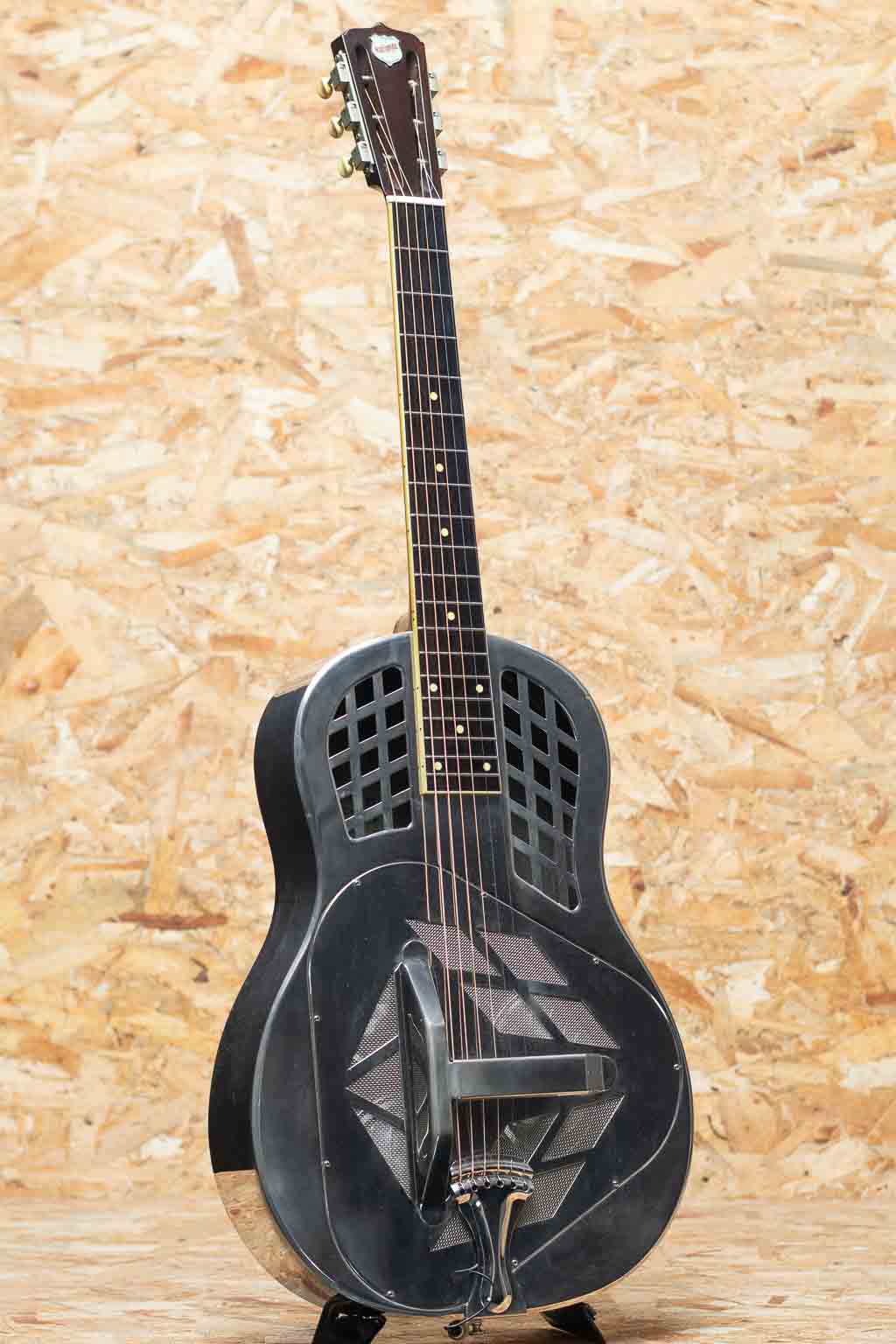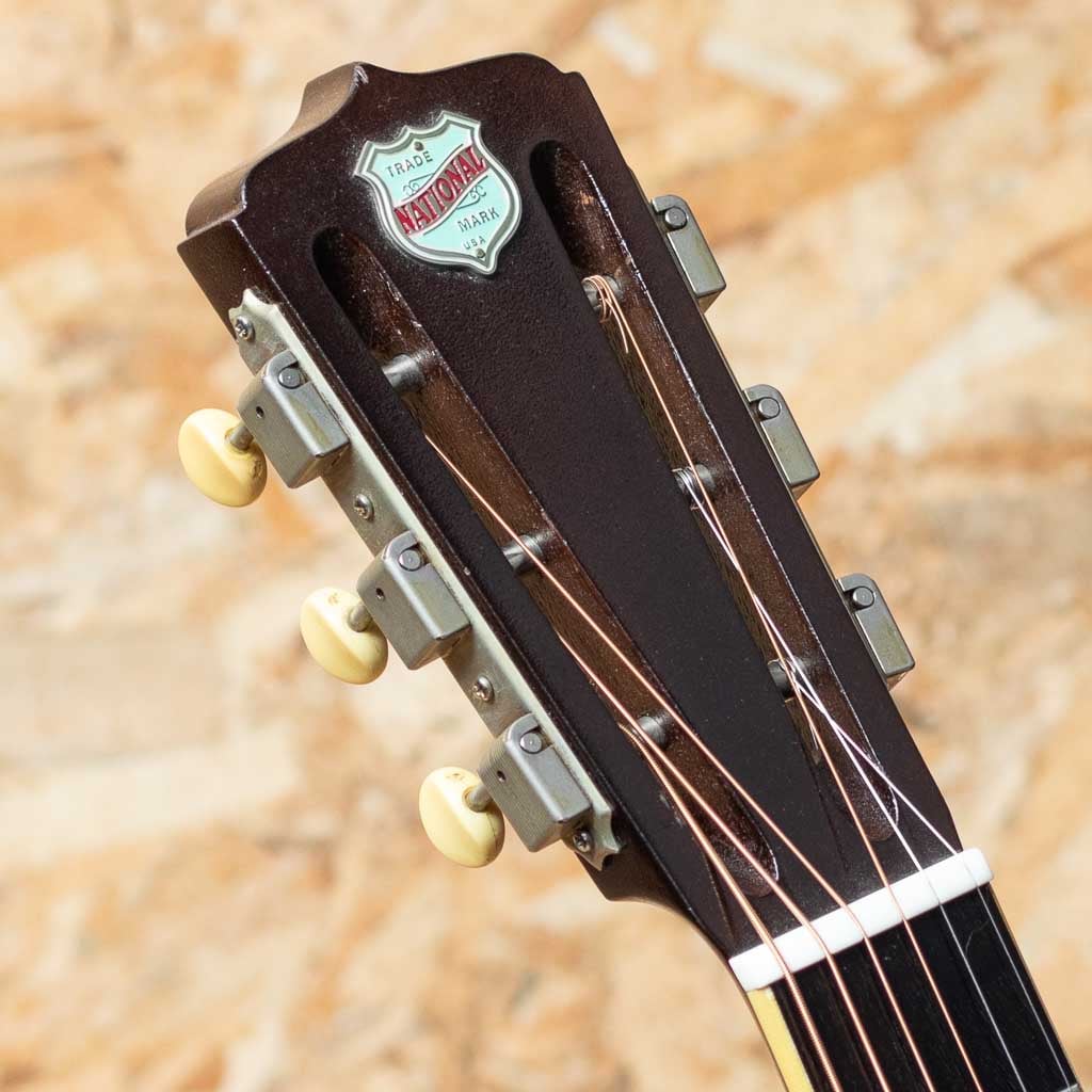 Nationalは1925年にJohn DopyeraとRudy Dopyeraのドピエラ兄弟とジョージ・ビーチャムによってNational String Instrument Corporeationが設立されました。大きな音量を出すべく開発されたリゾネーターギターはその音量はもちろん個性のあるトーンを持ちアーティストに受け入れられていきました。その後1942年に倒産。そして1988年、ドブロ社のリペア部門にいたドナルド・ヤングとマクレガー・ゲインズの2人が復活したNational Guitarの1995年製 Style-1 USED品。ニッケルメッキのブラスボディーに3個のコーンを持つトライコーン、T型ブリッジカバー、マホガニーネック、トラスロッド無し(鉄芯あり)、ローズウッド指板、オリジナルペグ、オリジナルテールピースです。