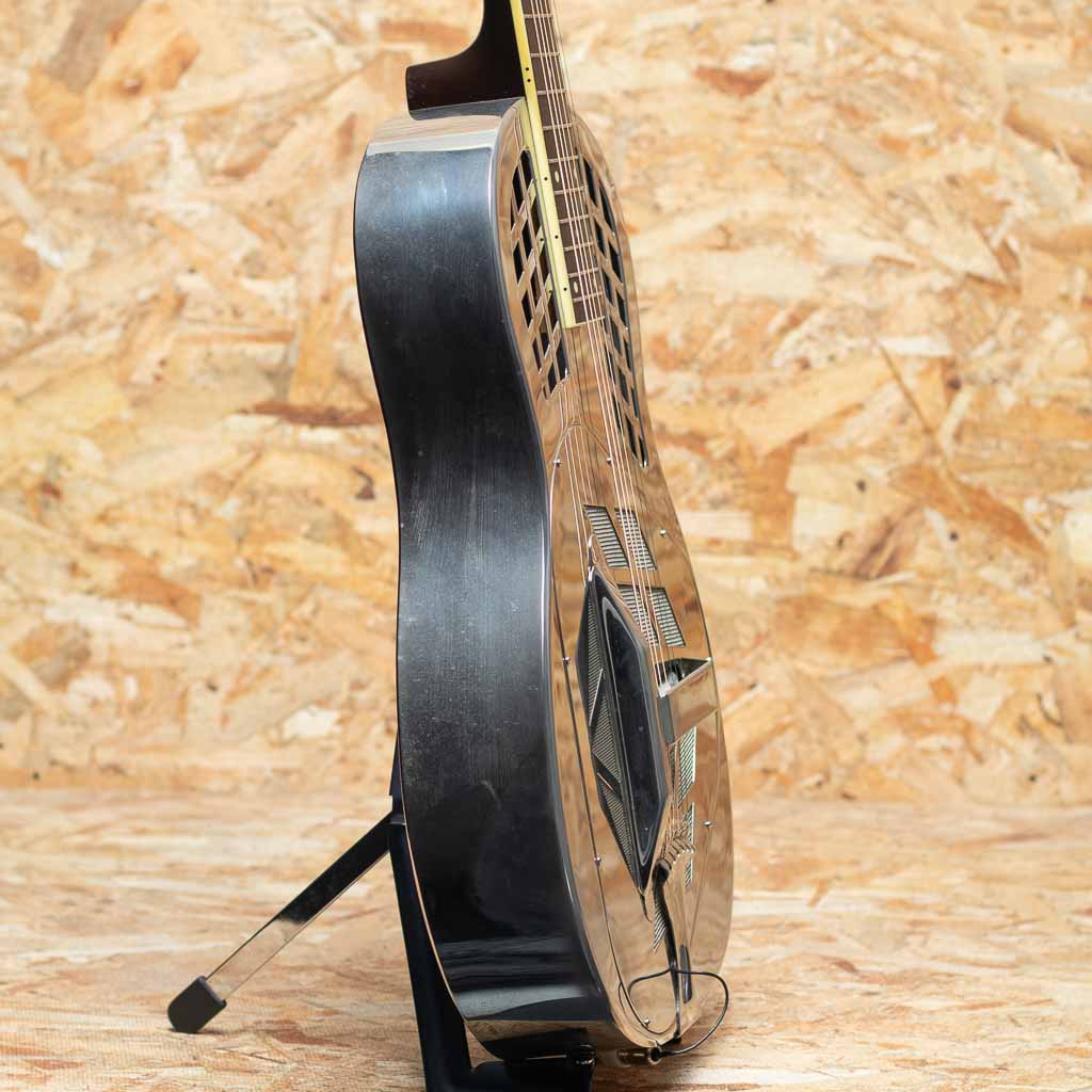 パッシブP.Uをインストールしておりジャックはエンドピン部に固定されています。ニッケルメッキ特有のくすみは全体に見られますがネックコンディション良好で弾きやすい状態です。トライコーンならではの音量とその華やかでメタリックな独特の響き。音色の深みやサスティンともに素晴らしくスライドプレイが見事にはまるトーンです。ブルースやハワイアン、ジャズなど流石に絶妙にマッチするサウンドは唯一無二と言えるでしょう。ライブでも積極的に使用できるのも嬉しいところです。オリジナルハードケース付属