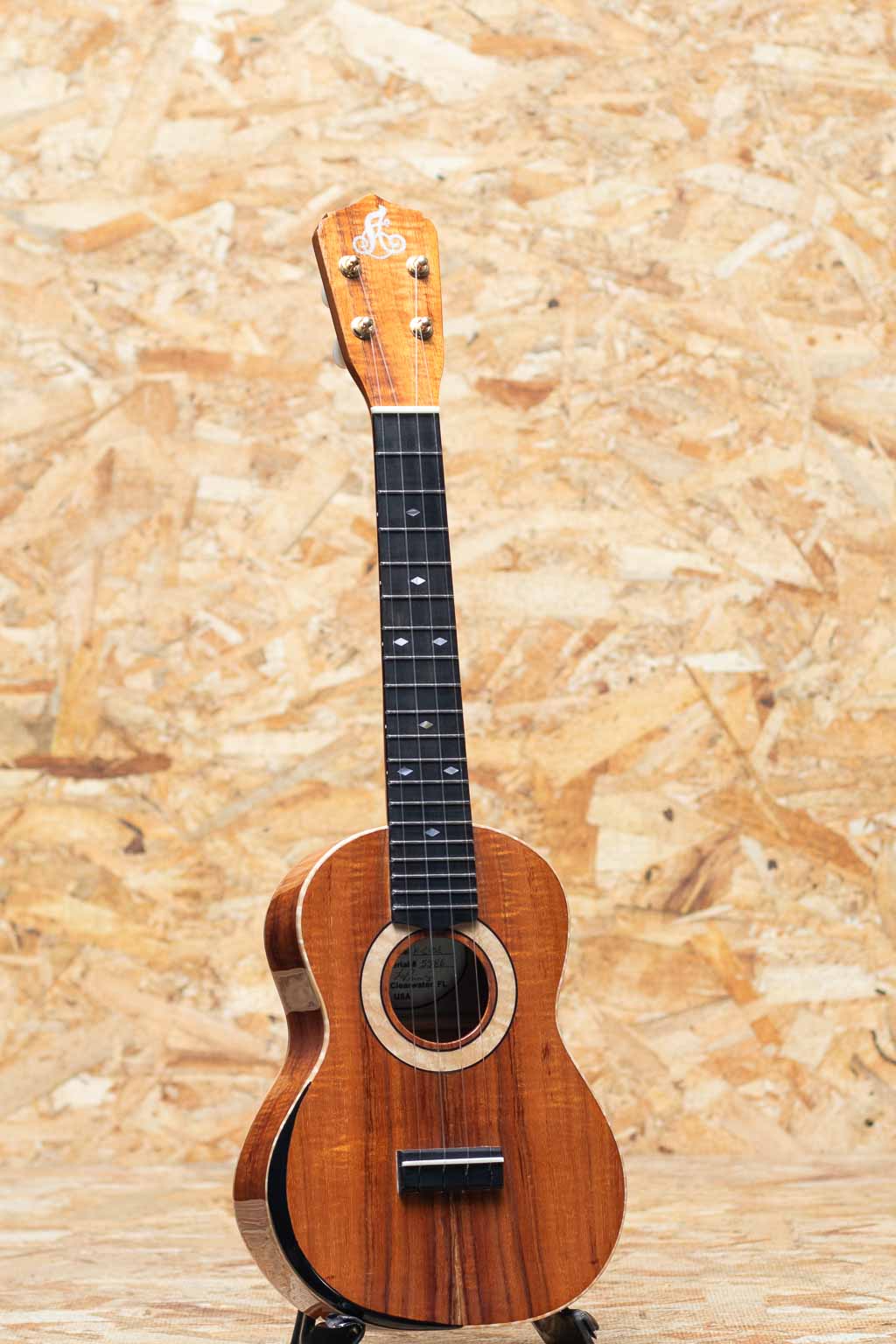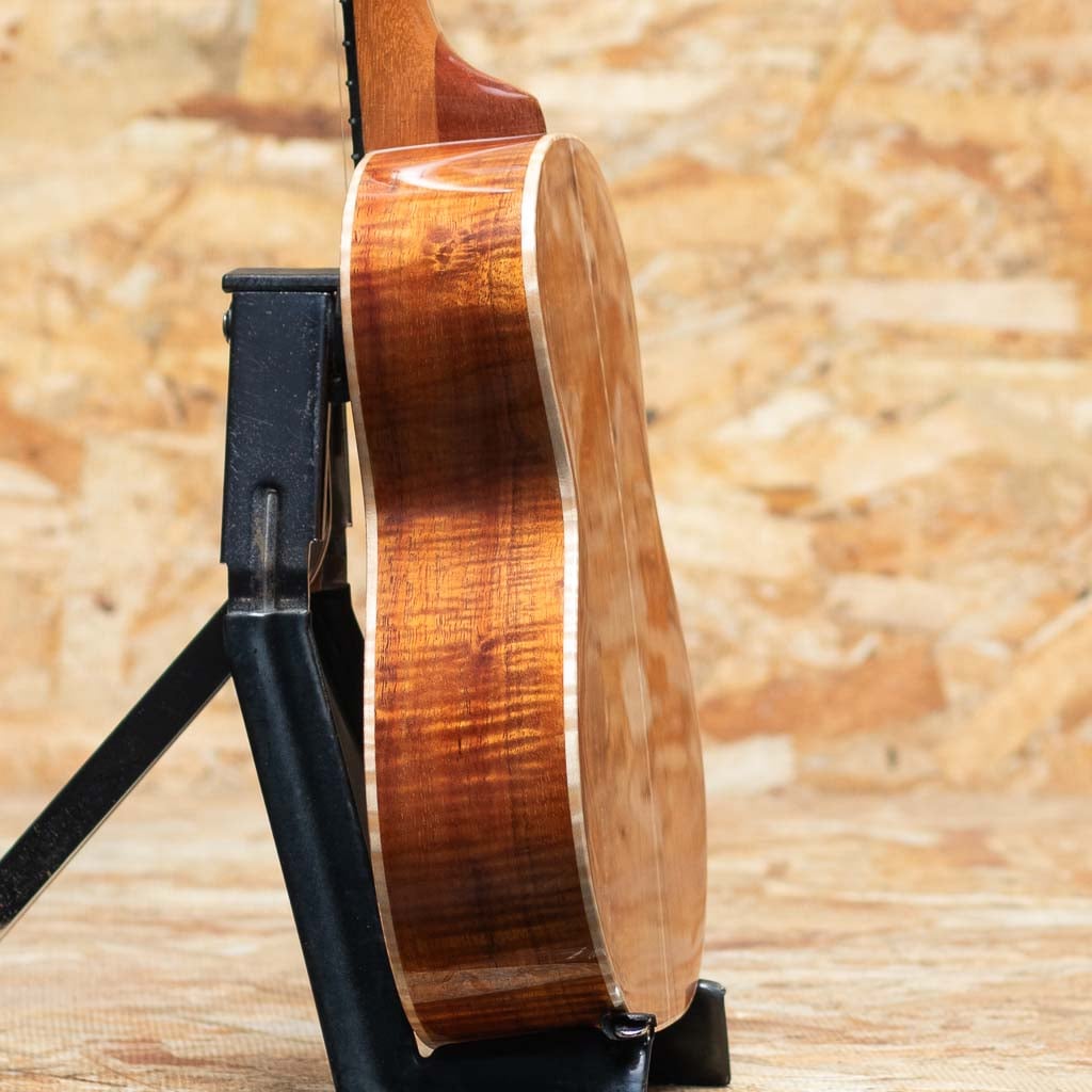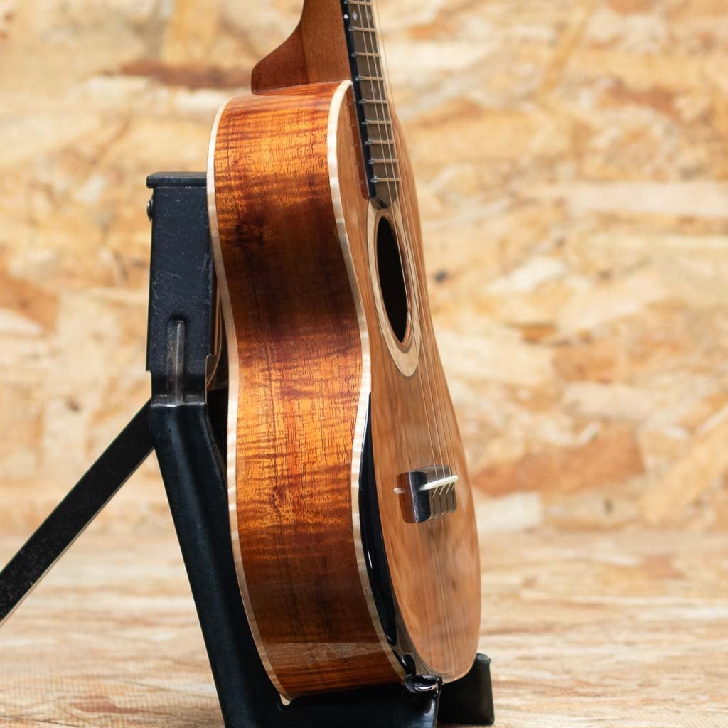 ロプリンジはアメリカ・フロリダ州にて、弦楽器職人”アーガスティノ・ロプリンジ”氏により生み出されるウクレレ。ロプリンジ氏は、マーティンやフェンダー等の弦楽器のデザインやコンサルティングを努め、多くの弦楽器職人を輩出。現在も材のこだわりと緻密な設計で名器を生み出しております。ハーブオオタサンなど、著名アーティスト達の愛器の内の1本としても知名度があります。現在は娘のドナ・ロプリンジと共に製作をされております。本器はハイグレードのハワイアンコア材を用いたカスタム仕様のコンサートモデル。マホガニーネック、エボニー指板&ブリッジ、ゴトーUPTペグ、ボディアームレスト加工。きれいなハワイアンコアとメイプルのロゼッタ・バインディングの落ち着いた高級感のあるルックスです。深みもあり、明るく抜けも良く、気持ちの良いサウンド。アームレスト加工でホールド時の負担を軽減し演奏性も良い1本です。近年、国内の流通も少ないロプリンジウクレレ。ハードケース付属です。