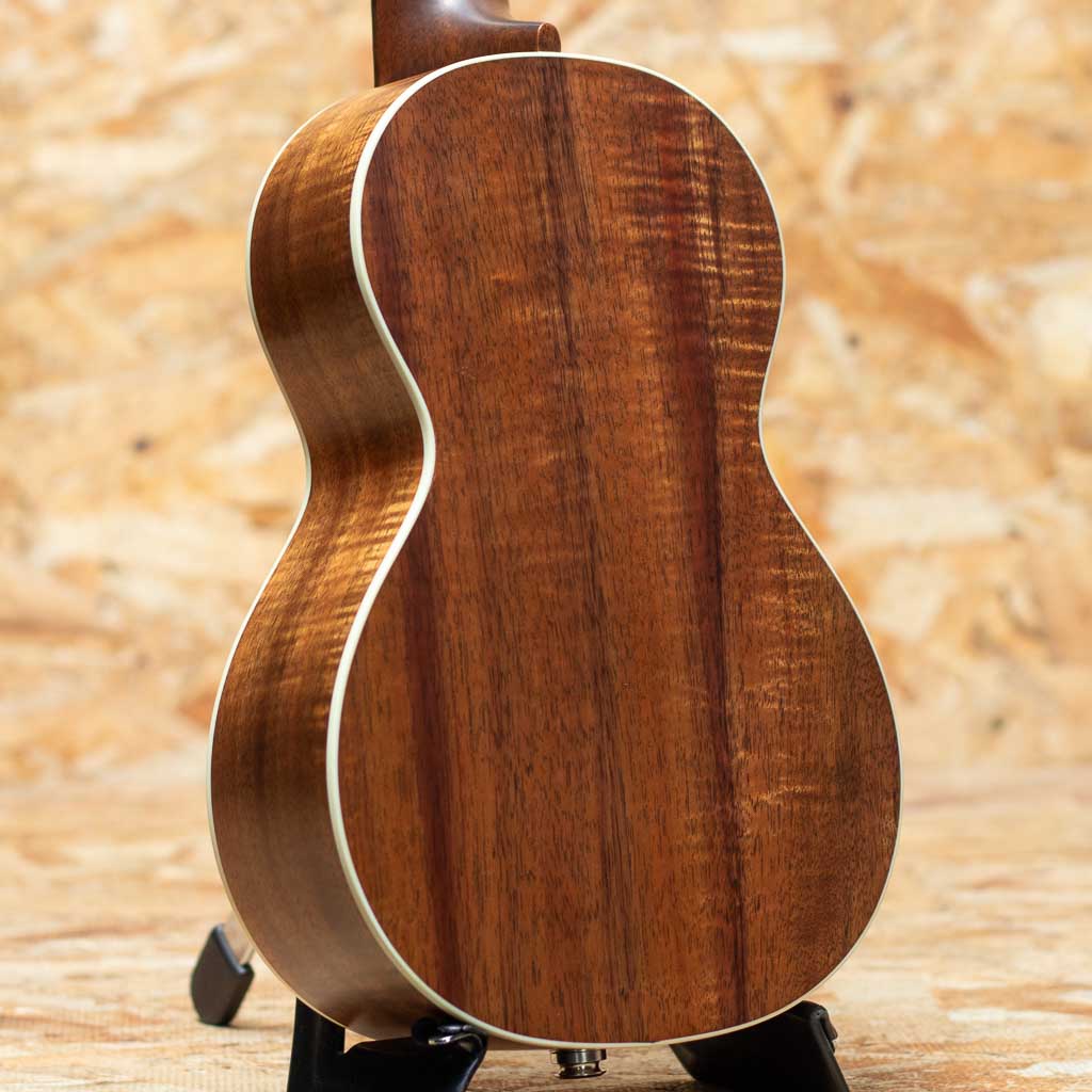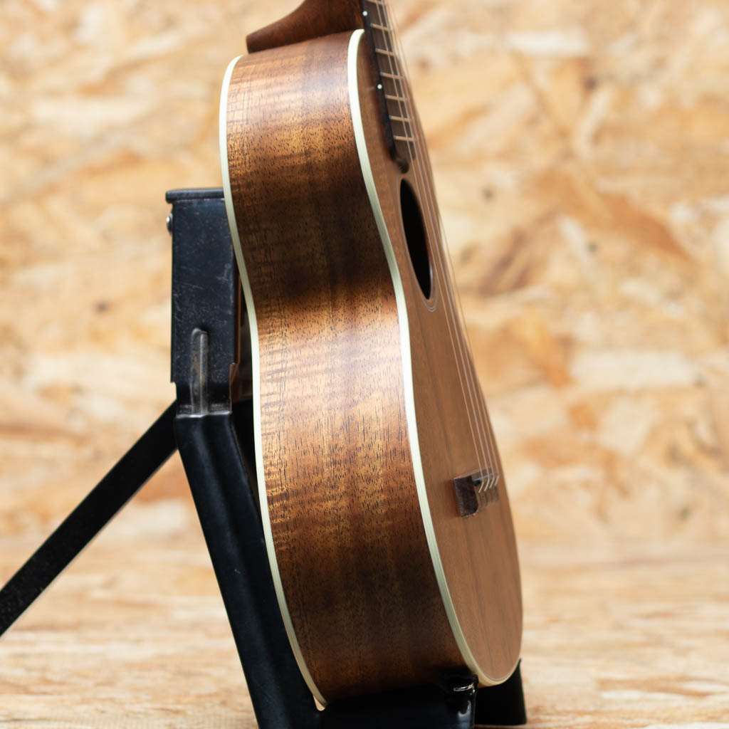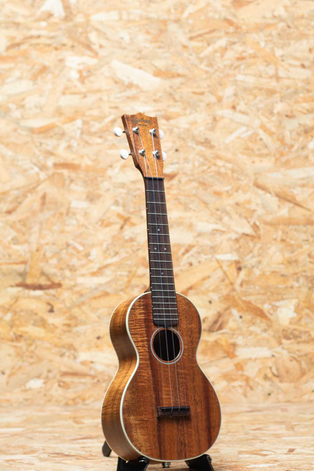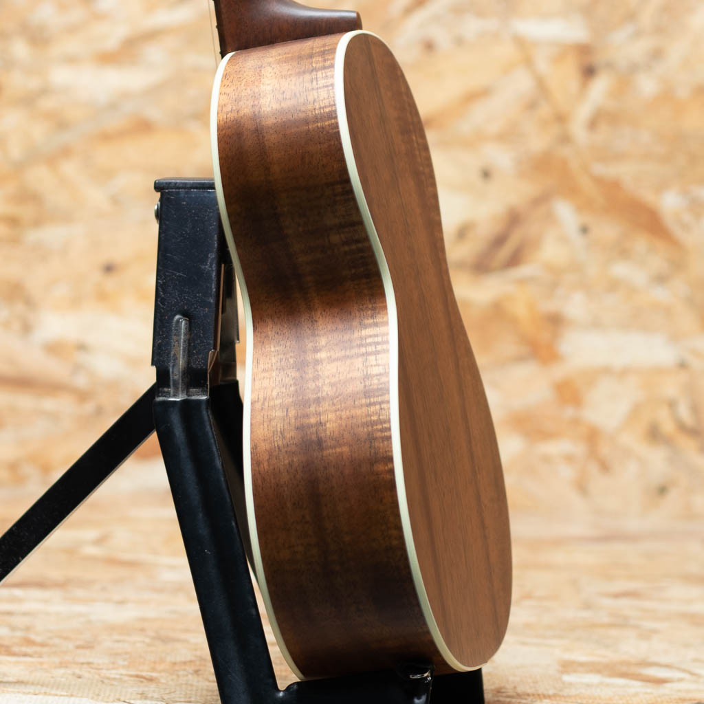 アメリカのギターブランドとして1800年代から製造を開始し、1920年代のハワイアンブームより一世を風靡し、ヴィンテージ市場でも人気の高いマーティン。本器は1920年から1933年ごろまで生産されていたStyle2Kを現工場にて復刻製造した"2K Concert”2020年製のUSED品です。ハワイアンコアボディ、ローズウッド指板&ブリッジ、スモールドット指板ポジション、アイボロイドバインディング、艶消しフィニッシュ、12フレットジョイント、17フレットトータル。しっかりとフィギャード杢の入った個体でルックスも抜群です。コアウッド独特の倍音感のある気持ちのいいトーンで、快活な立ち上がりと豊かな箱鳴りが印象的です。パッシブのコンタクトマイクが搭載されており、ライブや収録にも大活躍な一本です。ペグはグローバーシルバーペグへ交換がなされており、1.2弦のポスト周りのヘッド突板に木埋めの補修がありますが、使用に問題はございません。演奏にともなう軽微なスクラッチ傷はあるものの、上記を除けば大きな傷やダメージは見受けられずネックコンディションも良好。ソロ弾きなどにもおすすめのコンサートモデルです。オリジナルソフトケース付属。