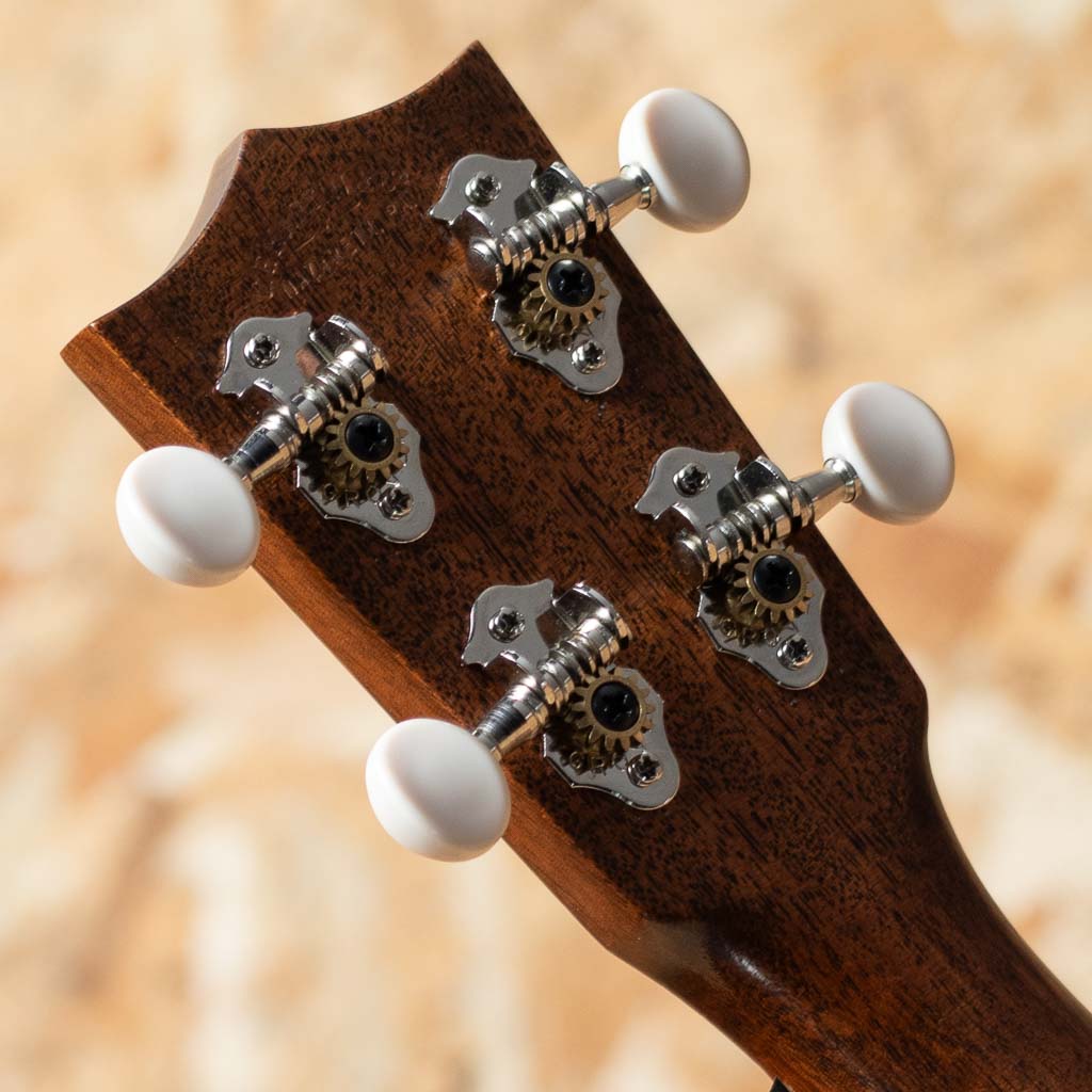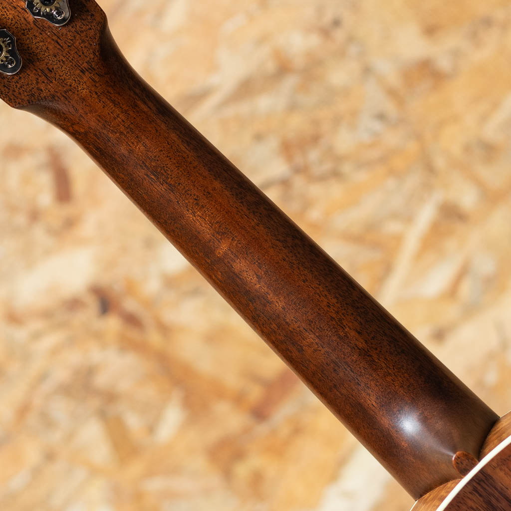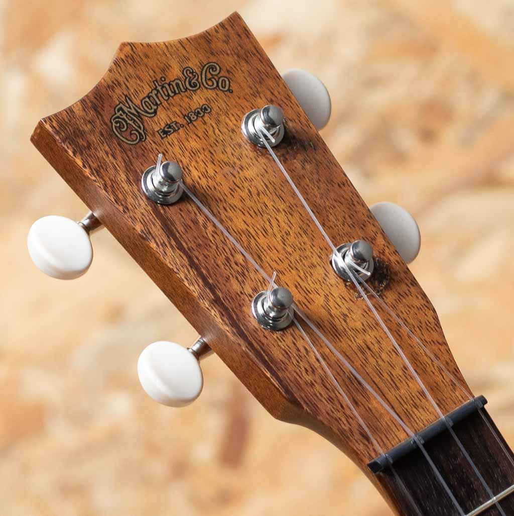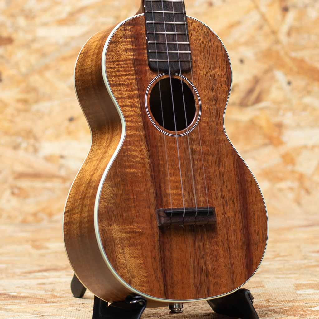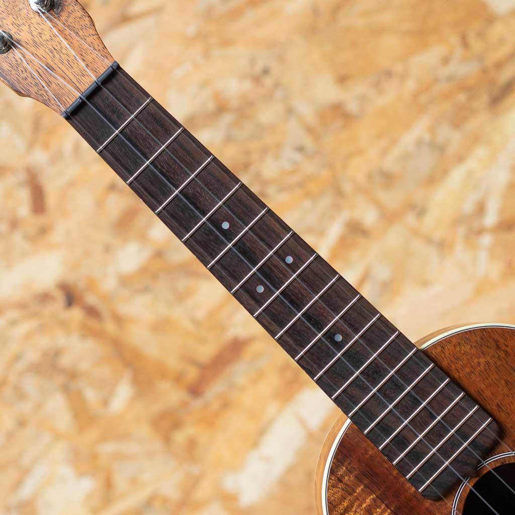 アメリカのギターブランドとして1800年代から製造を開始し、1920年代のハワイアンブームより一世を風靡し、ヴィンテージ市場でも人気の高いマーティン。本器は1920年から1933年ごろまで生産されていたStyle2Kを現工場にて復刻製造した"2K Concert”2020年製のUSED品です。ハワイアンコアボディ、ローズウッド指板&ブリッジ、スモールドット指板ポジション、アイボロイドバインディング、艶消しフィニッシュ、12フレットジョイント、17フレットトータル。しっかりとフィギャード杢の入った個体でルックスも抜群です。コアウッド独特の倍音感のある気持ちのいいトーンで、快活な立ち上がりと豊かな箱鳴りが印象的です。パッシブのコンタクトマイクが搭載されており、ライブや収録にも大活躍な一本です。ペグはグローバーシルバーペグへ交換がなされており、1.2弦のポスト周りのヘッド突板に木埋めの補修がありますが、使用に問題はございません。演奏にともなう軽微なスクラッチ傷はあるものの、上記を除けば大きな傷やダメージは見受けられずネックコンディションも良好。ソロ弾きなどにもおすすめのコンサートモデルです。オリジナルソフトケース付属。