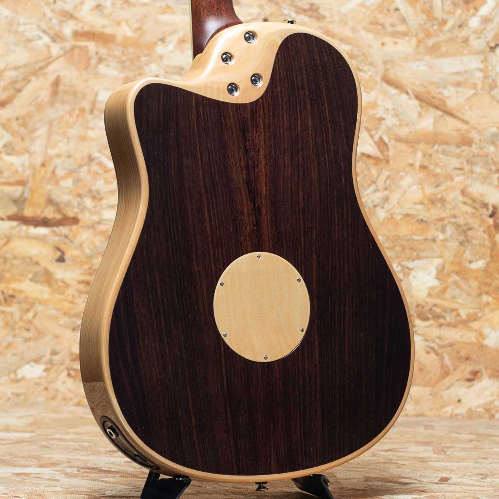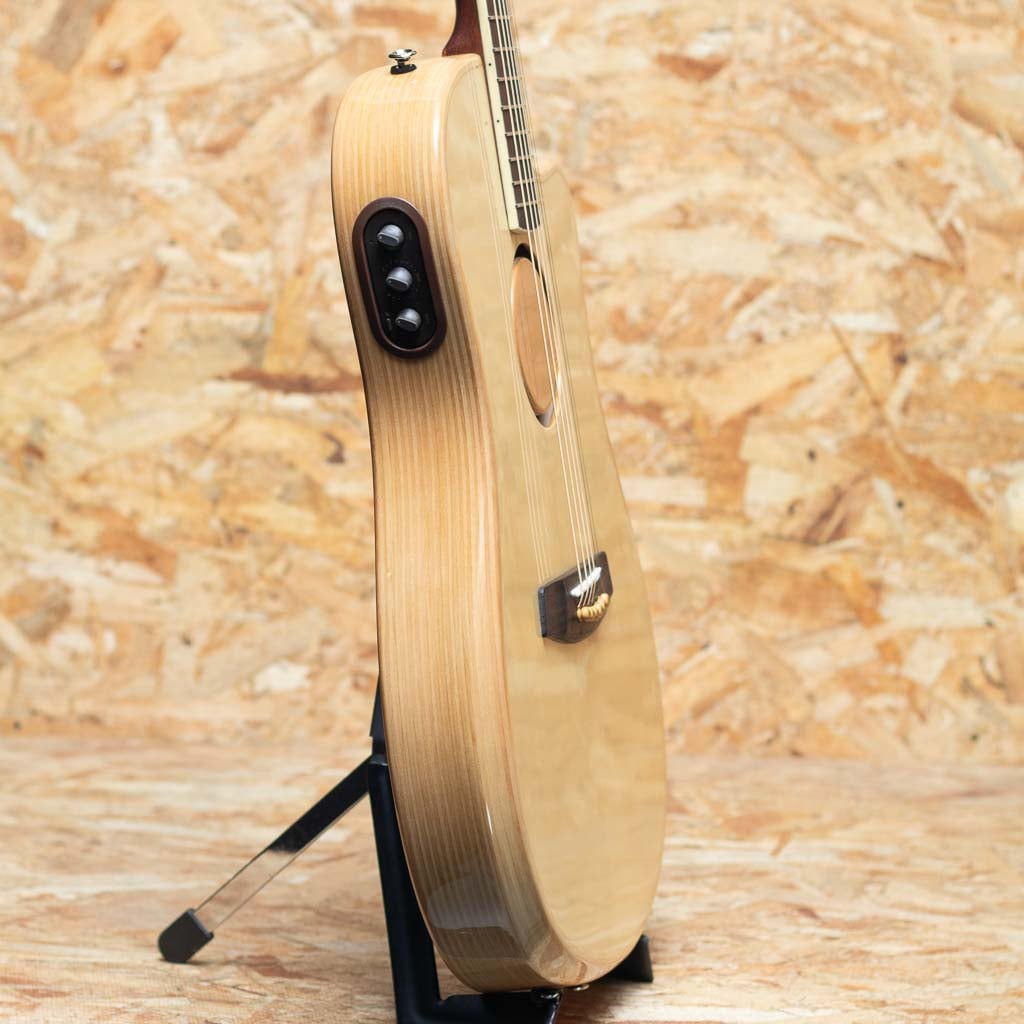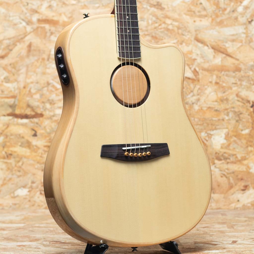 ピックアップには最新のHiFi Duetを採用。優れたバランス、トーン、明瞭度、ダイナミクスを持つHiFiブリッジ・プレート・センサーと、スタジオ・マイクに匹敵するSiloマイクで構成。コントロールは、マスター・ボリューム、ピックアップ/マイク・ブレンド、トーン、位相反転、バッテリーライフ・インジケーター。ステージ等でもダイレクトでナチュラルなサウンドを出力し、高いパフォーマンスを発揮します。トップ材は3種類の展開をしており、本器はイングルマン・スプルースのナチュラルカラーモデルです。