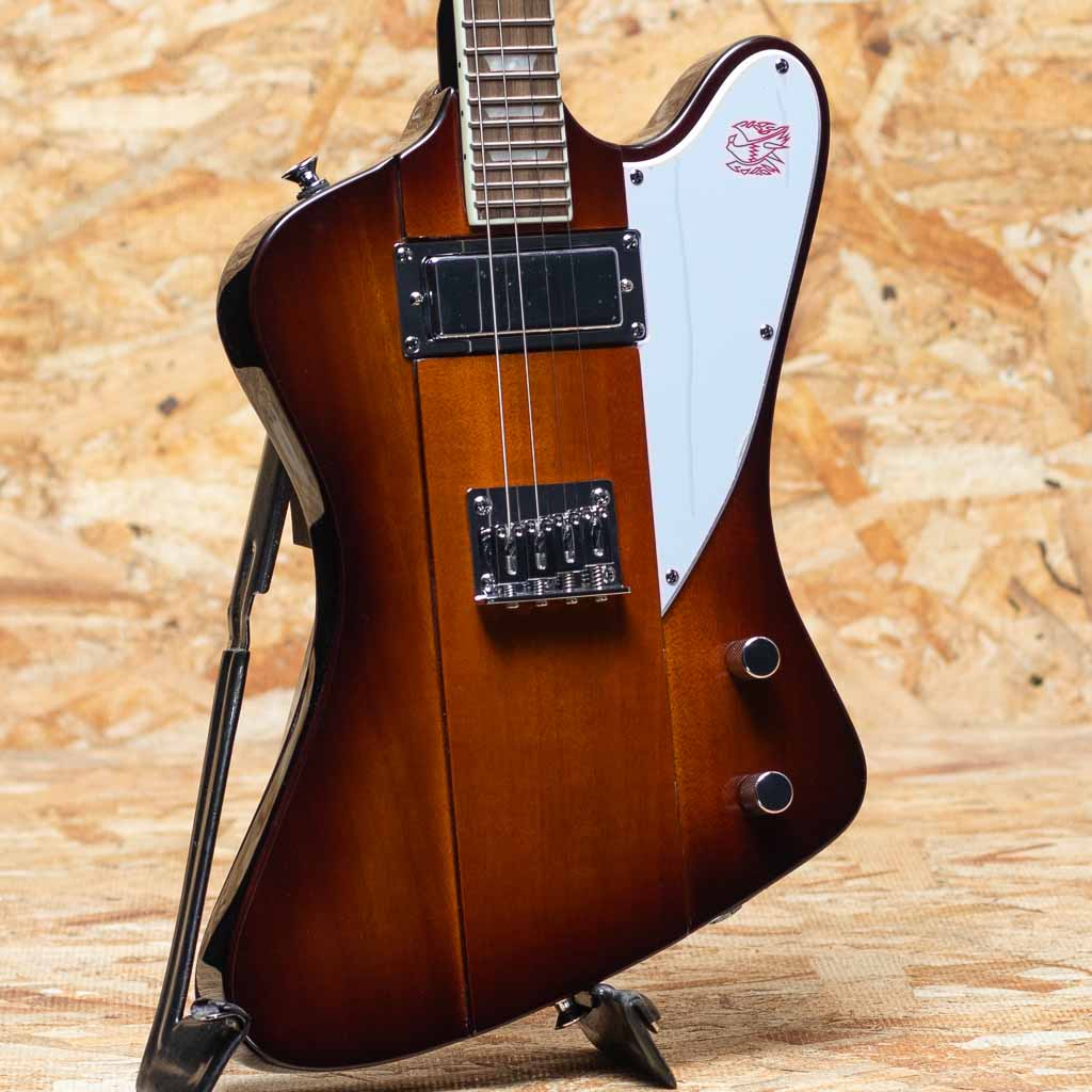 復活のマンドバード!その名のとおりファイアーバードのボディーシェイプをもつ4弦仕様のマンドバードはマグネットP.Uのエレクトリック・マンドリンです。リバース仕様 Firebirdを彷彿とさせるボディにはソリッドウッド、トラペゾイドインレイが施されたネックはボルトオン・ジョイント、ペグはGrover Mini Rotomaticを備えたReverse Firebirdスタイ ルのヘッドストック、ボディトップにマウントされた裏通しタイプのブリッジ、マグネットピックアップとマスターボリューム&トーンコントロール等を装備。 バンドなど大音量だと不利なマンドリン、これだと負けずに大音量で使用できます。ロック、ウエスタンスイング、ブルース、ジャンルを選ばず活躍できるでしょう。オリジナルギグバッグも付属