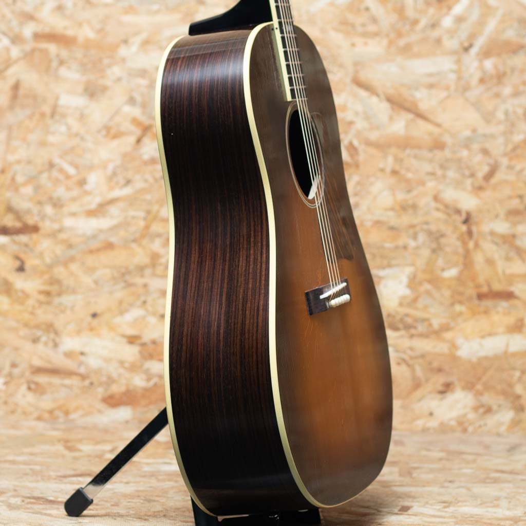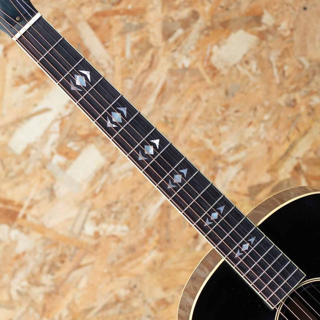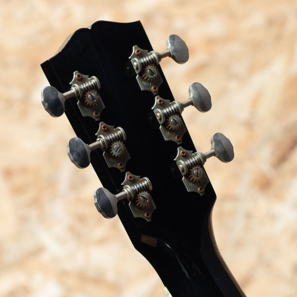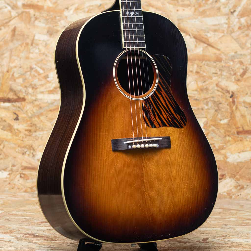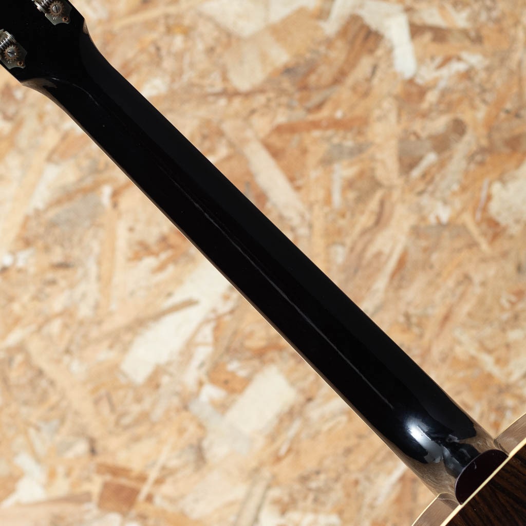 1934年、初のラウンドショルダーボディ採用モデル”Jumbo”が発売され、 その発展系のモデルとして”Advanced Jumbo”は1935年~1940年の間のみ製造された”Advanced Jumbo”の復刻モデル。本器は話題のMurphy Lab Seriesよりリリースされた”1936 Advanced Jumbo Ultra Light Aged”。サーマリーエイジドアディロンダックレッドスプルーストップ(木材を熱と圧力による加工でエイジング処理を行い経年した様な質を特性に持つスプルースで、ビンテージギターのようなトーンを生み出すことに成功しています)、スキャロップブレーシングにもアディロンダックスプルースを用いてニカワ接着しています。ローズウッドサイドバック、レクタングルブリッジにロングサドル、スクリプトロゴ、ファイアーストライプピックガード、Waverlyチューナー、43.8mm幅のネックでやや厚みを持たせた緩やかなVシェイプを採用しています。スケールは647.7mmのロングスケール。塗装のウェザーチェックやペグのくすみ等、新品ながらリアルヴィンテージの様なシャビーな雰囲気をもっています。ひとたび弾いてみるとサーマリーエイド処理が施されたアディロンダックレッドスプルースの躍動した響きが瞬時に伝わってくると思います。ロングスケールにローズウッドサイドバックでよりタイトで重厚な低域をもち、クリスピーで瞬発力に優れた力強い鳴りが印象的です。