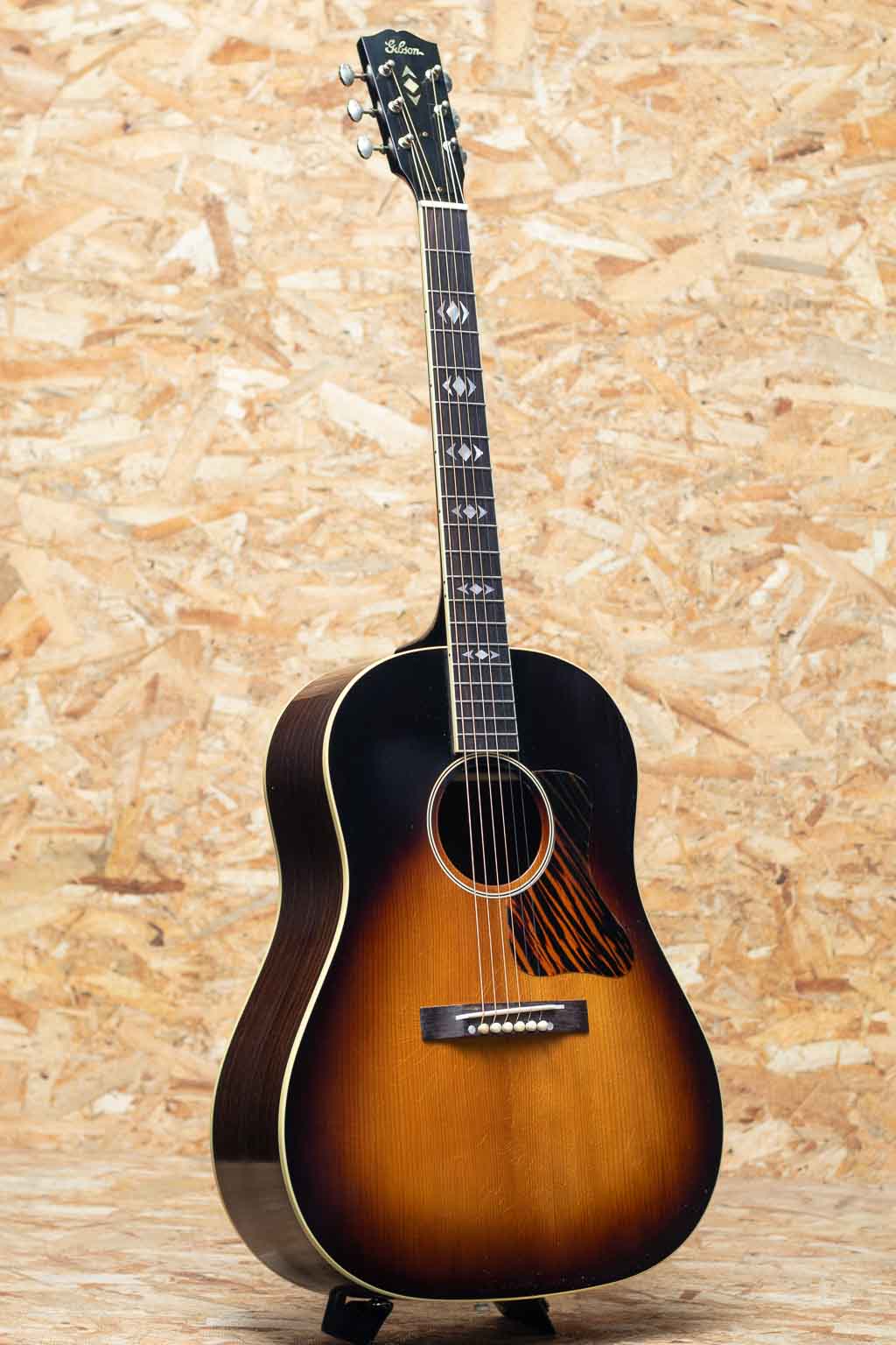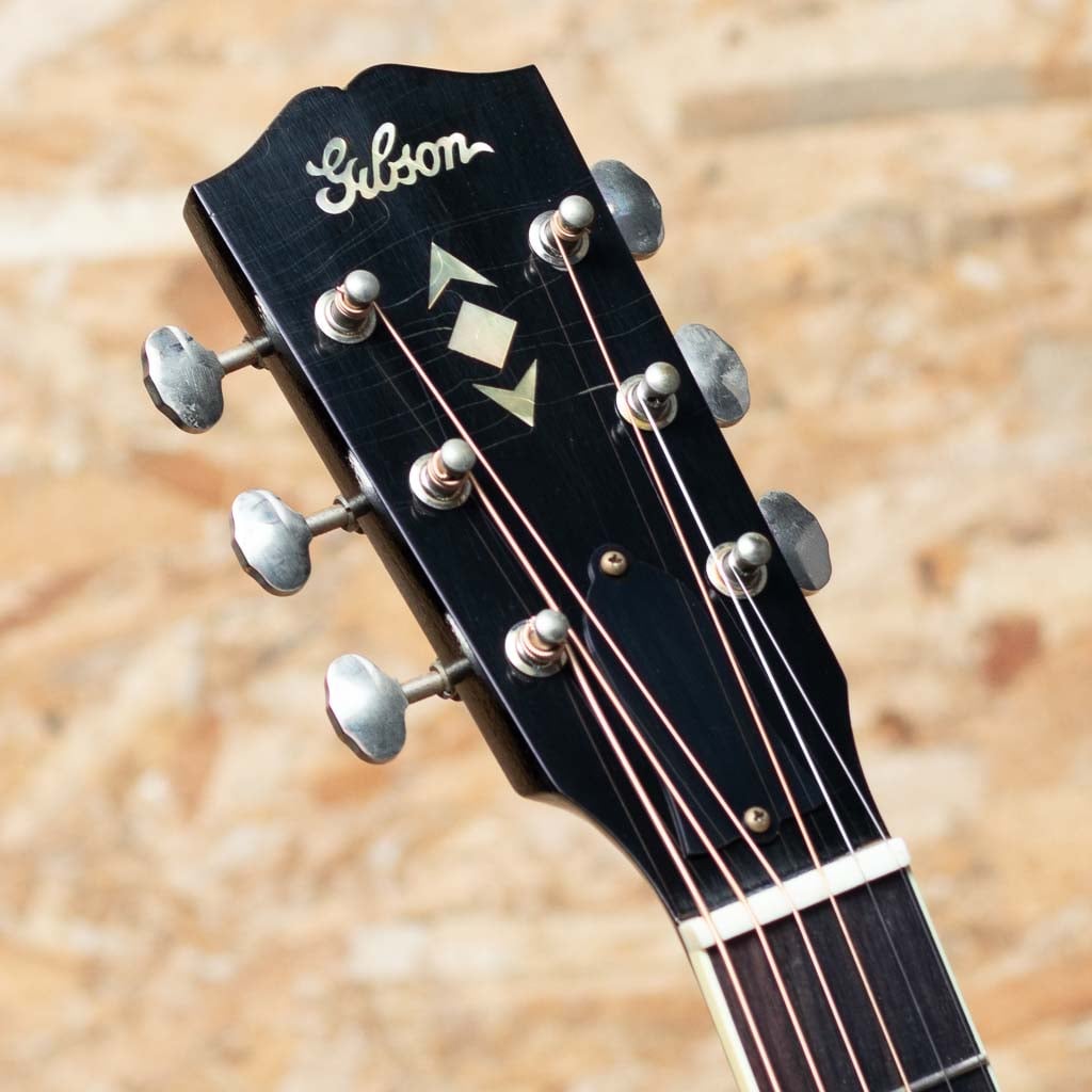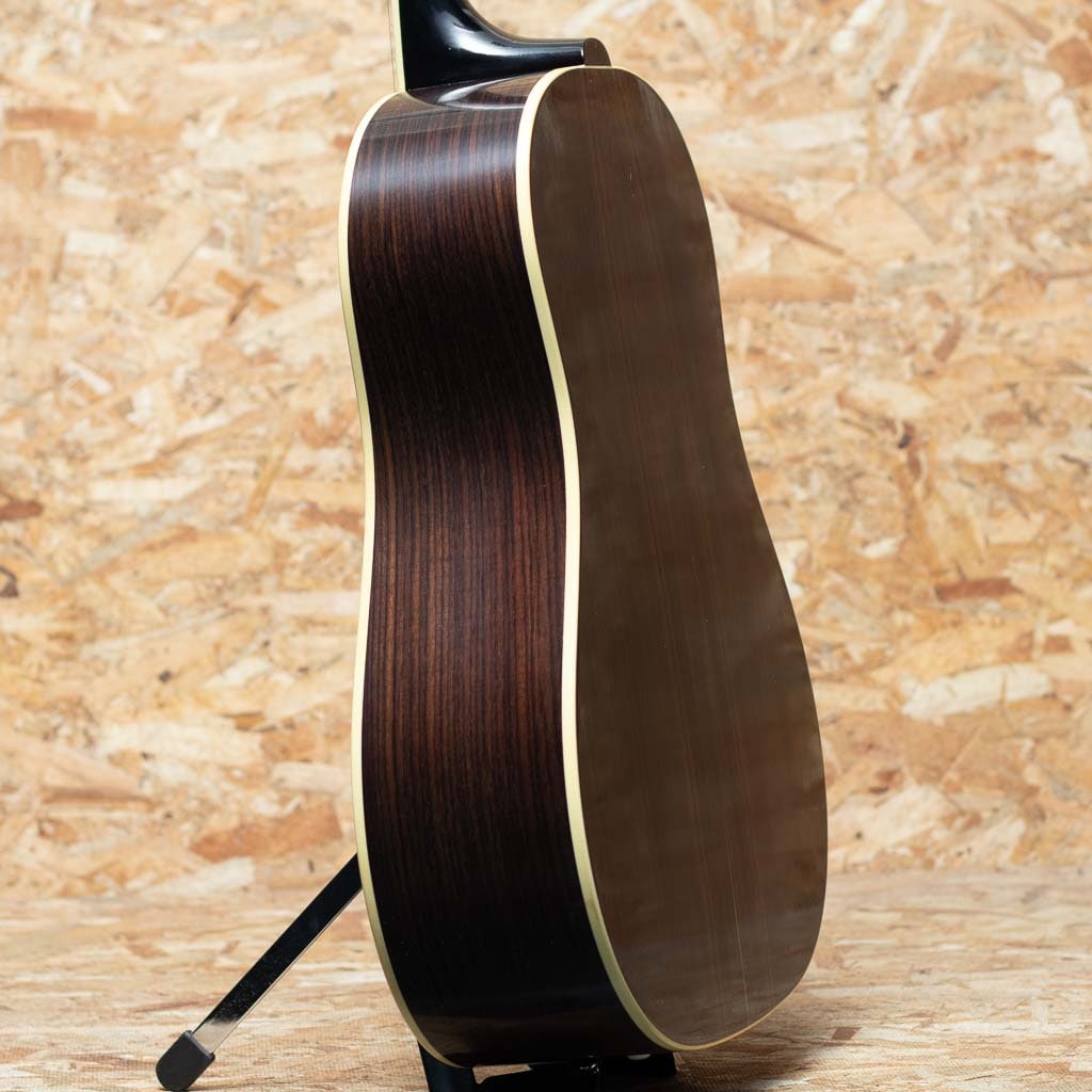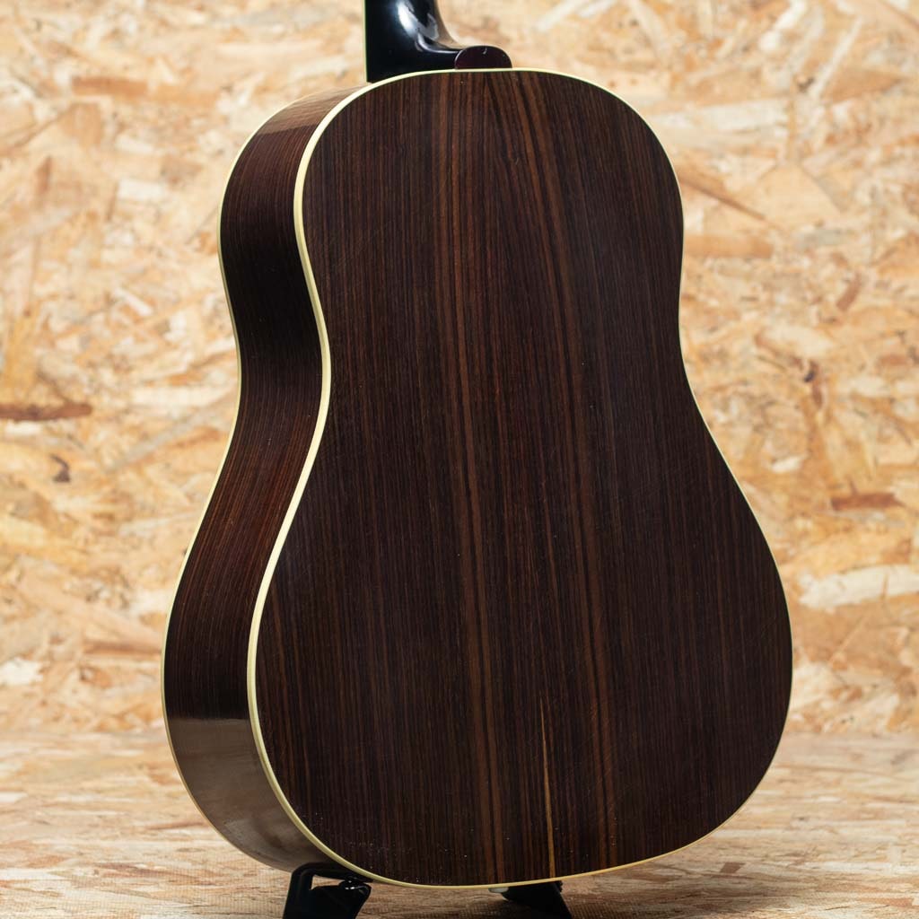 1934年、初のラウンドショルダーボディ採用モデル”Jumbo”が発売され、 その発展系のモデルとして”Advanced Jumbo”は1935年~1940年の間のみ製造された”Advanced Jumbo”の復刻モデル。本器は話題のMurphy Lab Seriesよりリリースされた”1936 Advanced Jumbo Ultra Light Aged”。サーマリーエイジドアディロンダックレッドスプルーストップ(木材を熱と圧力による加工でエイジング処理を行い経年した様な質を特性に持つスプルースで、ビンテージギターのようなトーンを生み出すことに成功しています)、スキャロップブレーシングにもアディロンダックスプルースを用いてニカワ接着しています。ローズウッドサイドバック、レクタングルブリッジにロングサドル、スクリプトロゴ、ファイアーストライプピックガード、Waverlyチューナー、43.8mm幅のネックでやや厚みを持たせた緩やかなVシェイプを採用しています。スケールは647.7mmのロングスケール。塗装のウェザーチェックやペグのくすみ等、新品ながらリアルヴィンテージの様なシャビーな雰囲気をもっています。ひとたび弾いてみるとサーマリーエイド処理が施されたアディロンダックレッドスプルースの躍動した響きが瞬時に伝わってくると思います。ロングスケールにローズウッドサイドバックでよりタイトで重厚な低域をもち、クリスピーで瞬発力に優れた力強い鳴りが印象的です。