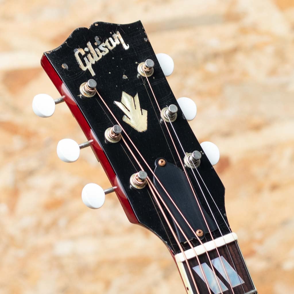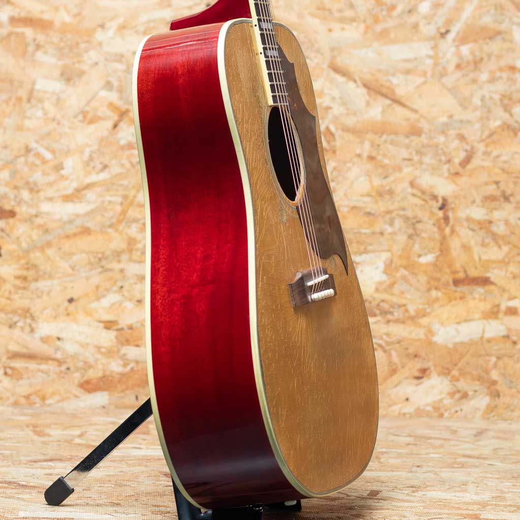 ギブソンフラットトップの上位機種"Southern Jumbo"のナチュラルカラーバリエーションである"Country Western"。既に発売されていたサザンジャンボのナチュラルカラーとして生まれ、その後の仕様変更も同じように経てきたモデルです。本器は待望の Murphy Lab の Heavy Aged シリーズより登場した”1963 Country Western Heavy Aged”。サーマリースプルーストップ、マホガニーサイド&バック、マホガニーネック、ローズウッド指板&ブリッジ、ダブルパラレログラム指板インレイ、ダブルリングロゼッタ、スキャロップドXブレイシング、スモークドナチュラルフィニッシュ。ギブソン・カスタムショップの「マーフィー・ラボ」にてエイジングの第一人者であるトム・マーフィーと彼の率いるチームが最新の技術を駆使して特殊な「エイジング」技術をほどこしたこちらのモデルはウェザーチェックや金属パーツのエイジングなど経時変化、そして弾き込まれてきたヴィンテージギターならではの弾き傷や打痕までを再現。また、外観だけではなくトップのスプルース材にサーマリーエイジド処理がなされたことにより、ギブソンらしい無骨さやワイルドさのある太いサウンドにカラッとした枯れた音のニュアンスを存分にご堪能していただけます。