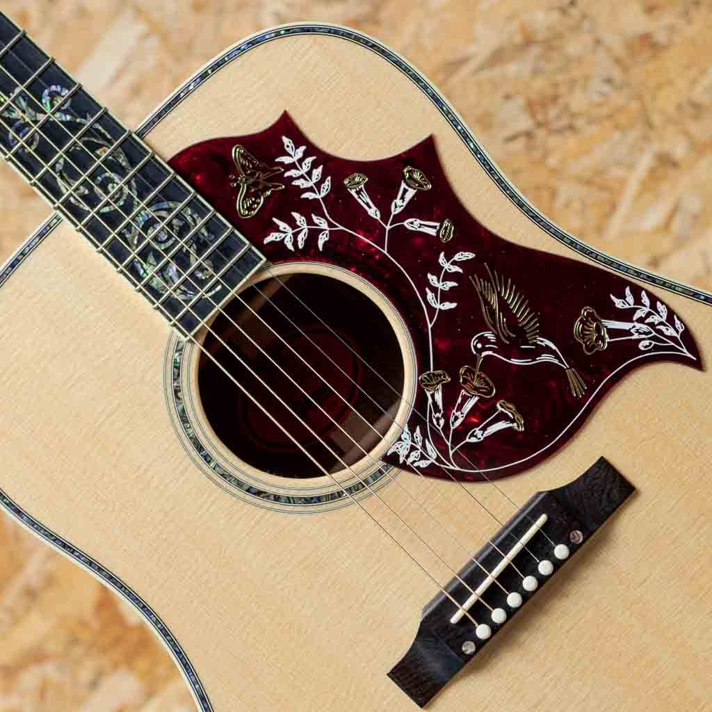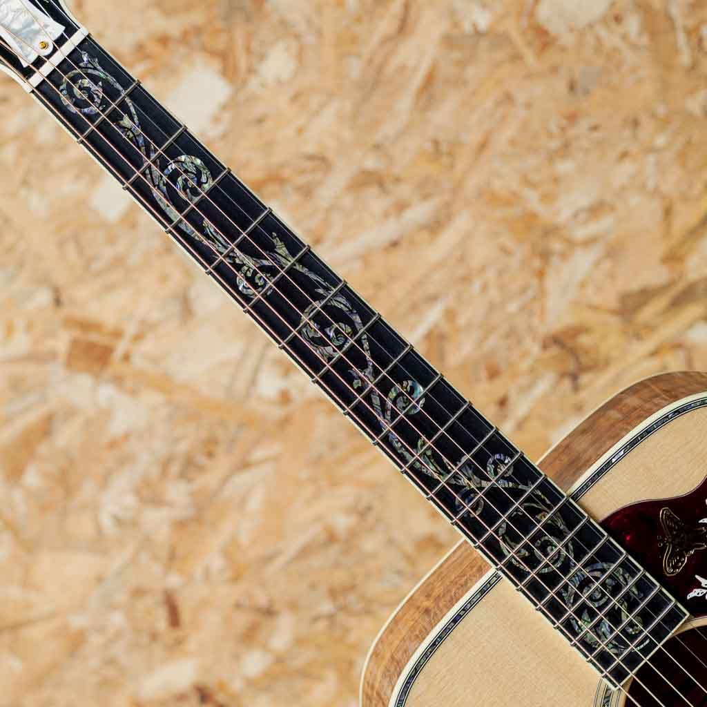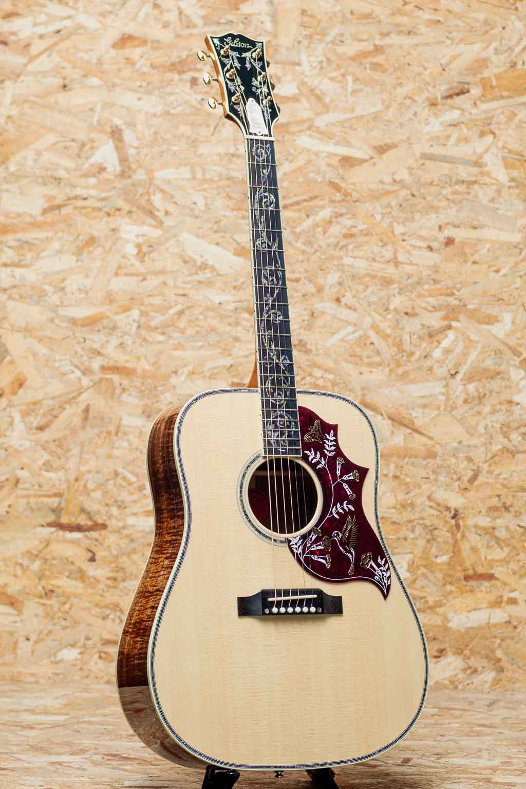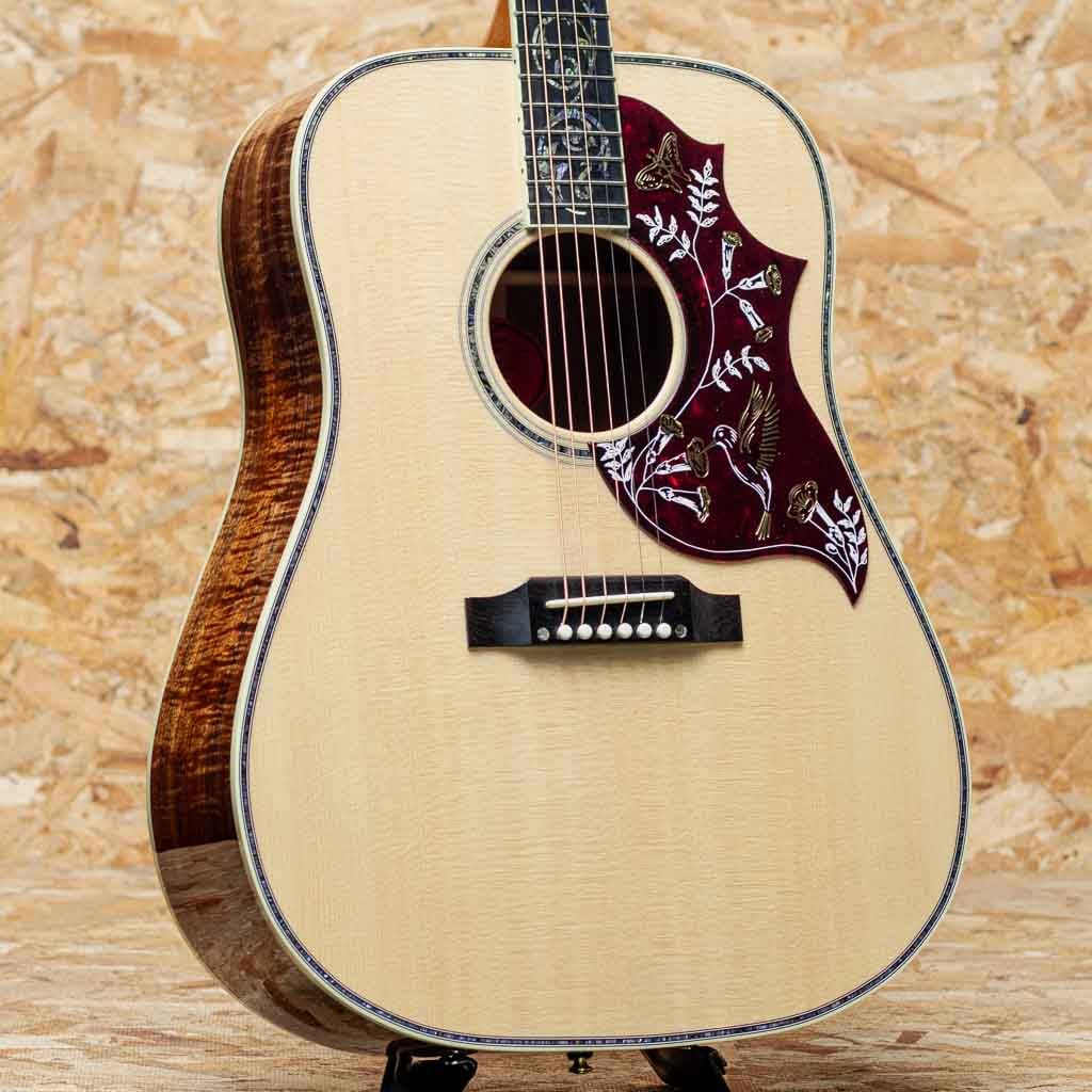 1960年の発売以来、ギブソンスクエアショルダーボディの定番モデルとして人気を博しているハミングバード。ハチドリを象ったピックガードを始め個性的なルックスを持ったモデルです。本器はハミングバードモデルの最高峰"Hummingbird Ultima"をベーシックにギブソンアコースティックで出来る限りのスペシャルを施したモデル。近年のギブソンでは久しくお目にかかれていない群を抜いて豪華絢爛に仕上げられたスペシャルなモデルです。スプルーストップ、サイド&バックに厳選されたフィギャードのハワイアンコアを使用。マホガニーネック、エボニー指板&ブリッジ、ウェーバリー製ゴールドカラーオープンギアペグ、手作業にて仕上げられたオリジナルハミングバードデザインピックガード、アバロンスクリプトロゴ、アバロンヴァインヘッドストック&指板インレイ、アバロンロゼッタ&トリム&バックストリップ、スキャロップドXブレイシング。美しく仕上げられたヴァインインレイ。アバロンの濃淡を細かく使い分け自然な植物の色味を表し、派手やかさと幻想さを表現、カスタムモデルの中でも最高峰に位置する本器だからこその仕上がりです。ヘッド裏にはさりげなく200年を記念した1825-2025シェルバナーが配置されておりおしゃれです。スクエアショルダーらしく広がりのあるエアリーな響き、通常のマホガニーと異なりハワイアンコアが持つリッチでクリアな響きは他の同モデルにはない特徴です。演奏のタッチに応じての表現力も高く、ふくよかでエッジの効いた快活なサウンドや甘さの増したメロウなトーンなど演技派な一面も持ち合わせます。厳選された良質な材料と確かな木工から成る完成度の高いギター、音色を奏でる道具としてはもちろんですが、ステージでも一際輝く存在そして部屋の飾りとしても様になる芸術品といえる1本。まさに究極ともいえる最高峰のハミングバードです。200thを明記した認定書付属。