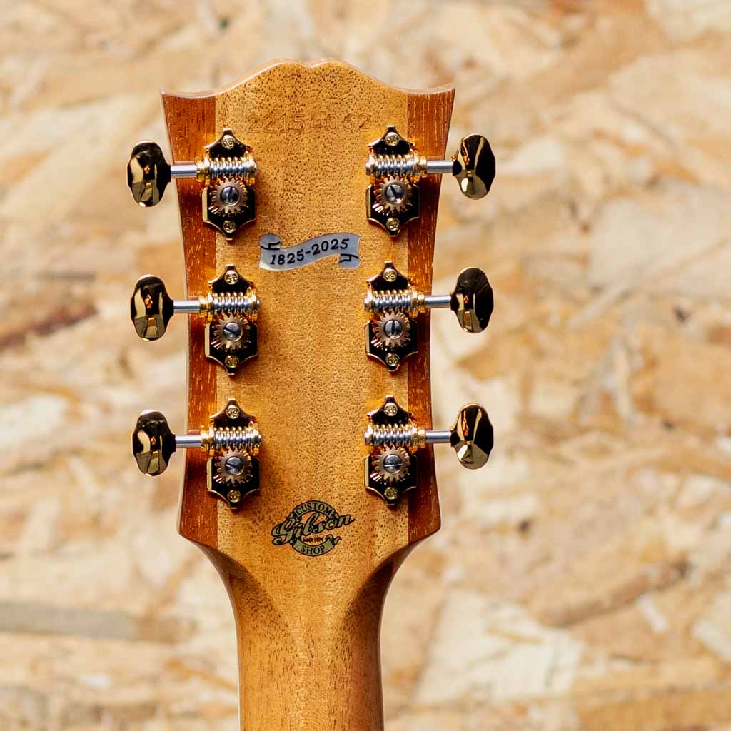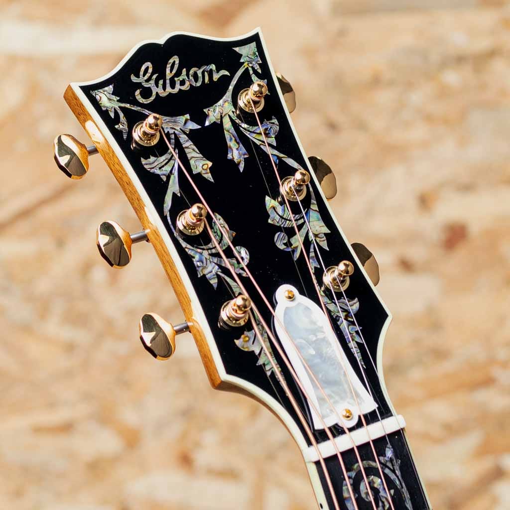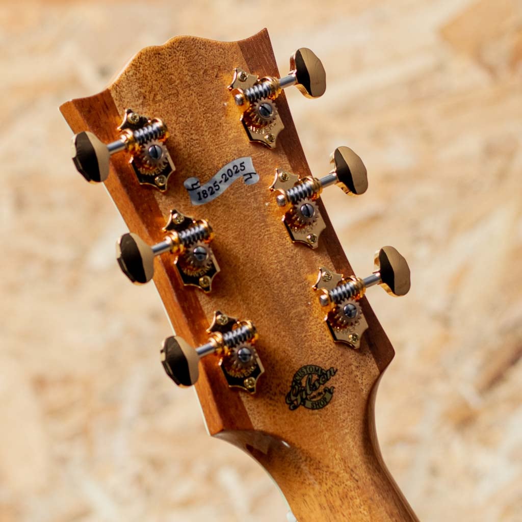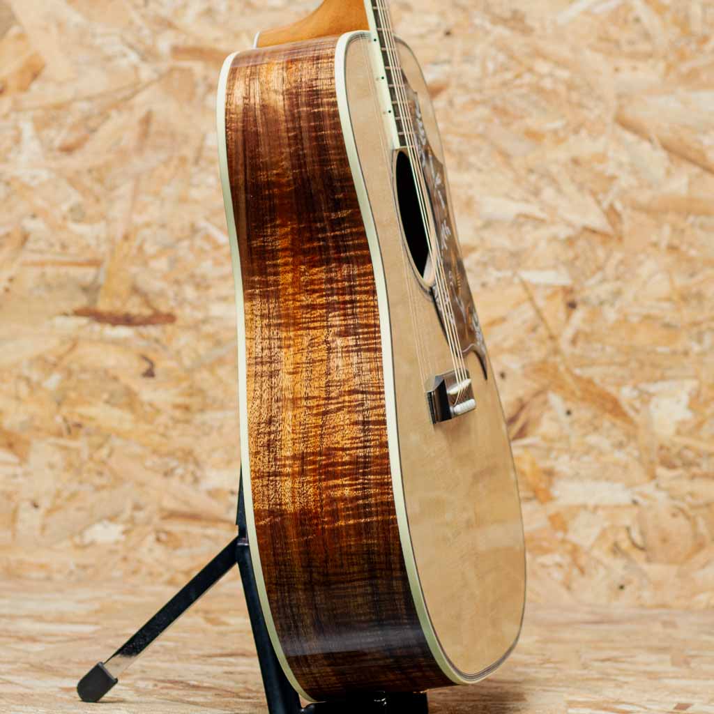 1960年の発売以来、ギブソンスクエアショルダーボディの定番モデルとして人気を博しているハミングバード。ハチドリを象ったピックガードを始め個性的なルックスを持ったモデルです。本器はハミングバードモデルの最高峰"Hummingbird Ultima"をベーシックにギブソンアコースティックで出来る限りのスペシャルを施したモデル。近年のギブソンでは久しくお目にかかれていない群を抜いて豪華絢爛に仕上げられたスペシャルなモデルです。スプルーストップ、サイド&バックに厳選されたフィギャードのハワイアンコアを使用。マホガニーネック、エボニー指板&ブリッジ、ウェーバリー製ゴールドカラーオープンギアペグ、手作業にて仕上げられたオリジナルハミングバードデザインピックガード、アバロンスクリプトロゴ、アバロンヴァインヘッドストック&指板インレイ、アバロンロゼッタ&トリム&バックストリップ、スキャロップドXブレイシング。美しく仕上げられたヴァインインレイ。アバロンの濃淡を細かく使い分け自然な植物の色味を表し、派手やかさと幻想さを表現、カスタムモデルの中でも最高峰に位置する本器だからこその仕上がりです。ヘッド裏にはさりげなく200年を記念した1825-2025シェルバナーが配置されておりおしゃれです。スクエアショルダーらしく広がりのあるエアリーな響き、通常のマホガニーと異なりハワイアンコアが持つリッチでクリアな響きは他の同モデルにはない特徴です。演奏のタッチに応じての表現力も高く、ふくよかでエッジの効いた快活なサウンドや甘さの増したメロウなトーンなど演技派な一面も持ち合わせます。厳選された良質な材料と確かな木工から成る完成度の高いギター、音色を奏でる道具としてはもちろんですが、ステージでも一際輝く存在そして部屋の飾りとしても様になる芸術品といえる1本。まさに究極ともいえる最高峰のハミングバードです。200thを明記した認定書付属。