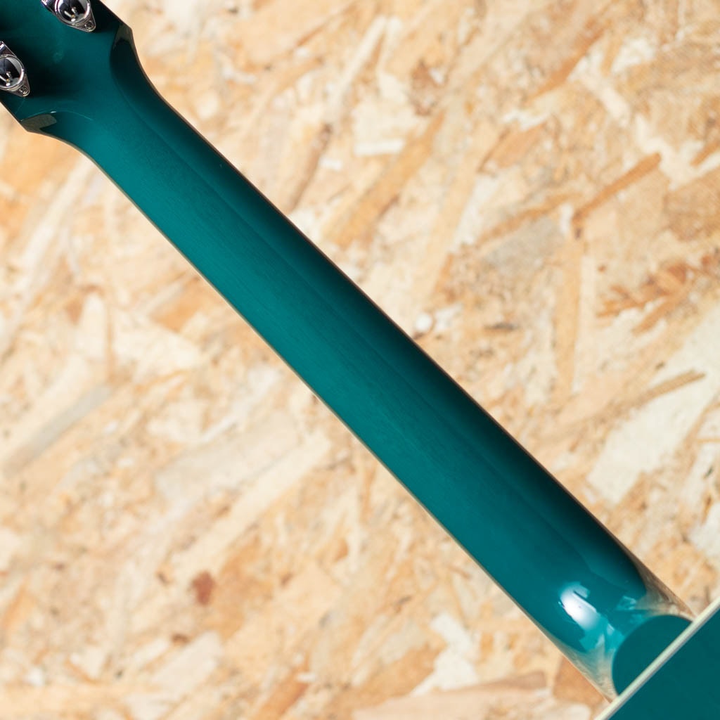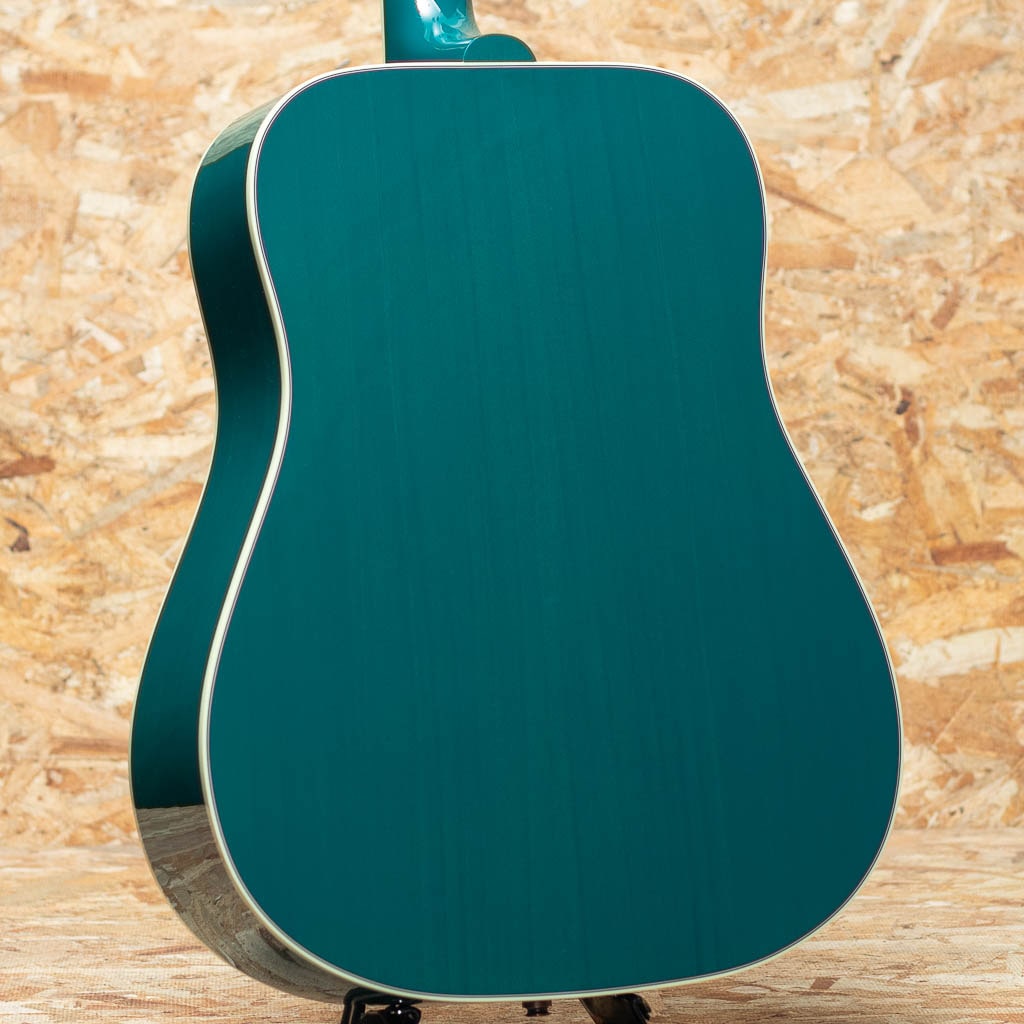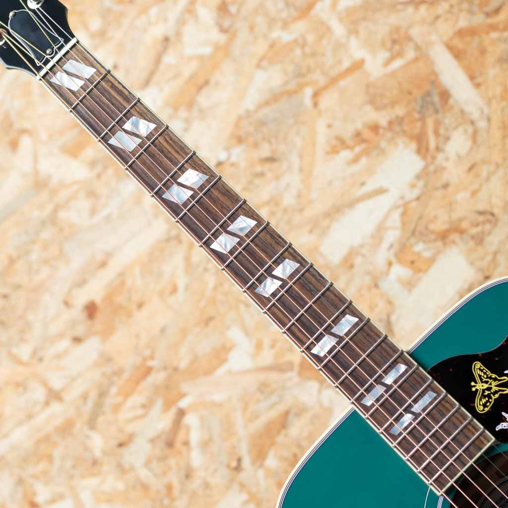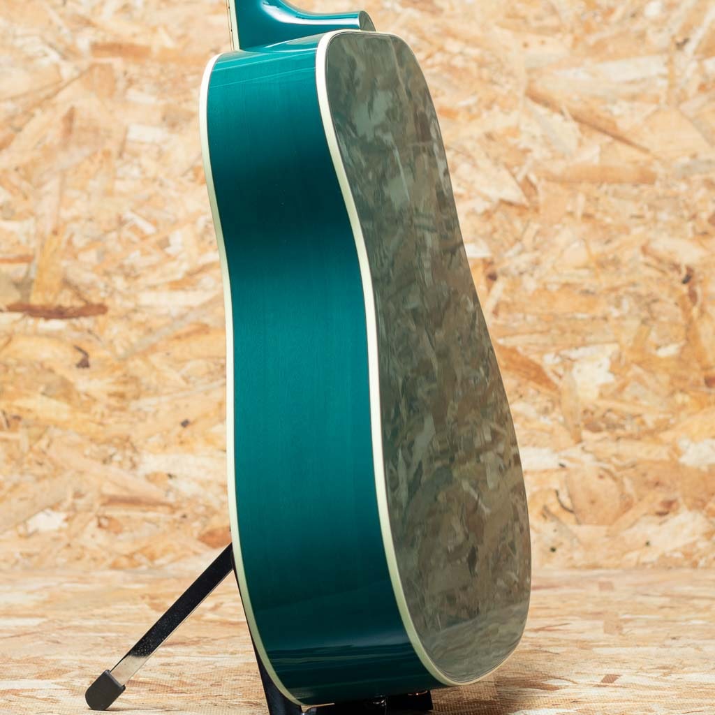1960年の発売以来、ギブソンスクエアショルダーボディの定番モデルとして人気を博しているハミングバード。ハチドリを象ったピックガードを始め個性的なルックスを持ったモデルです。本器は新たに加わった"トランスルーセント・ティール"カラー。シトカスプルーストップ、マホガニーサイド&バック、マホガニーネック、ローズウッド指板&ブリッジ、ダブルパラレログラムパール指板インレイ、オリジナルピックガード、グローバーペグ、ビンテージサンバーストカラーフィニッシュ。ギブソンスクエアショルダーの代表的な機種として挙げられることも多い本器。丸みを帯びた演奏性の高いラウンドネックシェイプ、パールのダブルパラレログラムインレイやクラウンインレイにピックガードなどの個性的なルックスが光るモデルです。スクエアショルダーのやや広がりのあるサウンドにマホガニーの柔らかく甘さのあるサウンドが持ち味です。切れ味のあるカッティングから繊細なフィンガーまで対応できる音色。幅広いジャンル、スタイルで活躍してくれる1本となること間違いなしです。ピックアップにはL.R Baggs Element VTCを搭載。アンダーサドルで音の芯を拾い、柔らかさのある低音から伸びやかな高音域まで幅広くピックアップ。コントローラーもボリューム、トーンのみと非常にシンプルな構成でセッティングに迷うことも少ないです。ライブや宅録、配信まで対応できる即戦力の1本。伝統的なモデルの現代版、より実戦仕様へと仕上がったギブソンスクエアショルダーモデルです。その人気の高さ、ルックスやサウンドを是非ご体感下さいませ。オリジナルハードケースが付属します。