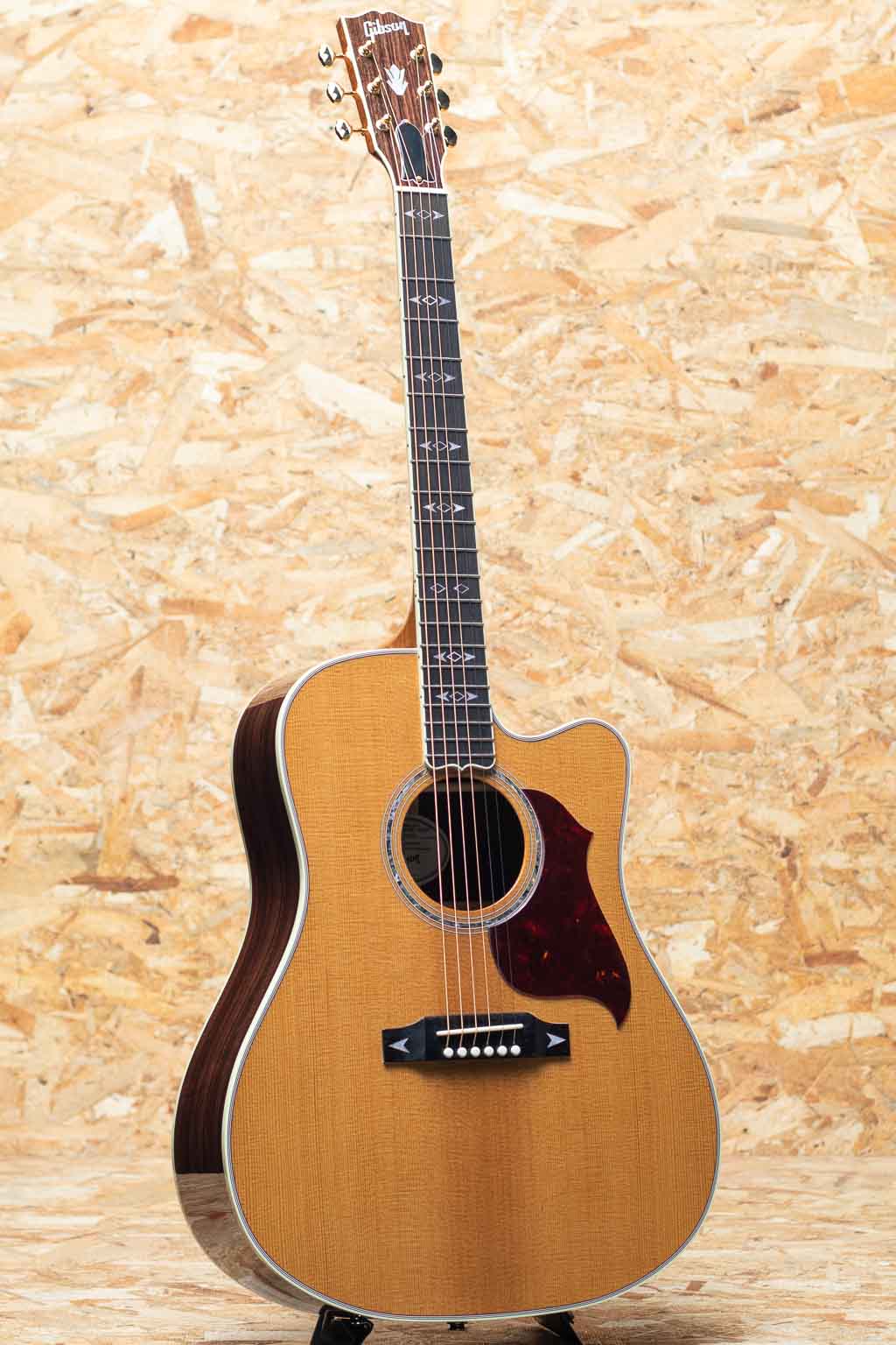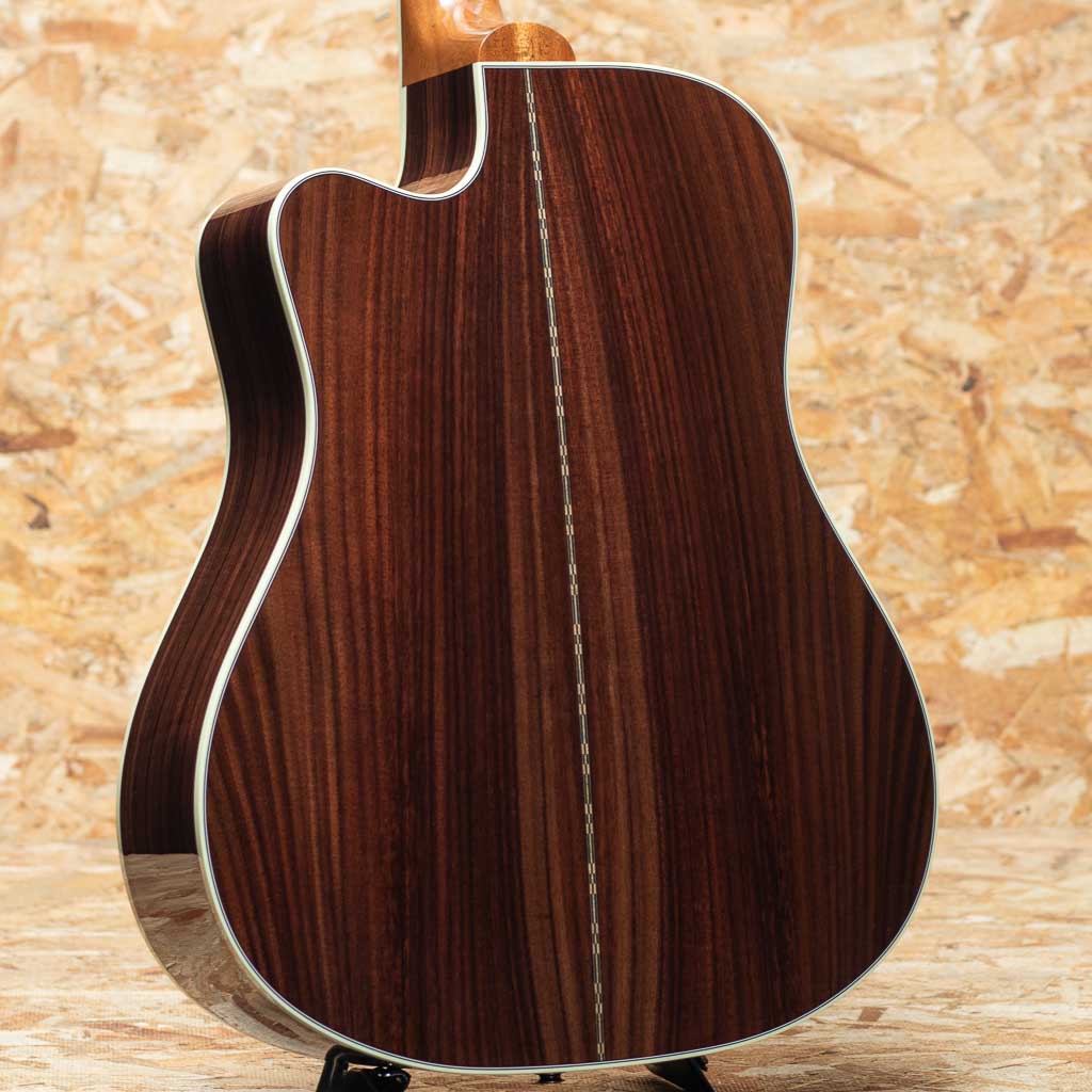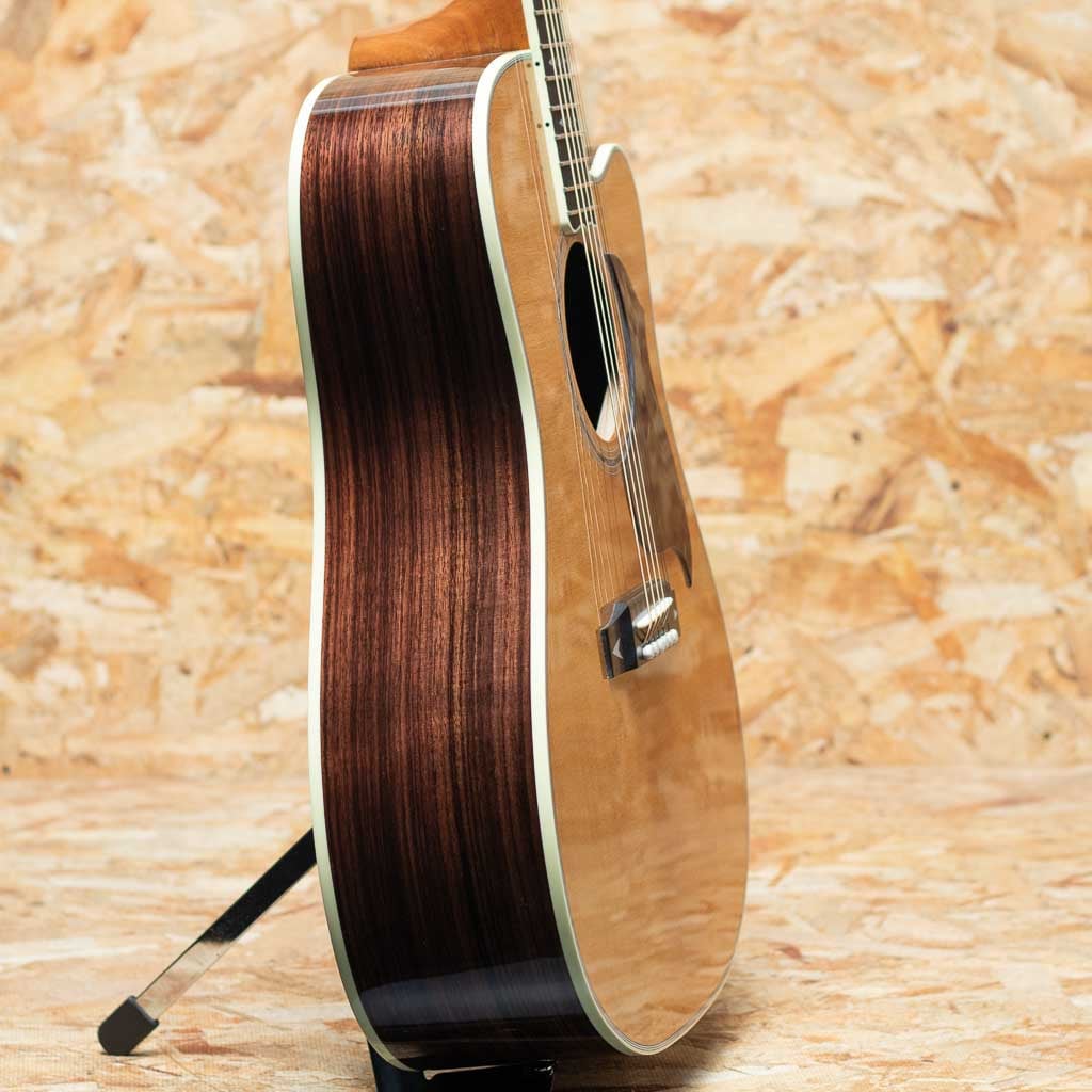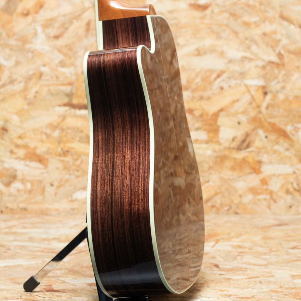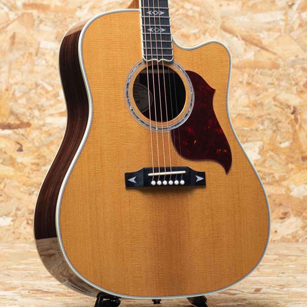 1990年代後半に登場したソングライター・モデル。本器は、”Songwriter Recording Artist EC”。カッタウェイを持つスクエアーショルダーボディーに、1930年代ギブソンの由緒あるブレーシング・パターンを融合させ、パワフルかつダイナミックな鳴りを実現したユニークなドレッドノートモデル。サマリーエイジドシトカスプルーストップ、ローズウッドサイド&バック、エボニー指板、アロー・インレイ入りエボニーブリッジ、ダイヤモンド・アイ・指板インレイ、太めでインパクトのあるアバロンロゼッタ、L.R.Baggs HiFi搭載。フルスケールならではの素早いレスポンスとレンジ感の広さ、重さのある低音や煌びやかな倍音感が持ち味。また、カッタウェイ仕様で演奏性も抜群。幅広いプレイスタイルでお使い頂けます。L.R.BaggsのHiFiを搭載しており実用性が高く、モデル名の通りレコーディングやライブで活躍できる1本。ルックス・デザイン性も良く、ステージからソングライトまで多用途に活躍してくれる相棒です。オリジナルハードケース付属。