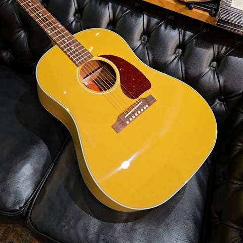 "The Workhorse(頼りになる馬車馬)" の愛称で信頼されるベストセラー・モデル。ウォームな低域とエッジの効いた中高域が織りなす優れた表現力でプレイヤーを支え、どんなときにも信頼できるパートナーとして1942年の登場以来、ギブソン・ラウンド・ショルダー・ラインナップの中心的役割を担い続ける”J-45”。基本的なスタイルは継承されつつもマイナーチェンジを繰り返し、年々進化し続けております。本器はマホガニートップ、TV Yellowカラーを採用した限定モデル"J-45 All Mahogany TV Yellow"。マホガニーボディ、マホガニーネック、ローズウッド指板&ブリッジ、グローバーペグ、MOP指板ドット、べっ甲柄スモールガード、スキャロップド・Xブレイシング、ビンテージサンバーストフィニッシュ、L.R.Baggs Element VTCピックアップ標準装備。Les Paul Juniorなどで馴染みのあるTV Yellowカラーが非常に目を引きます。マホガニートップが生み出す快活な音の立ち上がり、ストローク時のアタック感のある抜けの良い音色もならではの魅力です。可愛らしさと渋さもある良いルックスに仕上がった限定モデルです。