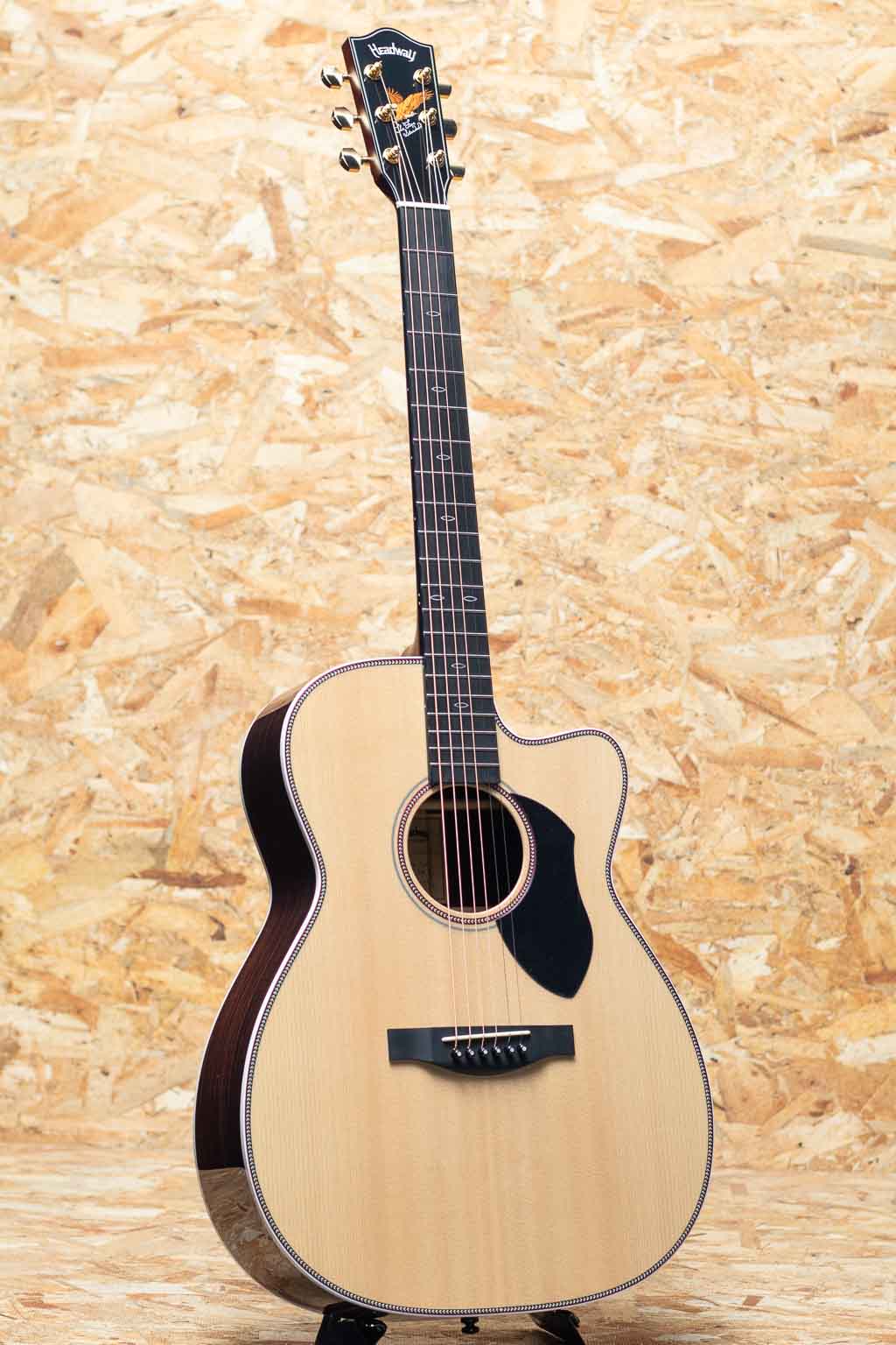 1977年のブランドデビュー以来、多くのアコースティックギターファンやミュージシャンたちに支持されているヘッドウェイギター。本器は531、503などのロングセラーモデルを生み出し、Headwayの定番として長年親しまれてきた500シリーズのサウンドの要となるブレーシングパターンなど基本的な構造はそのままに、現代のプレイヤーにとっての弾きやすさを追求したリニューアルモデル"The Five"シリーズ。ナット幅を43mmから43.5mmに変更し握った際のフィーリングをさらに向上させ、多様化する現代のプレイスタイルに対応できるように変更されています。ポジションマークにはマスタービルダー百瀬氏が自身の製作するモデルで愛用していたマークを採用。ピックガードは『The Five』のために新たにデザインを行い、ヘッドのイーグルインレイも種類の異なる木材を巧みに使用したデザインへ一新されています。こちらはスタンダードシリーズのかねてより要望の多かったカッタウェイモデル"Type C"。スプルーストップ、インディアンローズウッドサイド&バック、マホガニーネック、リッチライト指板&ブリッジ、セミフォワードシフト・スキャロップブレイシング。。小ぶりめなボディにカッタウェイで扱いやすく演奏性の良いサイズです。しっかりとしたボリュームにバランスの取れたサウンドでフィンガースタイルなどで特におすすめな印象です。500シリーズの伝統を受け継ぎ生まれた新たなHeadway―”The Five”シリーズ。ぜひお試しください。