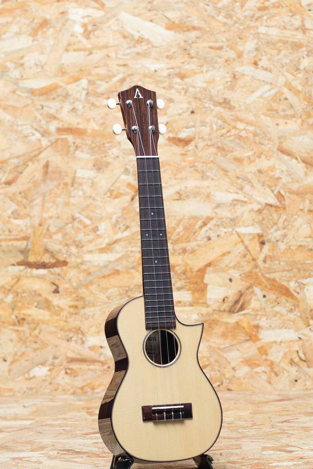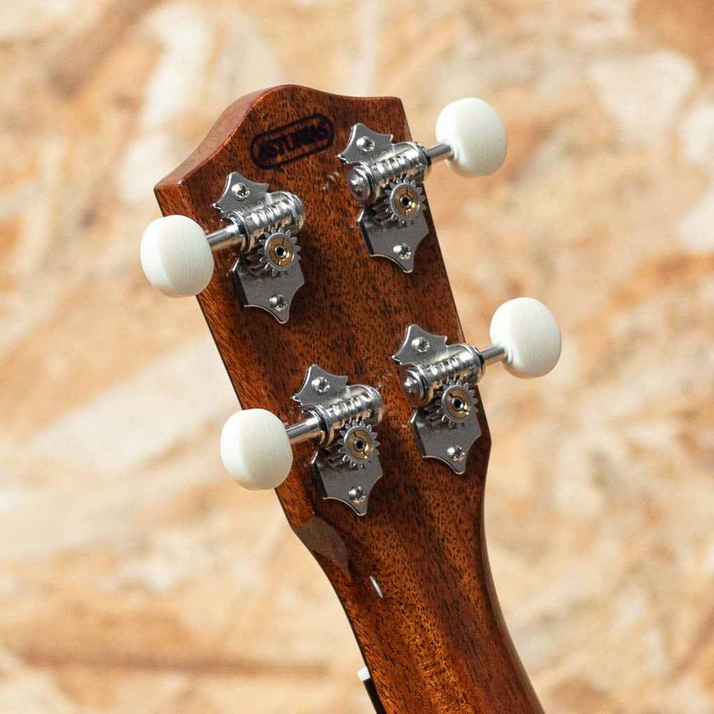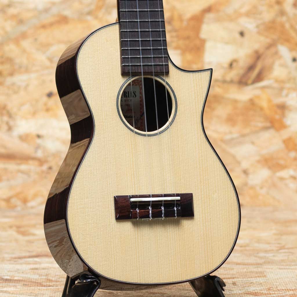 福岡県久留米に工房を構える『ASTURIAS』。1962年に創立され、クラシックギター製作を開始。50年におよぶその技術の結晶は現在15名のクラフトマンによって手掛けられており、現在はウクレレ、アコースティックギター、クラシックギターを制作する日本を代表する弦楽器メーカーの一つとなっています。本器はアストリアスの人気シリーズ”ソロウクレレ”シリーズのスプルーストップ、ローズウッドサイド&バックモデル。ソプラノロングネック、フローレンタインカッタウェイ仕様による演奏性の高さ等、ソロウクレレに最適な仕様です。アストリアスらしい明瞭で抜けの良いトーンを持ち、存在感のある音色が特徴。爽快なサウンドはジャカソロなどにも相性抜群です。テンション感や、ピッチ感も良く、まさにソロウクレレに最適なモデルです。