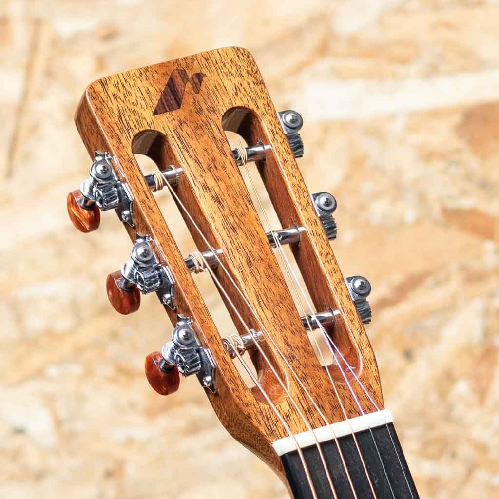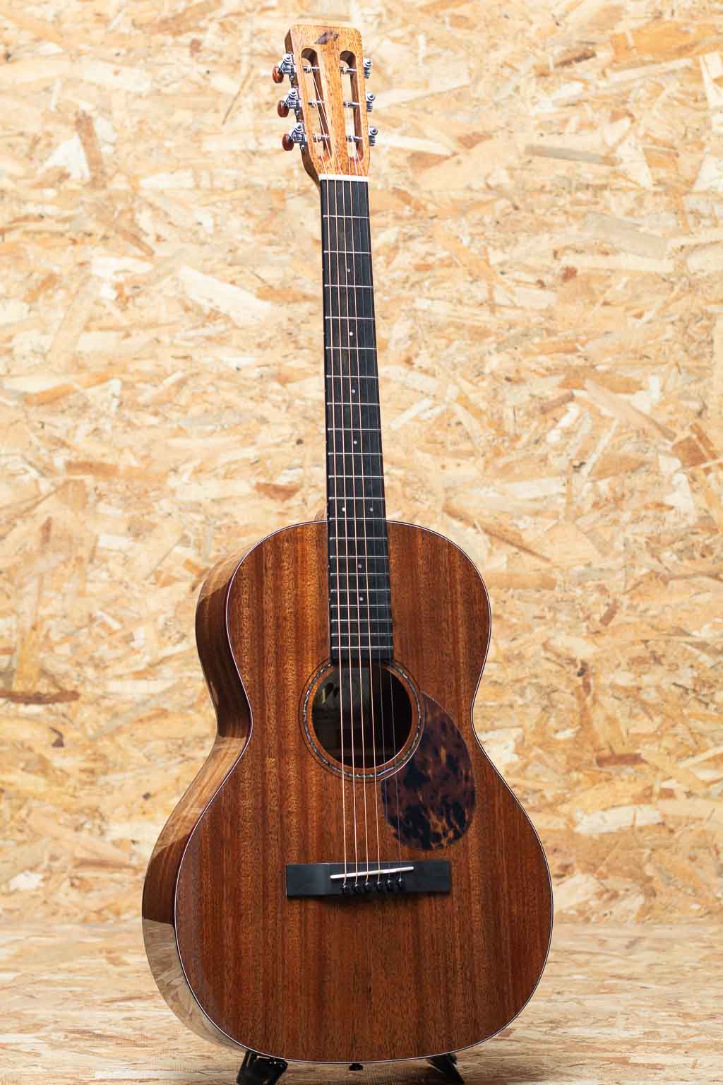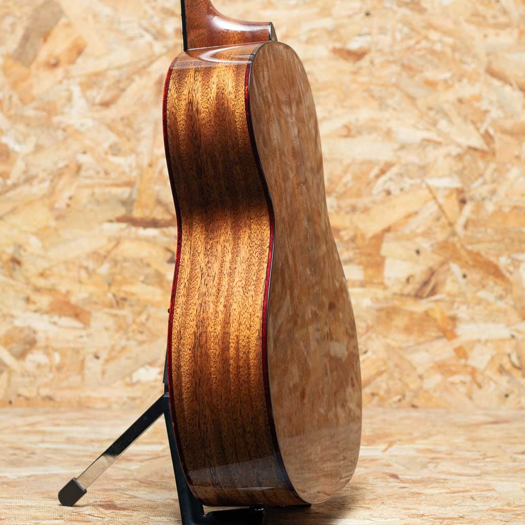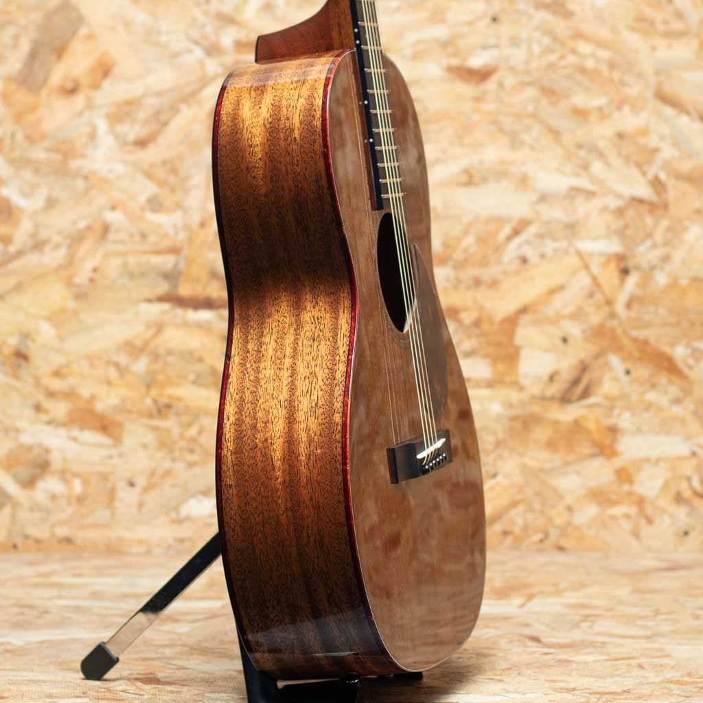 半手エラインにて製造される国産モーリスギターは大人数で製造される面影は現在はなく、各セクション毎に熟練したスタッフによって製造されています。オールマホガニーボディーに12fジョイント、スロテッドヘッドのニューヨーカースタイル。マホガニーボディーはべっ甲柄バインディングで装飾、マホガニーネック、エボニー指板、エボニーストレートブリッジ、ナット幅45mmのワイドナット仕様で630mmのショートスケール。柔らかなテンション感で操作性も良好です。ニューヨーカースタイルならではの奥行きや深みを感じながらもコンパクトなボディーサイズで扱いやすく甘くオーガニックなトーンが魅力のモデルです。リラックスして爪弾いて心地よい響きを楽しめるギター。オリジナルハードケース付属。
