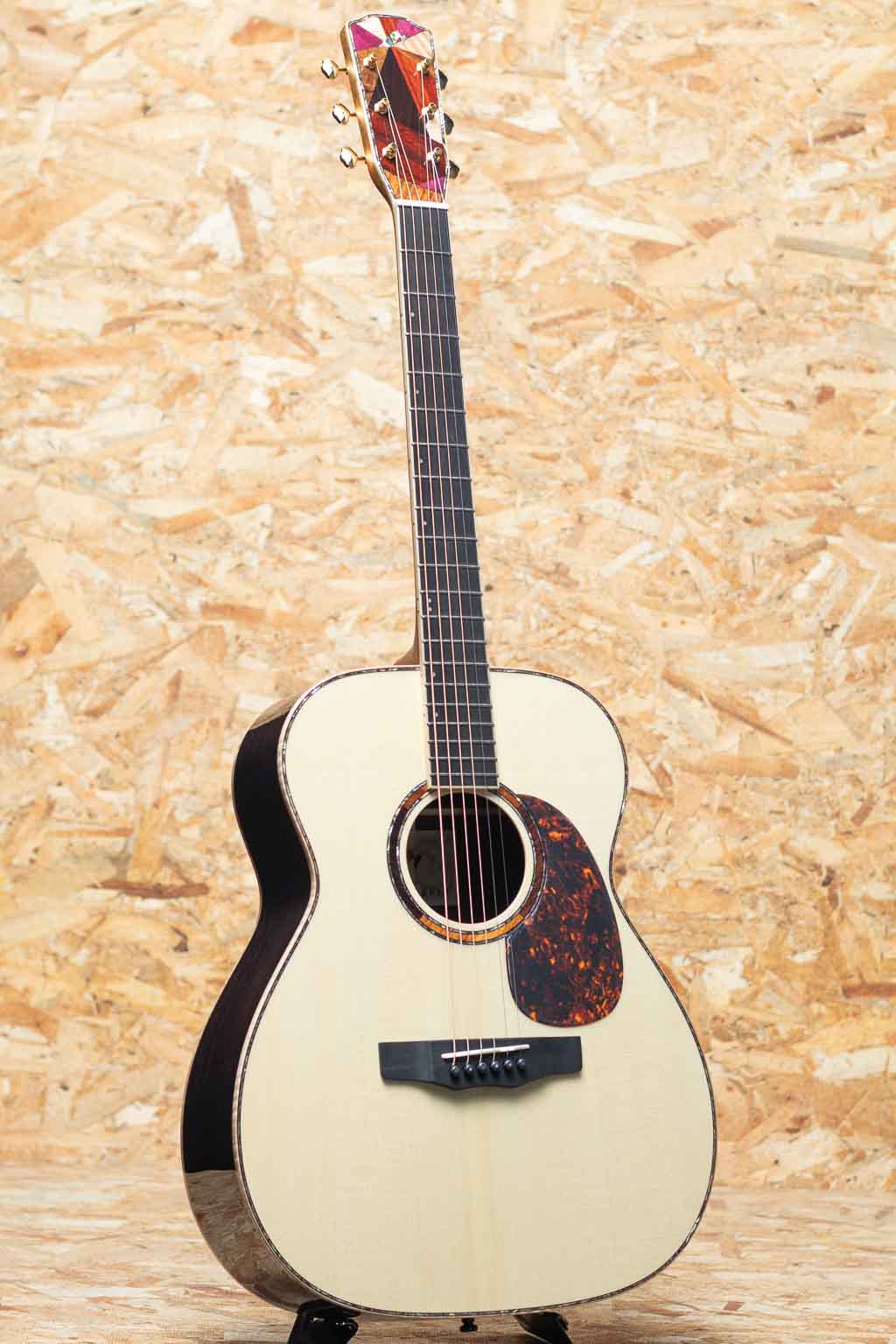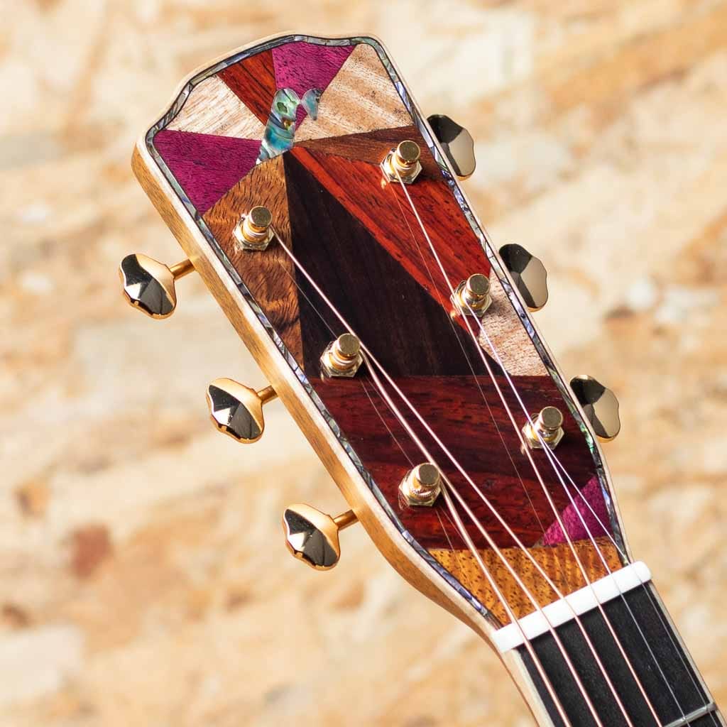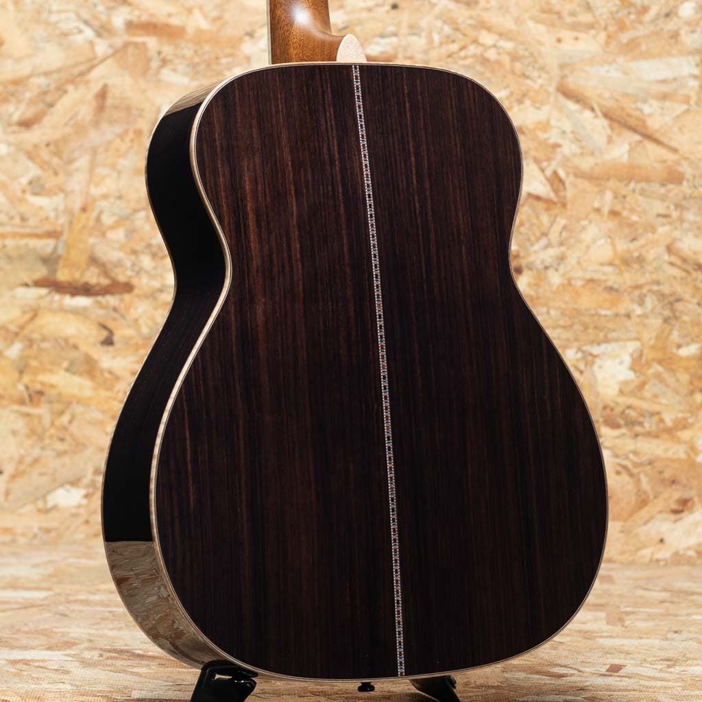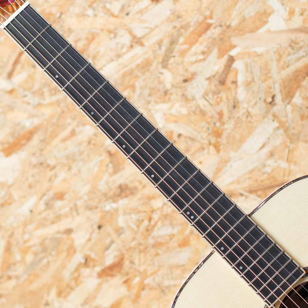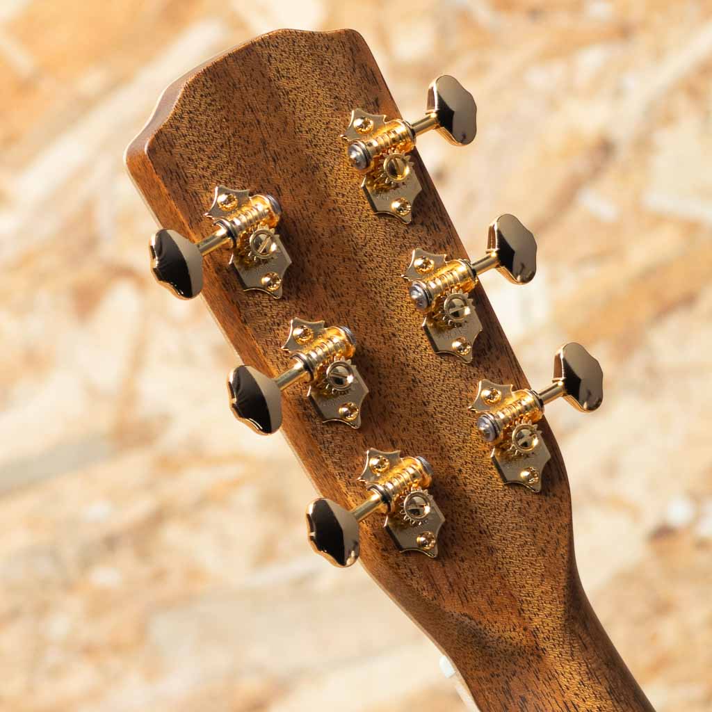 長野県松本市に工場を構えるモーリスギターは、国内を代表する老舗ブランドのひとつ。手エラインにて製造される国産モーリスギターは大人数で製造される面影は現在はなく、各セクション毎に熟練したスタッフによって製造されています。本器は"サウンドメッセ2025"にて出展された限定モデル"F-101 III SPZ/LTD"。小ぶりでバランスの良いオーケストラ・ボディを特徴とするFシリーズをベースとした特別仕様で、ヘッドの天神板には、ローズウッド、マホガニー、ハカランダなどの銘木を使用し、モーリス工場の熟練職人が1本ずつランダムにデザインを施した唯一無二の限定モデルとなっています。イングルマンスプルーストップ。厳選したインディアンローズウッドサイド&バック、マホガニーネック、エボニー指板&ブリッジ。アバロントリム、ロゼッタにもローズウッドとコア材の組み合わせとアバロンが施されており、高級感のあるルックスとなっています。小ぶりで抱えやすいボディながら深みのあるしっかりとしたボリュームで、ピックストロークで求めたい迫力や広がり、フィンガー弾きに求めたいレスポンスと繊細さのあるサウンドを両立した秀逸なバランスが魅力で幅広いスタイルでお使いいただけます。同じデザインが存在しない、全12本の希少なコレクターズアイテムです。