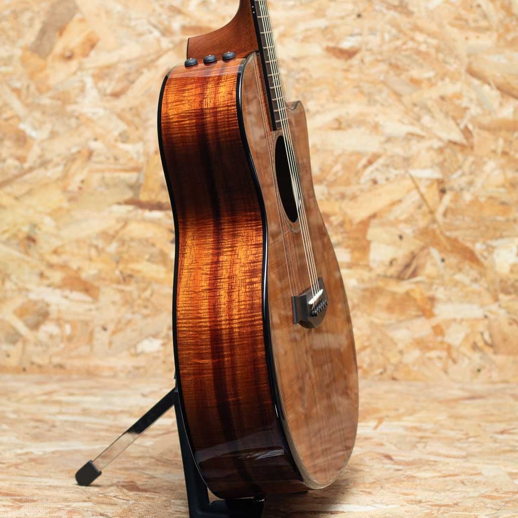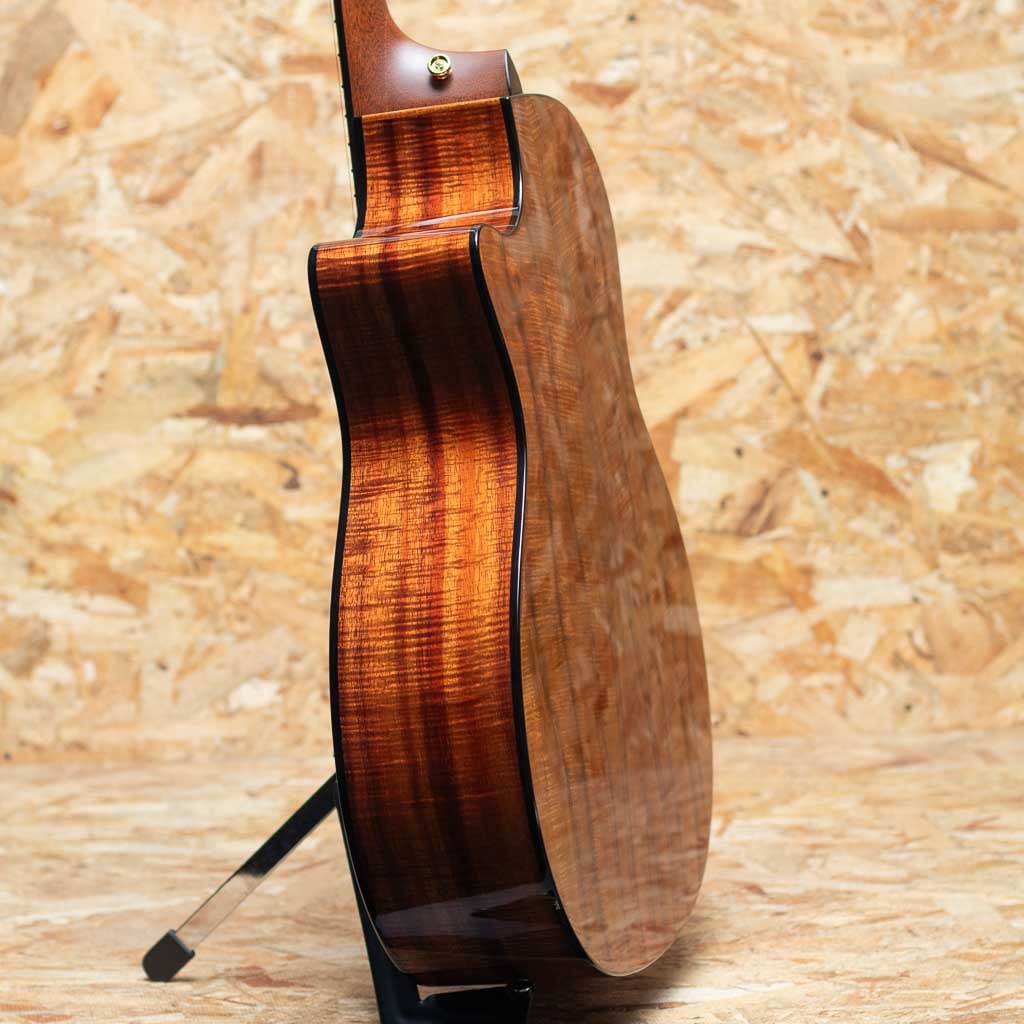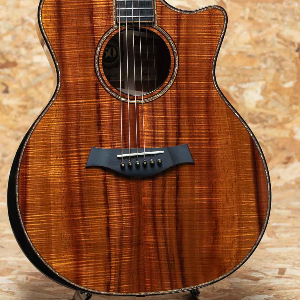 1974年にボブ・テイラーとカート・リスタグの2人によって創立されたテイラー・ギター。革新的なアイデアと高い技術力、ハイセンスなマーケティングで2000年代より急速に成長し、今や世界のトップアコースティックブランドに成長したテイラー社。国内をはじめ特に米国ではプロミュージシャン使用のシェアが高く、圧倒的な人気を誇るブランドです。本器はテイラー・ギターズ創設50周年を記念したモデル”50th Anniversary 924ce-K LTD”。ボディには美しい杢のAAグレードハワイアンコアが使用されています。マホガニーネック、エボニー指板&ブリッジ、ゴトー製彫刻入りペグ、アームレスト付き、V-Classブレーシング、ES2ピックアップ搭載。ゴールドのアクリルドット入りブリッジピン、ボディー内部には50周年記念ラベルなど50周年を飾るにふさわしいゴージャスな仕様です。ブライトさと聞こえのよいミッドローとバランスの取れたサウンド。弾き込むほど、より豊かで甘く、響きの良いトーンが得られます。搭載のES2ピックアップはライン出力時にもリアルなアコースティックサウンドを奏でます。またこちらはアコースティックギターアンプ”CIRCA 74”が一緒に付属している特別セットとなっています。ボディ・スタンドもハワイアンコアが使用されており、ギターとマッチした良いルックスで弾いて良し、インテリアとしても良しのラグジュアリーな1台です。