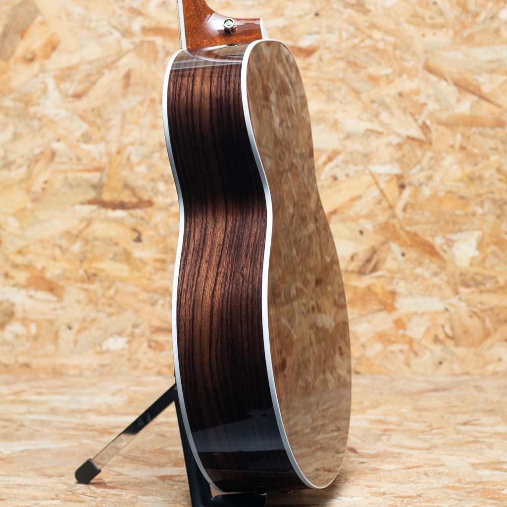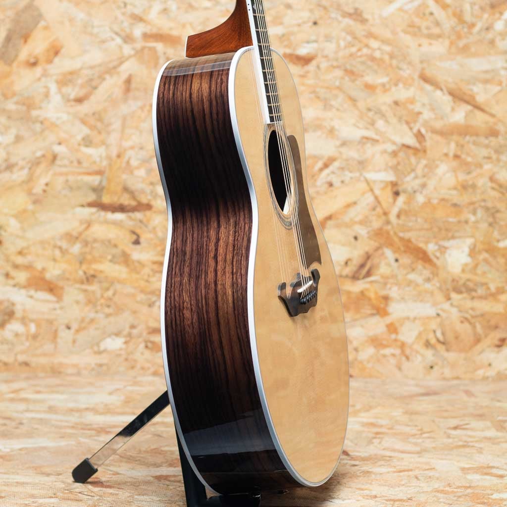1974年にボブ・テイラーとカート・リスタグの2人によって創立されたテイラー・ギター。革新的なアイデアと高い技術力、ハイセンスなマーケティングで2000年代より急速に成長し、今や世界のトップアコースティックブランドに成長したテイラー社。国内をはじめ特に米国ではプロミュージシャン使用のシェアが高く、圧倒的な人気を誇るブランドです。こちらは半世紀に渡り革新を遂げてきたテイラーギターを記念した新しいモデル”レガシー・コレクション”。初期のテイラーを象徴する800シリーズ3機種とボブ・テイラーの象徴的なグランドオーディトリアムにも敬意を表し、長年愛されてきたシダートップモデル2種類が発売されました。本器は800シリーズのジャンボボディモデル”Legacy 815e”。シトカスプルーストップ、インディアンローズウッドサイド&バック、マホガニーネック、エボニー指板&ブリッジ。ブレイシングは90年代から2000年代にかけてボブが使用していた伝統的なXブレイシングパターンが採用されています。ヘッドはレモングローブ時代を彷彿とさせるストレートイヤー・ペグヘッドのシェイプが採用されています。ジャンボボディならではのパワフルなボリュームで迫力のある低音にキレの良い中高音域。かき鳴らしたくなる気持ちの良いレスポンスとサウンド。初期のテイラーにインスパイアされており、ピックアップはオリジナルのシステムではなくL.R.Baggs社のElement VTCピックアップが搭載されております。伝統的なスタイルと現代思考を兼ね備えたレガシーモデルぜひご体感下さい。各モデルの最初の100本には、Taylor Guitars創始者のBob Taylor氏とKurt Listug氏のサインがラベルに記載されています。