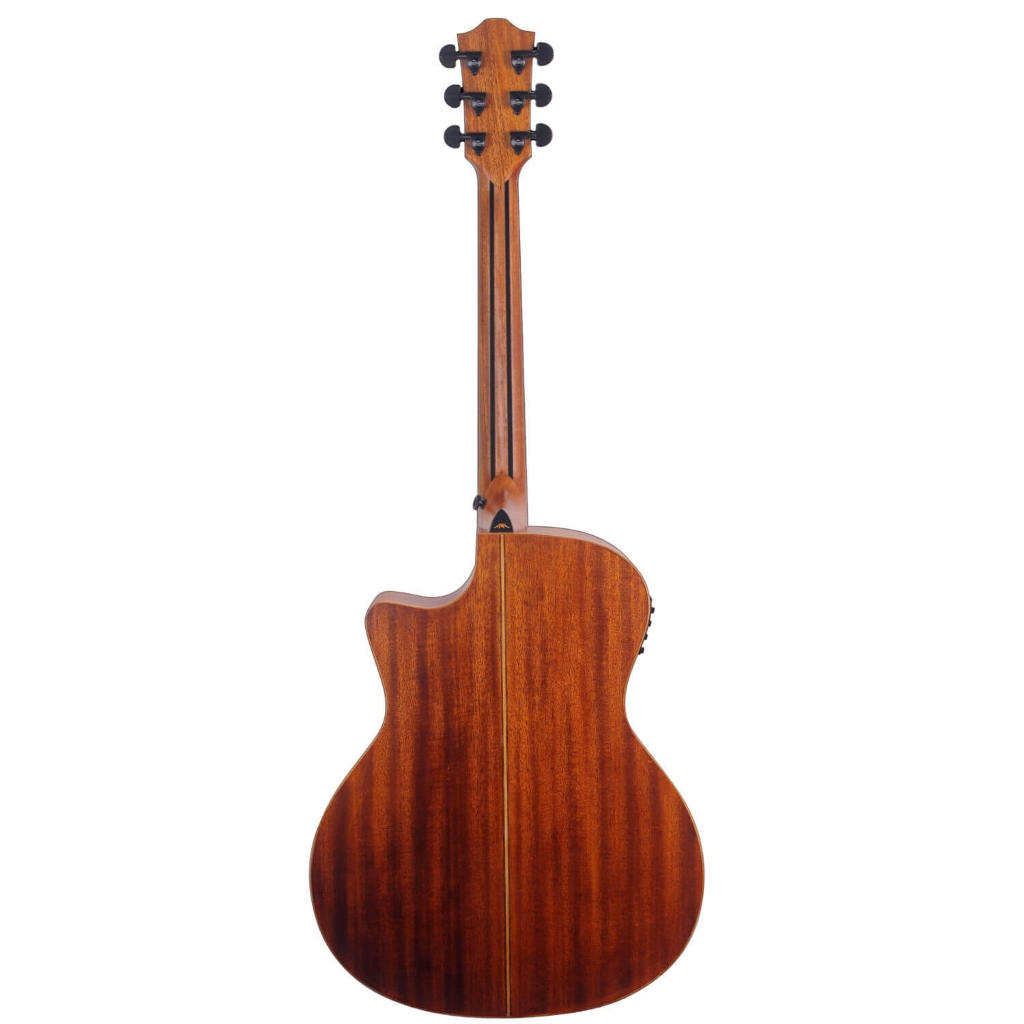 ソリッドシトカスプルース・トップと厳選されたマホガニー合板のバック&サイドを組み合わせています。シトカスプルースは、その明瞭でクリアな音色と魅力的なサスティーンを持ち、マホガニーバック&サイドの暖かさとふくよかさ、そして革新的なToneFlowブレーシングシステムとオーディトリアムシェイプがよりふくよかな低音と歯切れの良いサウンドを高め、クリアな高音よく通る中音、そして暖かな低音を奏でます。オリジナルデザインのブリッジ、アバロンを使用したイーグルアイポジションインレイ、アマラエボニーを丁寧に組み合わせて制作された、ロープデザインのロゼッタが力強く上品な見た目を演出しています。カッタウェイを搭載しハイフレットでのプレイアビリティを向上させ、Bromoオリジナルのピックアップシステムを搭載。幅広い現場で活躍できるモデルです。