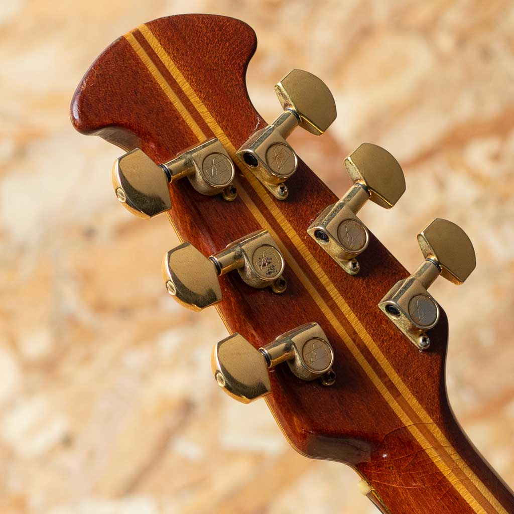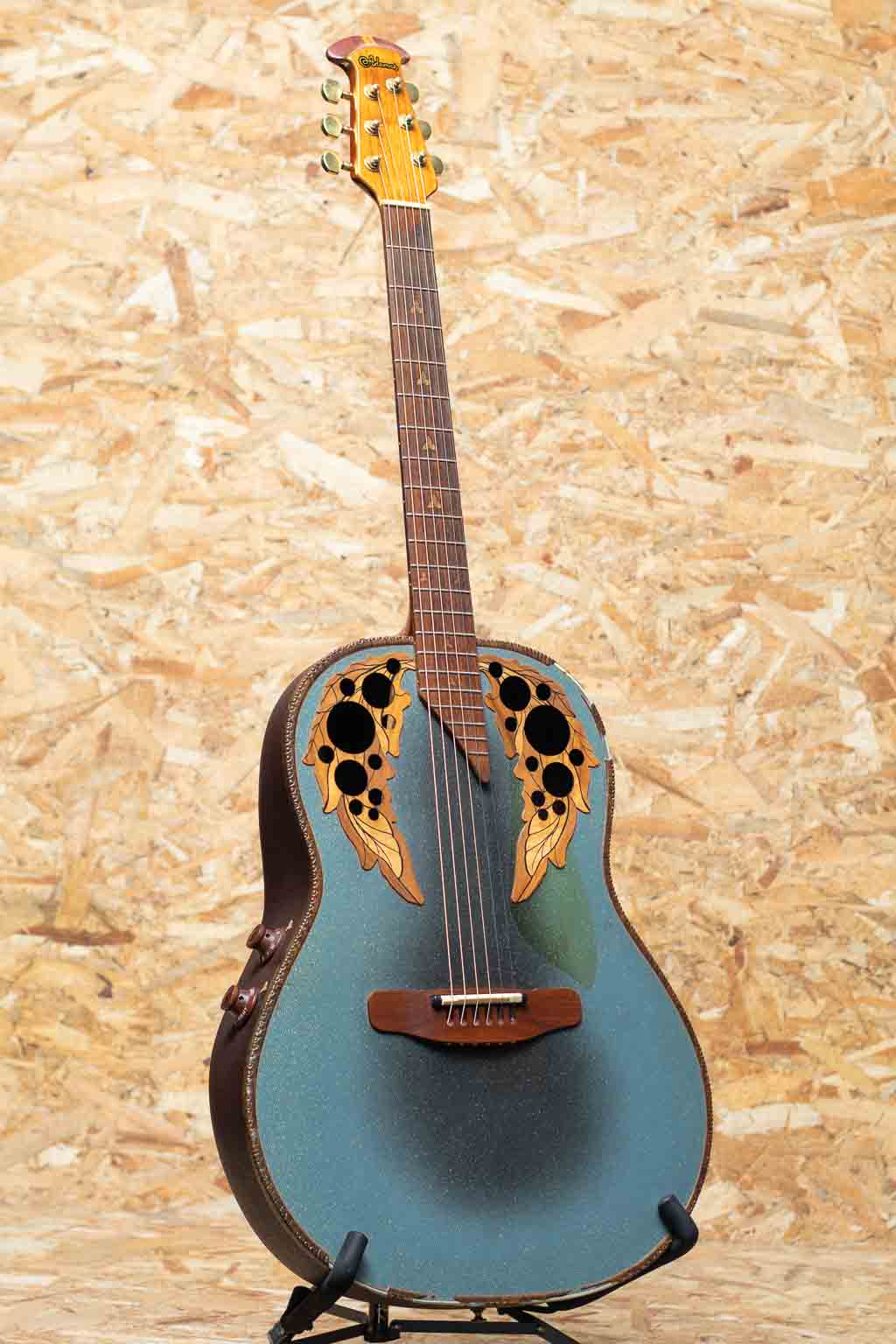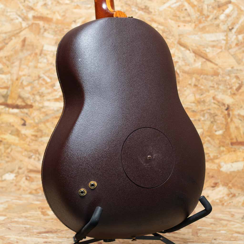 1966年、ヘリコプターの製造会社の社長であり、有名なギタリストでもあったチャールズ・カーマンによって設立されたオベーションは航空機の技術をギターに活かしたエレクトリックアコースティックギターを発売。保守的なミュージシャンにも受け入れられ、エレアコの代名詞的ブランドへと成長します。1976年の誕生から現在まで、世界のミュージックシーンにおいて際立つパフォーマンスを実証し続けてきた同社を代表するモデル"アダマス"。そのかつてのアダマスへの評価と人気は今も衰えることがありません。本器は1980年製の最初期アダマスII。ウッドトップの約三分の一の薄さで十分な強度を得られるアダマス独自のカーボングラファイトトップ、ディープボウルリラコード樹脂ボウル、マホガニーネック、ウォルナット指板&ブリッジ、オリジナルシャーラーペグ、マルチプルエポレットサウンドホール。深みのある野太い響きとハイレスポンスでコンプ感の効いたアダマスならではの独特な音色。ステレオアウト仕様のワンボリューム/ワントーンのオリジナルピックアップ搭載。シンプルな回路からは現行品には無い音の太さが生まれます。ボディバインディングは満遍なく欠損が見られ、傷等相応の使用感は感じられる状態です。低めのセッティングで演奏性は良好です。流通も少なくなった最初期のアダマス2。オリジナルハードケースが付属です。