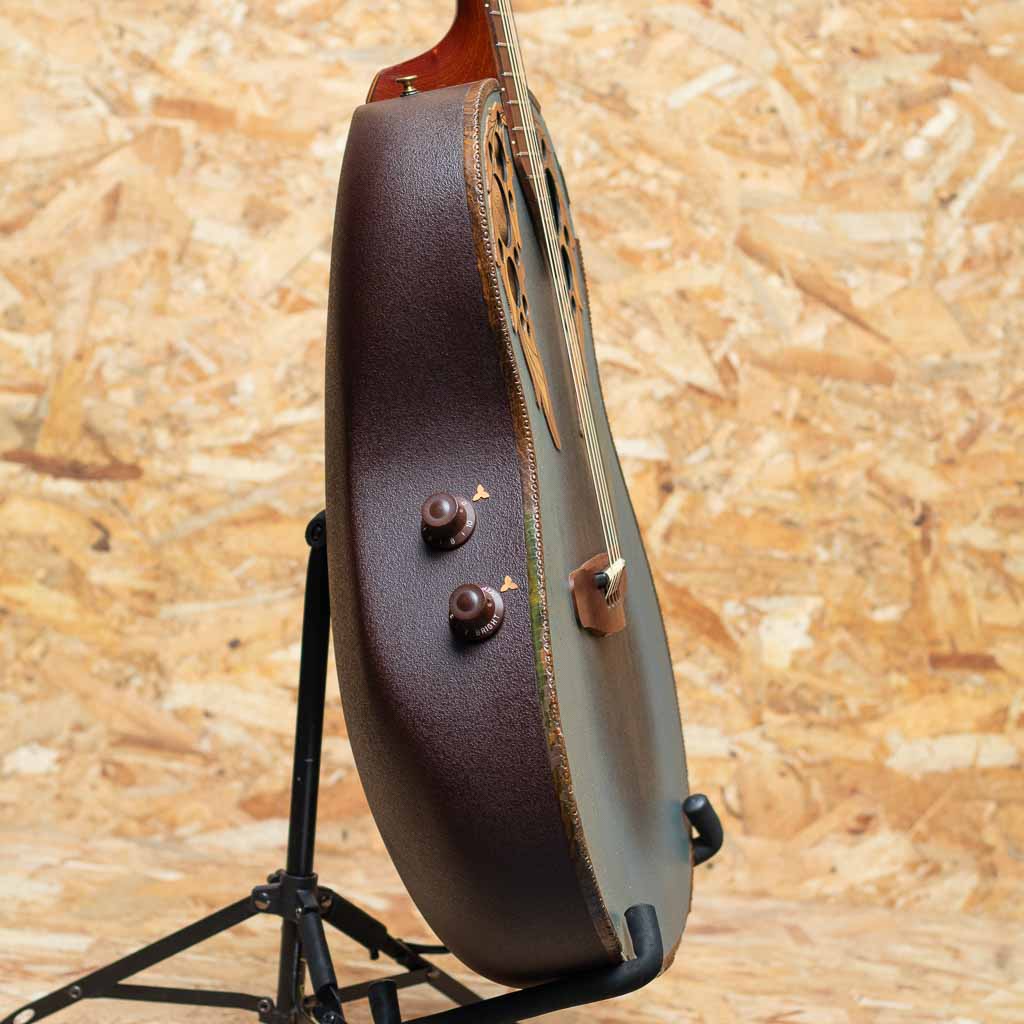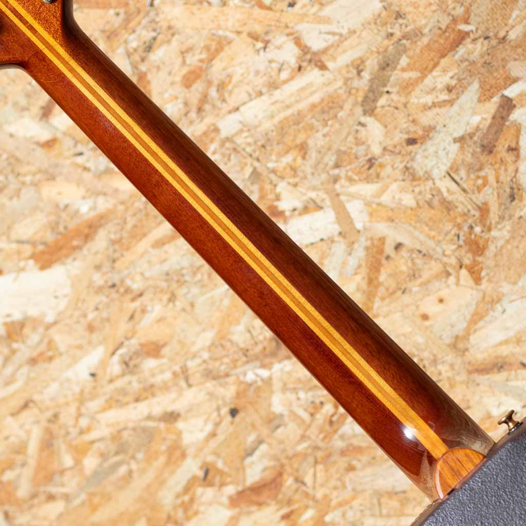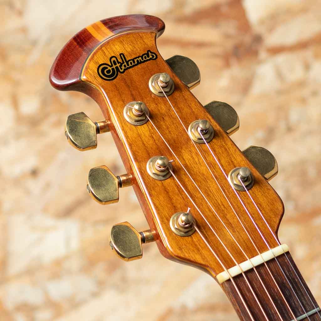 1966年、ヘリコプターの製造会社の社長であり、有名なギタリストでもあったチャールズ・カーマンによって設立されたオベーションは航空機の技術をギターに活かしたエレクトリックアコースティックギターを発売。保守的なミュージシャンにも受け入れられ、エレアコの代名詞的ブランドへと成長します。1976年の誕生から現在まで、世界のミュージックシーンにおいて際立つパフォーマンスを実証し続けてきた同社を代表するモデル"アダマス"。そのかつてのアダマスへの評価と人気は今も衰えることがありません。本器は1980年製の最初期アダマスII。ウッドトップの約三分の一の薄さで十分な強度を得られるアダマス独自のカーボングラファイトトップ、ディープボウルリラコード樹脂ボウル、マホガニーネック、ウォルナット指板&ブリッジ、オリジナルシャーラーペグ、マルチプルエポレットサウンドホール。深みのある野太い響きとハイレスポンスでコンプ感の効いたアダマスならではの独特な音色。ステレオアウト仕様のワンボリューム/ワントーンのオリジナルピックアップ搭載。シンプルな回路からは現行品には無い音の太さが生まれます。ボディバインディングは満遍なく欠損が見られ、傷等相応の使用感は感じられる状態です。低めのセッティングで演奏性は良好です。流通も少なくなった最初期のアダマス2。オリジナルハードケースが付属です。