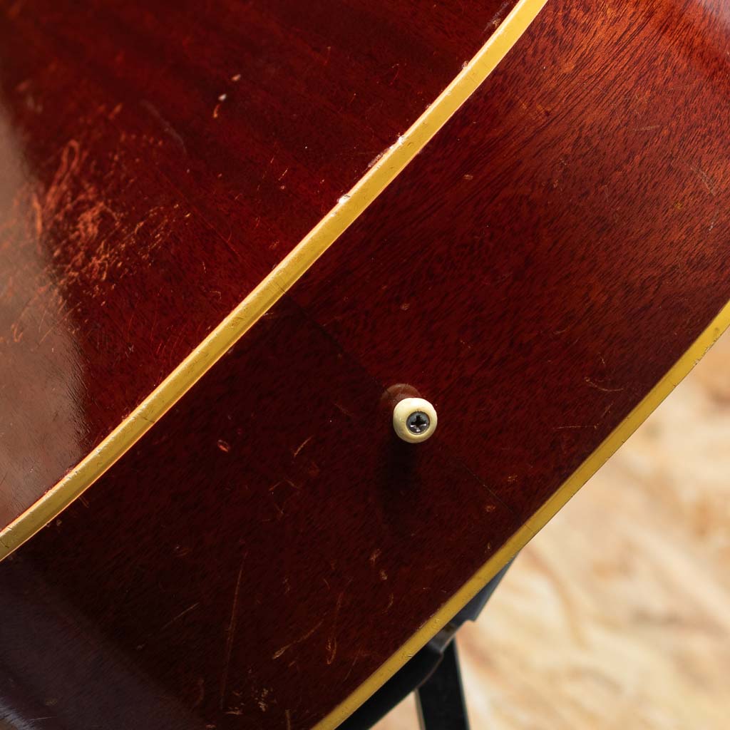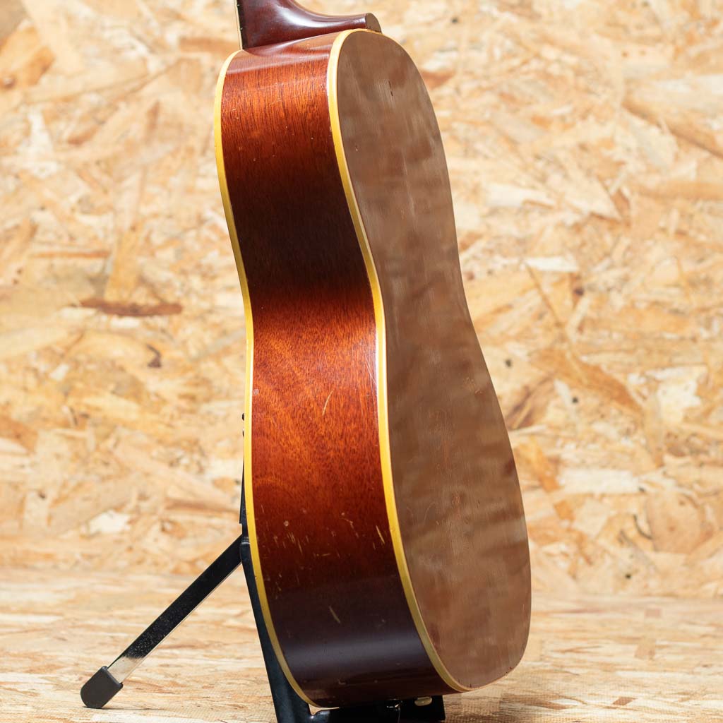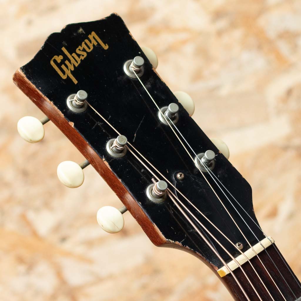 J45と同じ時期に生産が始められたLGシリーズ。”B25”はLG2およびLG3から名前を変え、1962年より生産を開始したモデルです。本器は1966年製Vintage品。スプルーストップ、マホガニーサイド&バック、マホガニーネック、ハカランダ指板、プラスチックブリッジ、アジャスタブルサドル、オリジナル2ラインロゴクルーソンペグ、塗り込みのオリジナルラージセルピックガード、ナチュラルカラー。J45より小ぶりなボディは抱えやすいサイズ感。1960年代前半のギブソンの最大の特徴である薄いネックをまだ引き継いだやや薄目の握りやすいネック、プラスティックブリッジ期特有の特にコンプ感の強い音色と軽やかに膨らむ音立ち。弾けばたちまち経年を感じさせる”枯れた鳴り”を響かせます。アジャスタブルサドル特有のパーカッシブなサウンドもあり、低音もしっかり感じバッキング等にも難なく対応。なんといってもこのサイズ感、フィット感は当モデルならではです。ブリッジのスタッドはいっぱいまで下げられている状態ですが、現在は標準的な弦高設定でプラスチックブリッジの変形も軽微です。サウンドホール内部、バック面に油性マジックの手書きにて”SR” ”382068” ”1956” ”B25” TR” と記入がされている他、経年相応の傷や金属パーツのくすみなどの使用感は多くございますが、割れなどの大きなダメージはございません。ウェザーチェックによる味のある貫禄も出てきており、上記理由からお手に取りやすい価格での出品です。汎用ハードケースが付属いたします。