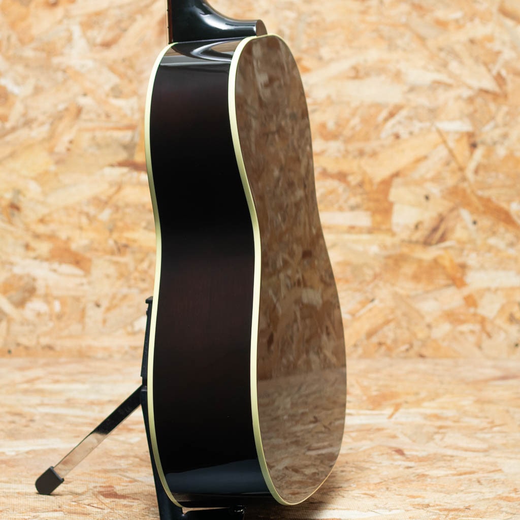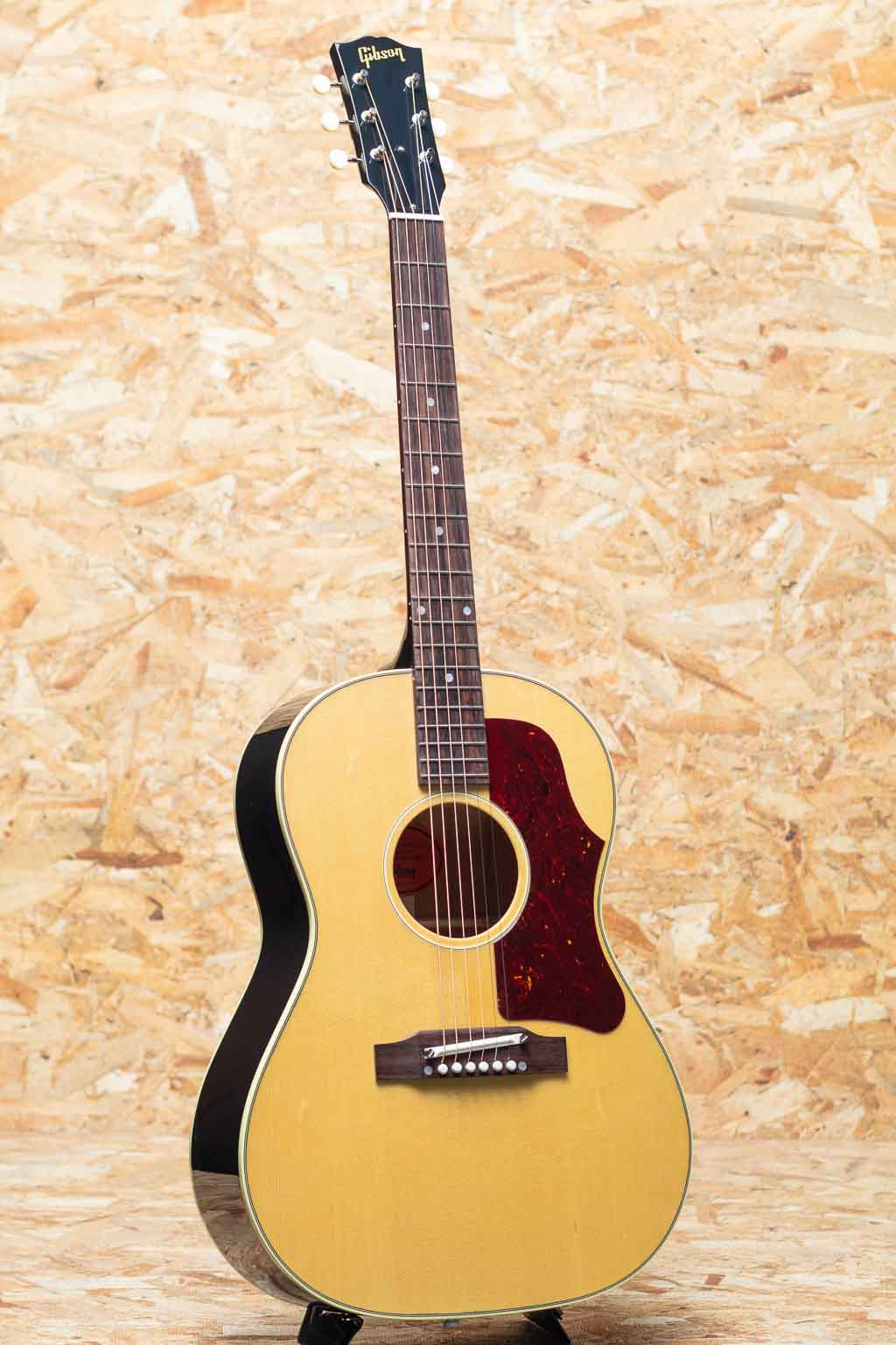 1942年よりJ-45と共に産声をあげ、J-45を14 1/8インチまでダウンサイジングした定番モデル”LG-2”。62年頃にはマイナーチェンジモデルとして”B-25”が登場しました。大きな違いとしてはADJサドルの採用、ラージガードが挙げられます。LGと共にスモールギブソンを代表する機種です。本機は1960年代のスペックをインスパイア、”B-25 ADJ AN”弊社オーダーモデルの1本。スプルーストップ、マホガニーサイド&バック、ローズウッド指板&ブリッジ、べっこう柄ラージピックガード、アジャスタブルサドル、43.8mmナット幅のレギュラーネック仕様。取り回しの良いサイズ感。ガランとした空気感の強いサウンド、金属的な高音と立ち上がりの鋭さ、切れ味の良い響きはアジャスタブルサドルならではの音色です。肩肘張らずにリビングでラフに弾ける1本としても、小柄な方が圧迫感なく弾けるギターとしても重宝する1本。オリジナルハードケース付属。