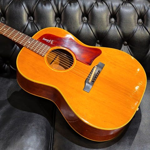 ギブソンスモールボディの中でも、固定的な人気を誇る"B-25"。LG-2とLG-3の後継機種にあたる本モデルは、1940年代より流通していたLGシリーズがマイナーチェンジされ、1962年にはモデル名が変わって生まれ変わり誕生。ナチュラルカラーのB-25は1963年より製造が開始されました。本器は1969年製のVintage品。シリアルでは66or69年で、ブリッジはプラスチックブリッジですが、ラージメイプルブリッジプレートやロゴ入りラージピックガードの仕様から69年製のイレギュラースペックと思われます。スプルーストップ、マホガニーサイド&バック、マホガニーネック、ハカランダ指板、プラスチックブリッジ。ペグは近年の同タイプのものに交換が行われております。ナット幅約40ミリネック、ヘッド角14度、ノンスキャロップブレイシング。プラスチックブリッジの柔らかく抱擁感のあるサウンドは前後のウッドブリッジ期のものと一味違ったサウンド野太い低音と、枯れきった材ならではのボリューム感や深みを感じられます。全体的にウェザーチェック、傷・打痕等ビンテージらしい良い風合いで、木部の割れは見られず、プレイコンディションも良好な良いコンディションの個体です。ナローネックで握りやすく、手の小さな方やエレキプレイヤーにもおすすめ。小ぶりなボディで扱いやすいスモールボディの名器。ハードケース付属です。