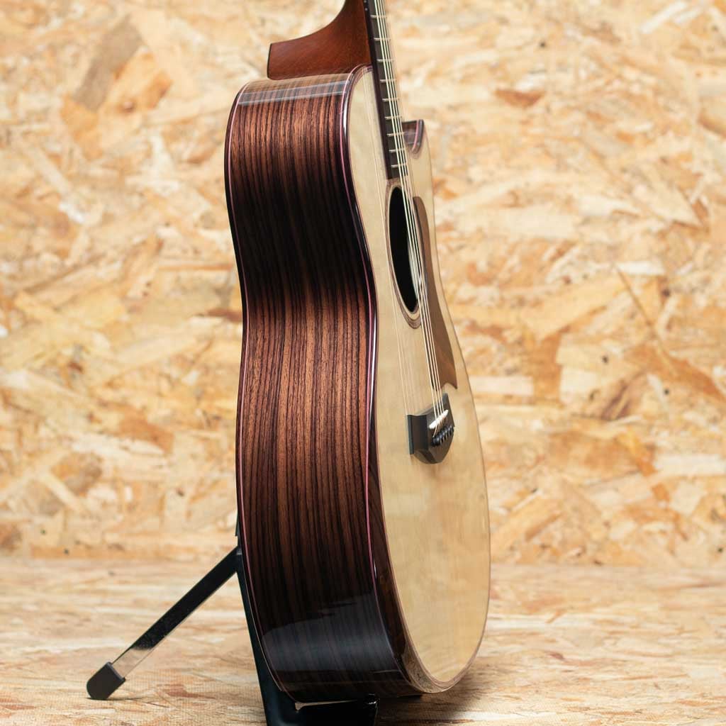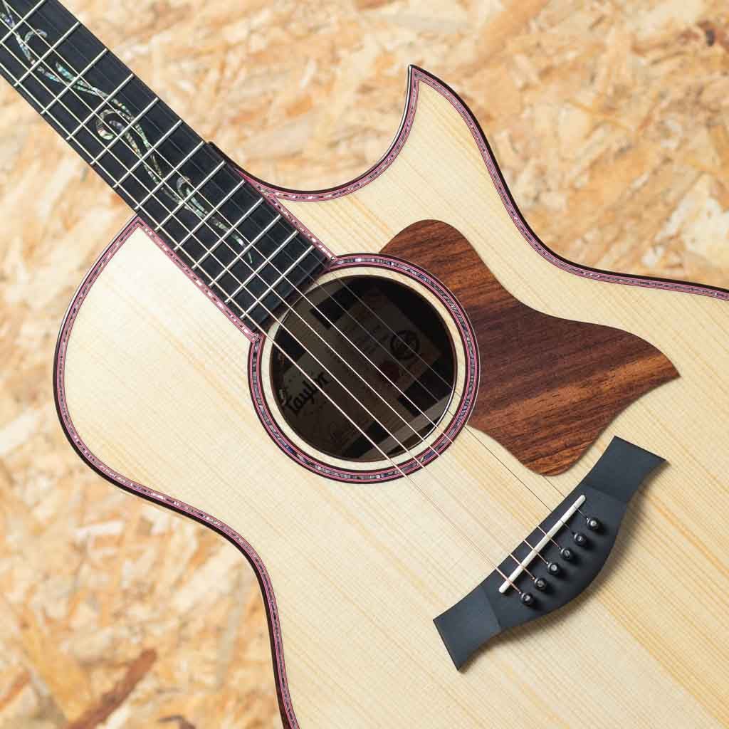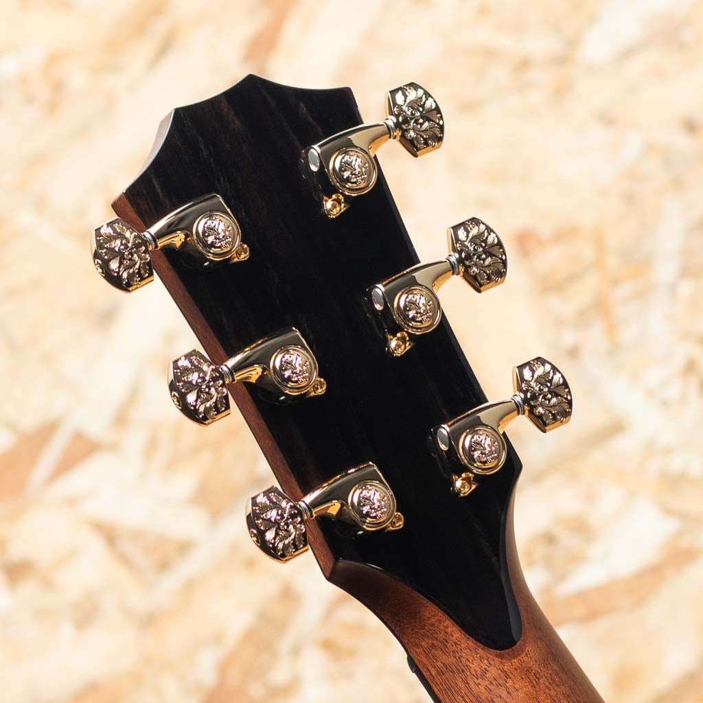 2000年代より急速に成長し画期的なギター構造を採用した事によって世界のトップアコースティックブランドに成長したテイラー社。国内をはじめ特に米国ではプロミュージシャン使用のシェアが高く、圧倒的な人気を誇っています。本器は2025年カスタムギター選定会”Taylor Catch Event”にて発表されたカスタムモデル。グランドオーディトリアムボディ、アディロンダックスプルーストップ、ローズウッドサイド&バック、マホガニーネック、エボニー指板&ブリッジ、ベベルコンター、V-Classブレーシング、LR Baggs Element VTCピックアップ搭載。パウア貝を使用した指板のSpring Vineインレイ、トリム、ロゼッタにアバロン入りのブリッジピンやマザーオブパールTaylorロゴに対し、バインディングとピックガード、V字型の大型ローズウッド製テールストリップ、ベベル加工されたアームレストにはローズウッドを合わせており、煌びやかなながらも落ち着きのある高級感を演出しています。特別な1本をお求めの方に是非とも手にしていただきたい1本。世界10本のみの限定生産モデルです。