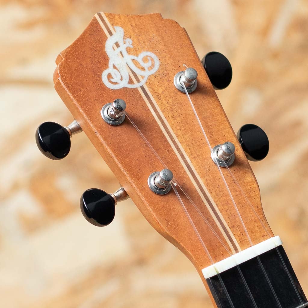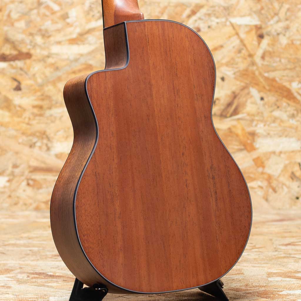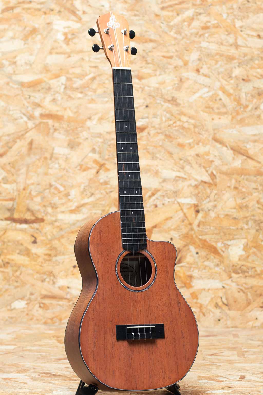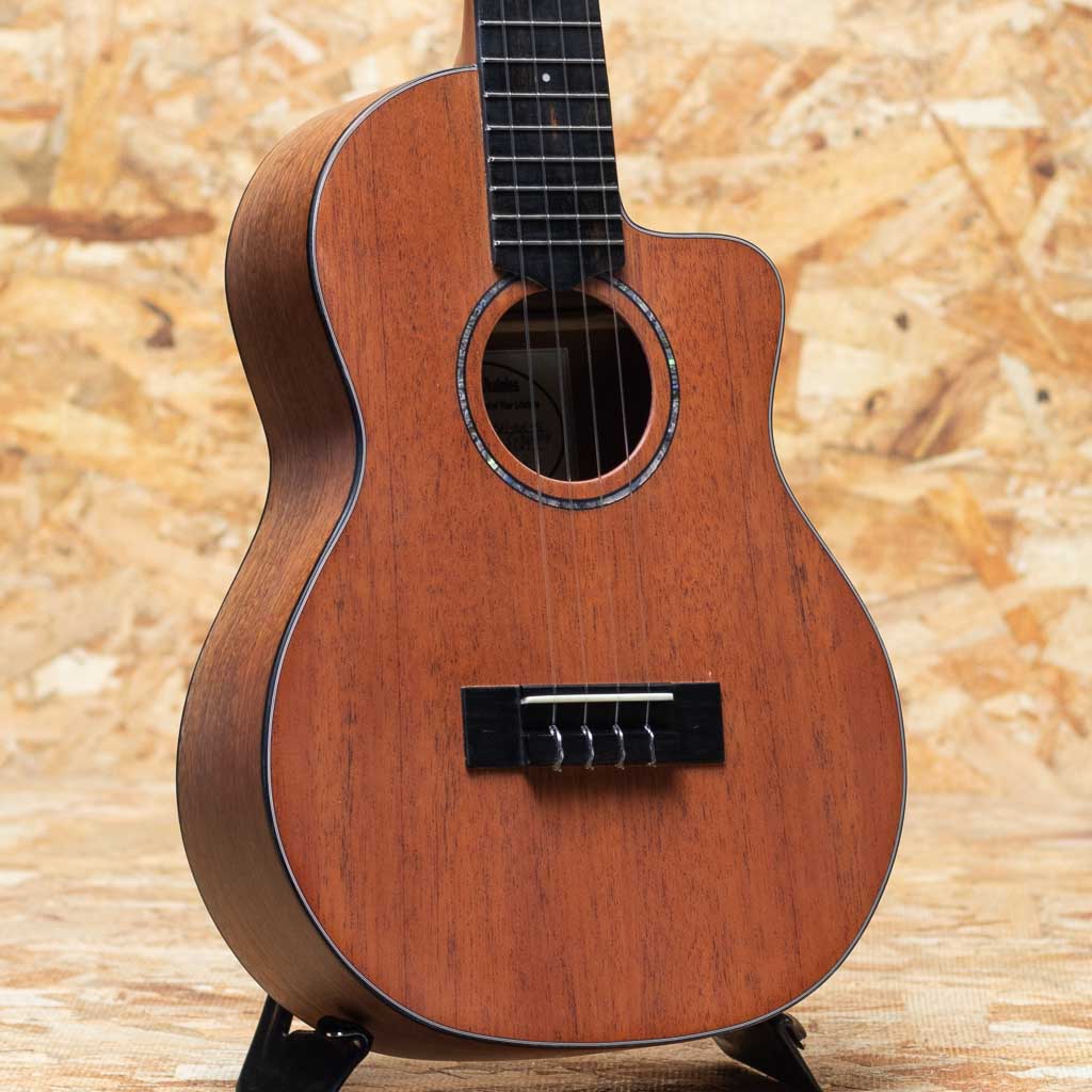 本器はマホガニー材を用いた艶消し仕上げ、カッタウェイ仕様のバリトンモデル。マホガニーネック、エボニー指板&ブリッジ、アバロンロゼッタ。4弦D、3弦G、2弦B、1弦Eのチューニング。深い響きで、しっかりと低域を支えてくれます。アンサンブルに1本あるだけでずいぶんと雰囲気が変わると思います。本格的なバリトンウクレレをお探しの方におすすめです。